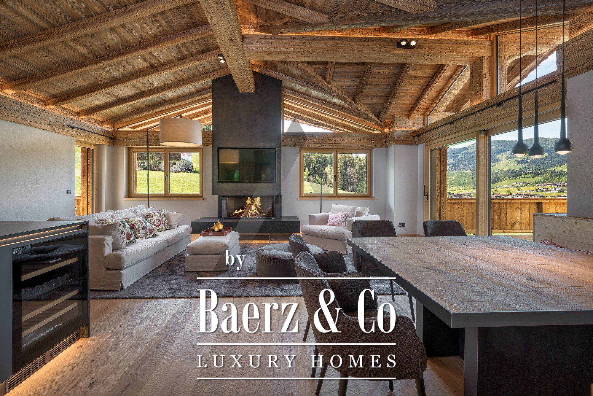 These 6 luxurious chalets have been built in a traditional Tirolean country house style with modern and high-end features. The chalet ensemble is in a quiet and slightly elevated panorama location in Kirchberg in Tirol. This particular chalet offers great views of Kirchberg, Brixtental and Gaisberg.