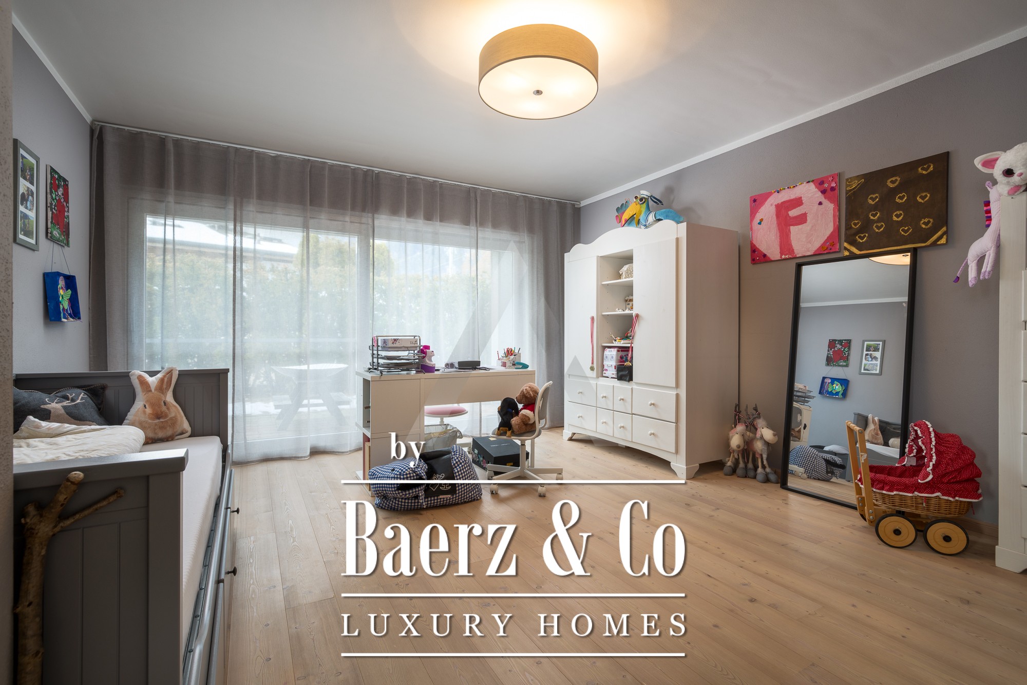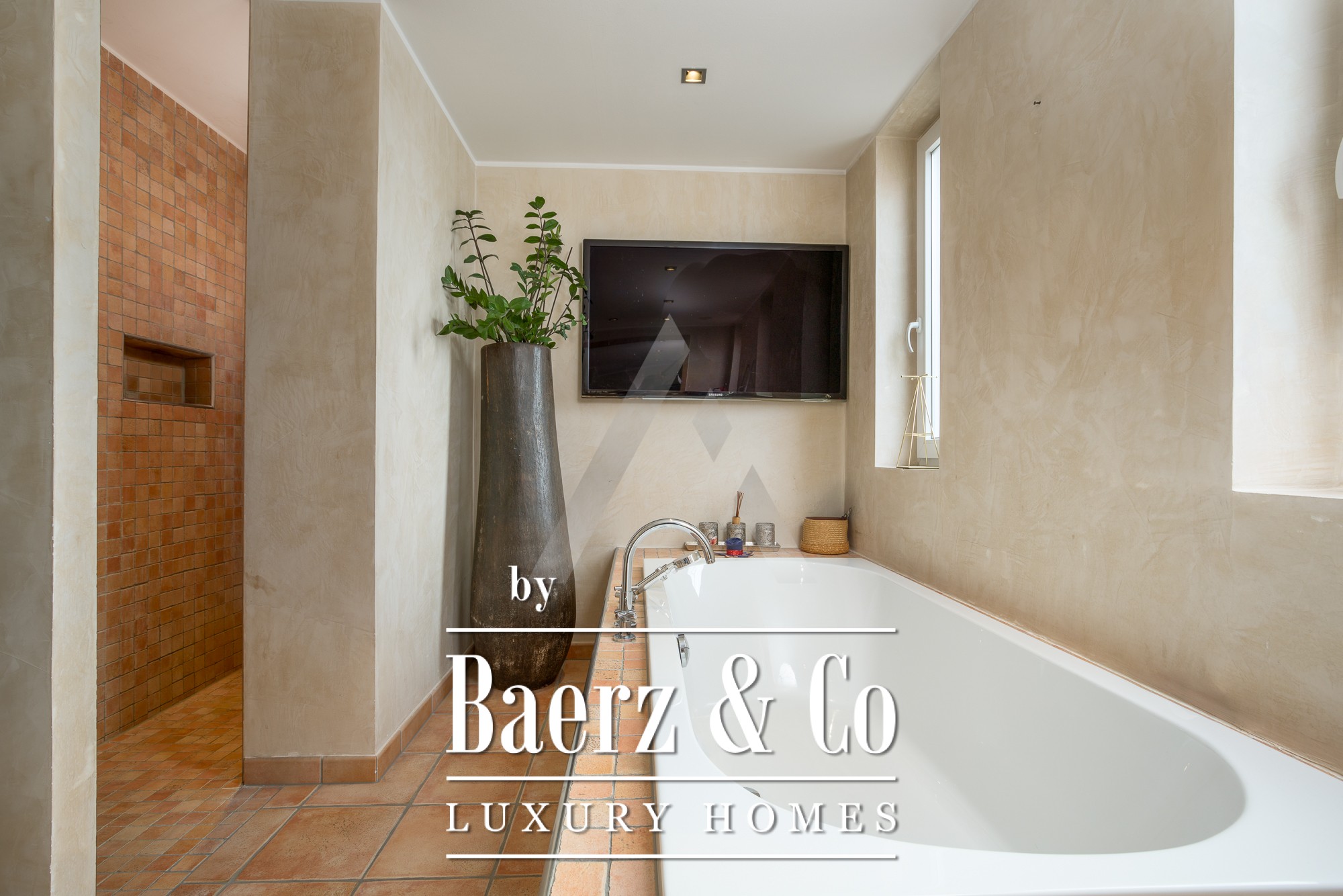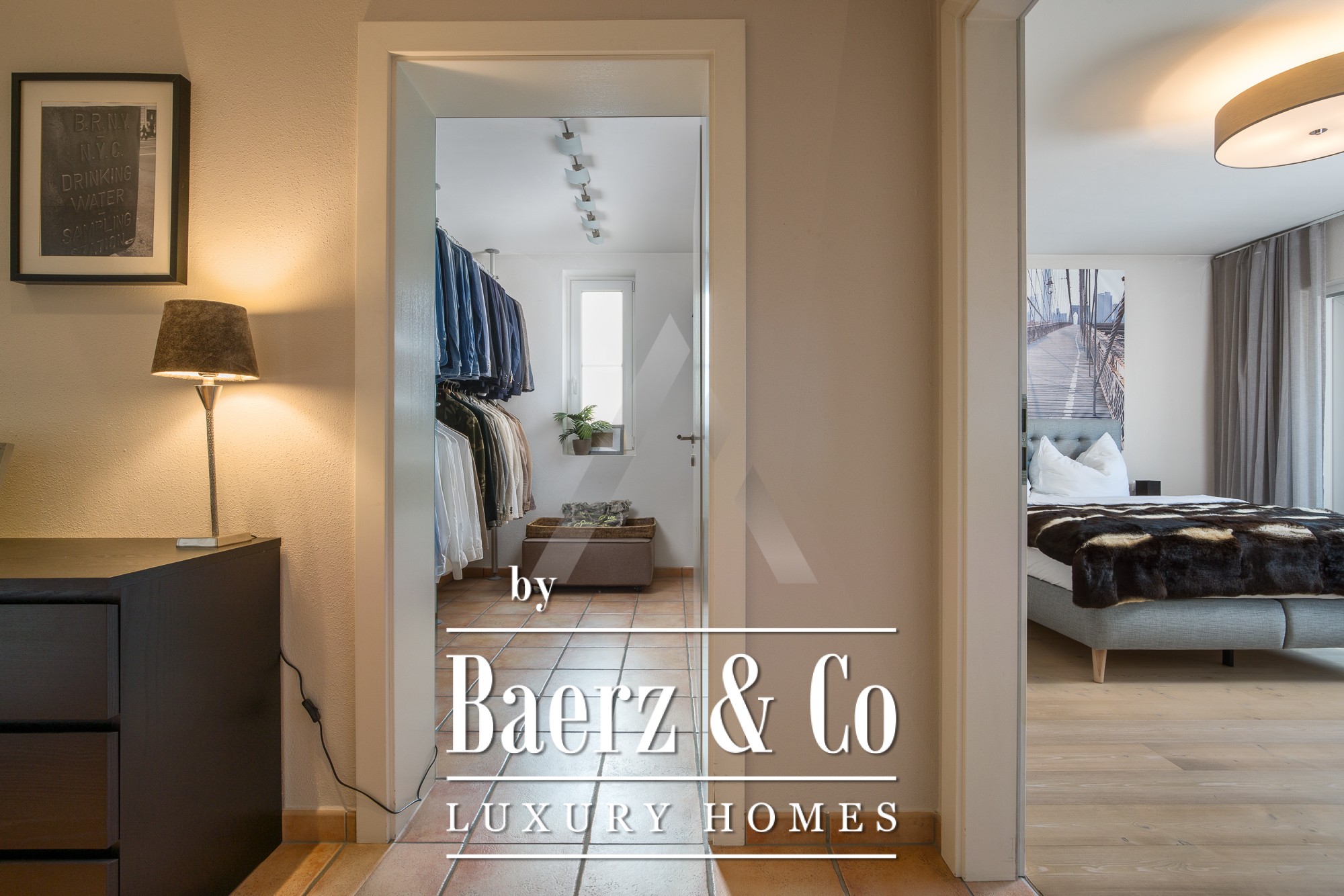 A chic staircase leads to the upper floor, the heart of the property. You will be immediately impressed by the ceiling height. The living and dining area is flooded with light and has an open kitchen with professional appliances. The floor-to-ceiling windows on the west side open onto the large terrace. An attractively designed fireplace is an absolute dream in winter! It provides warmth and a cozy atmosphere. Upstairs there is also a bedroom with its own living area, which can also be used as an office, for example. A guest toilet and a spacious utility room complete the comfort on this floor.