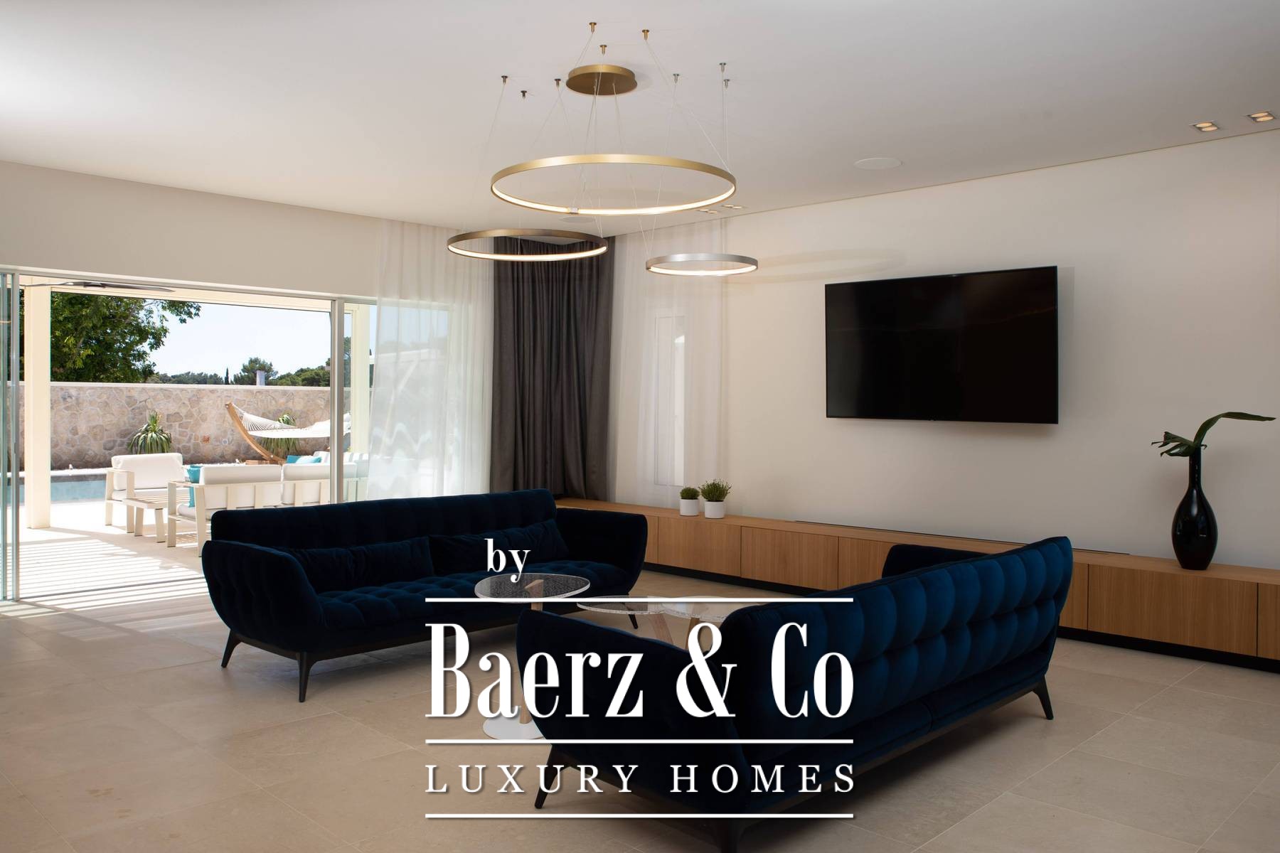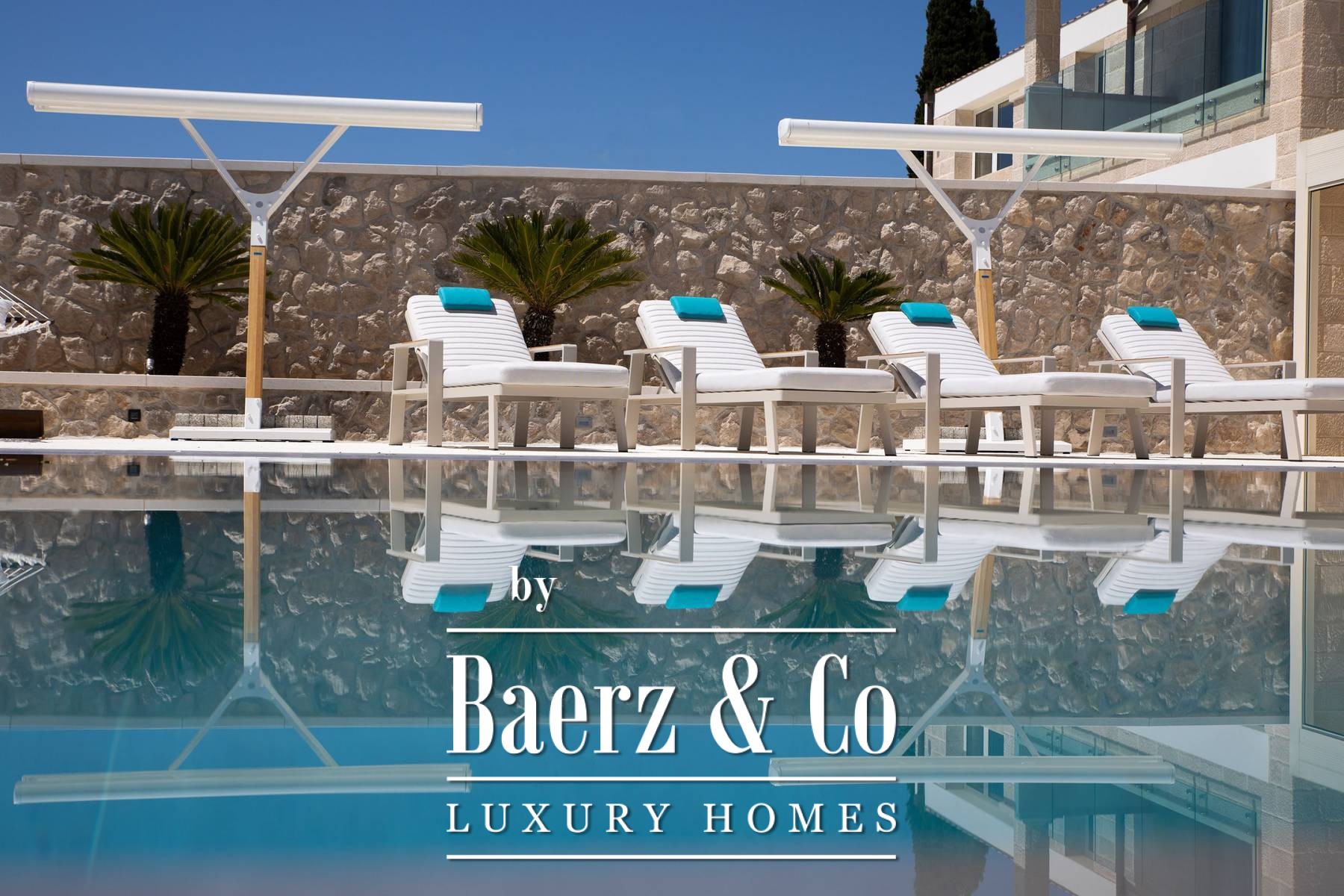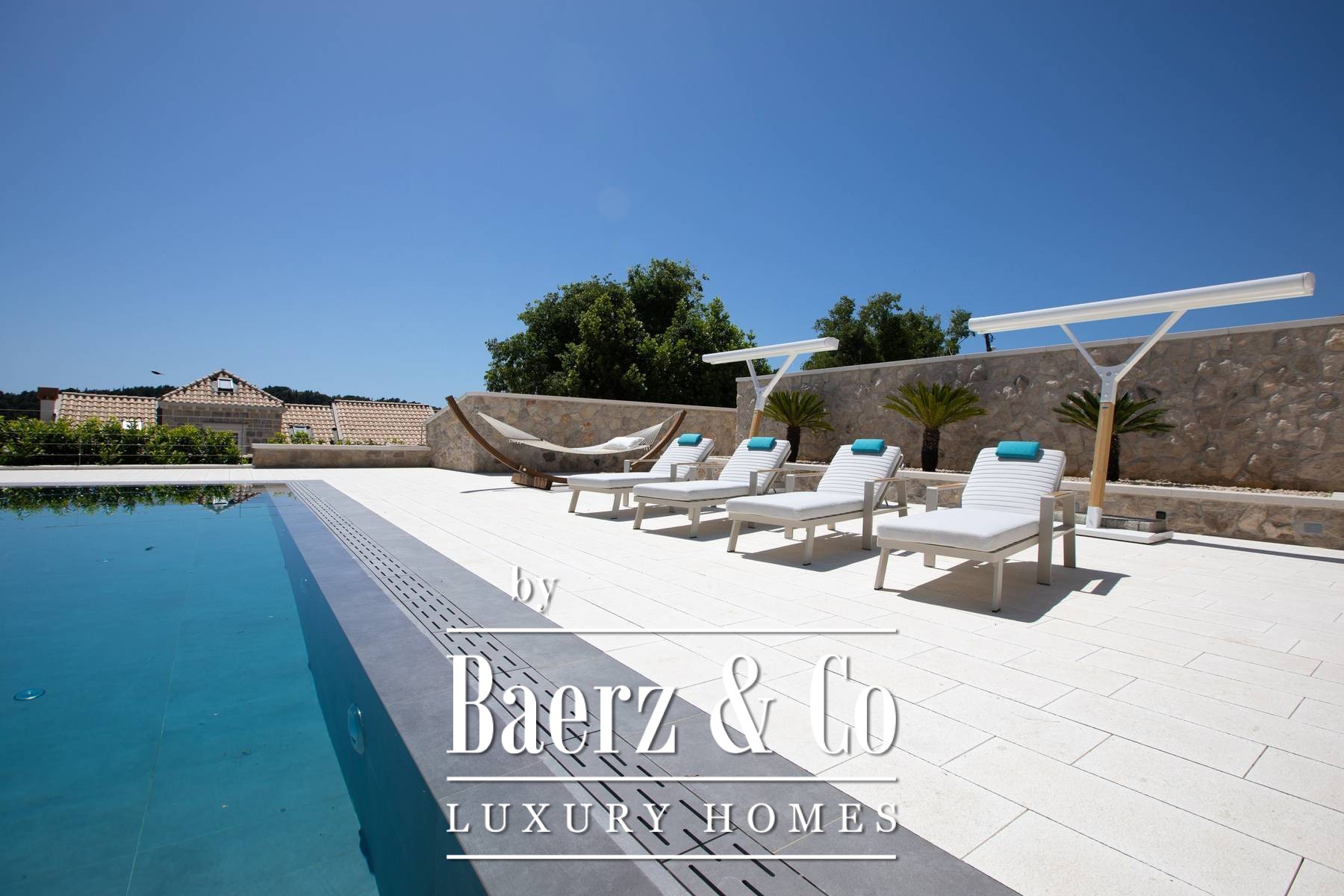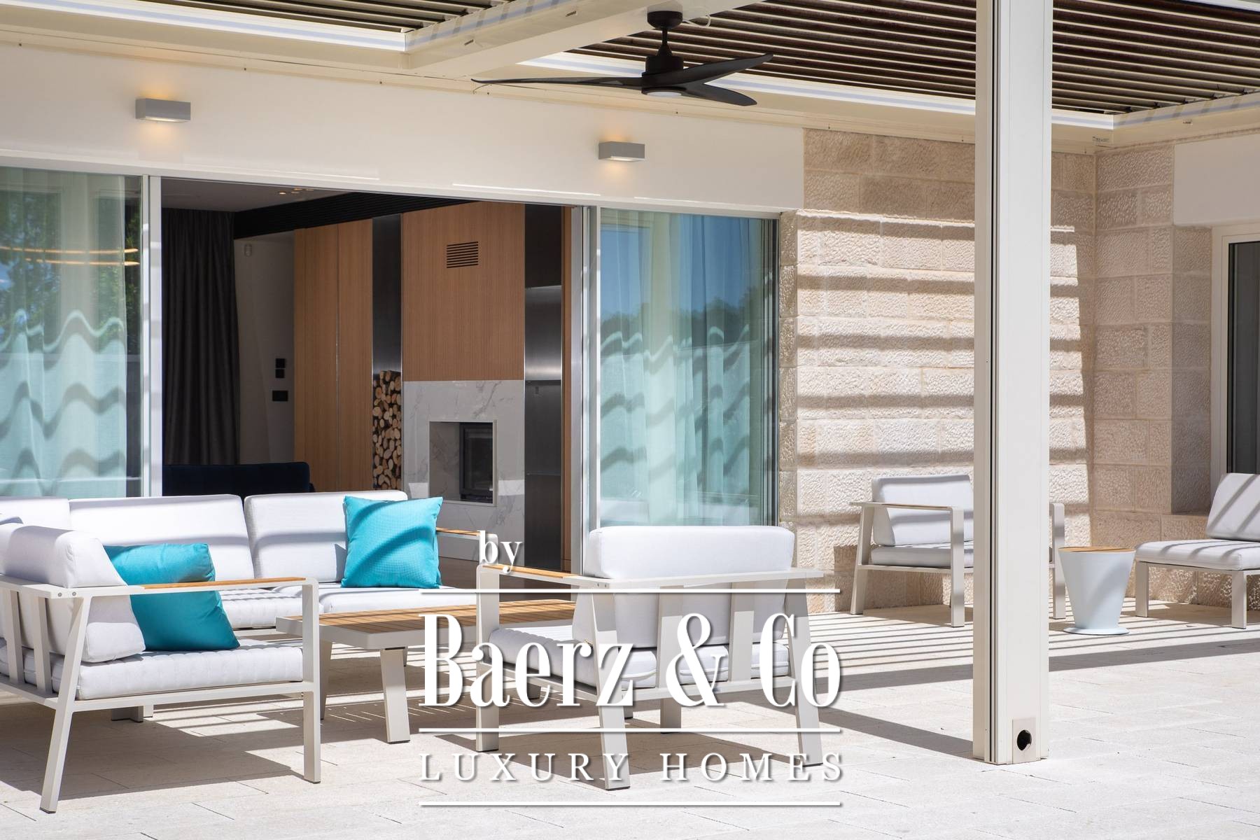 Villa B spans 375 m² over a similar three-level layout, complementing the estate with an additional three bedrooms and private retreats. Altogether, the estate offers seven bedrooms and seven bathrooms. Outdoor amenities include a swimming pool set amidst landscaped grounds. The pace of life here is attuned to the rhythm of the sea and the enduring elegance of the Adriatic.