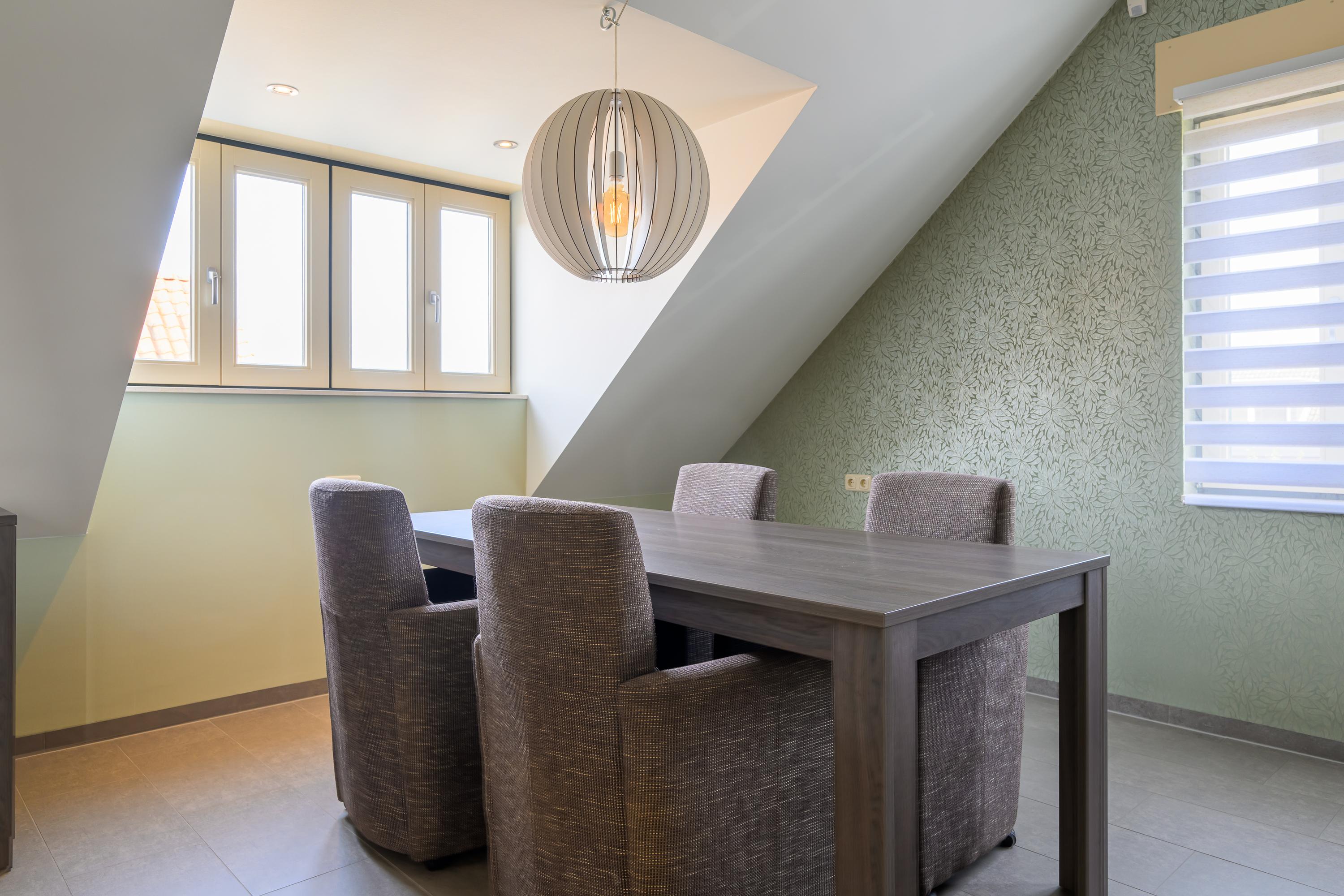 De eerste verdieping is toegankelijk via zowel de binnen- als de buitentrap. Ook hier is de ruimte verdeeld in twee delen. Het ene deel bevat een royale overloop, technische ruimte, zeer ruime slaapkamer en een bergzolder. Aan de andere kant bevindt zich een zelfstandig appartement, compleet uitgerust voor autonoom wonen. Via de buitentrap komen we binnen in een hal met toilet. Vanuit hier bereiken we de royale woon-/eetkamer. Deze is voorzien van een luxe keuken. De badkamer is uitgerust met: een wastafel, inloopdouche en witgoedaansluitingen. De slaapkamer heeft een handige schuifdeurenkast. Ook deze verdieping beschikt over vloerverwarming en profiteert van veel daglicht door de dakramen.