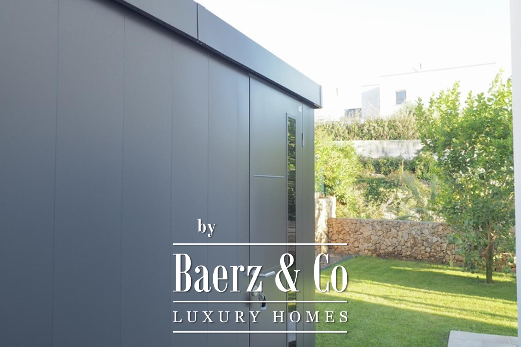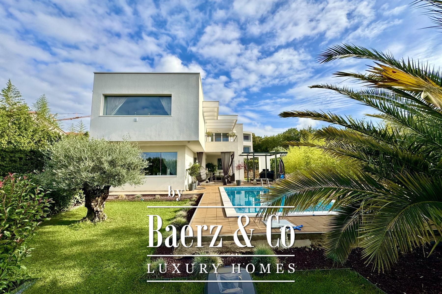 The garden is structured for both contemplation and convivial gatherings, offering a 32 m² swimming pool, sunbathing deck, covered terrace with grill area, outdoor shower, and precise landscaping maintained by a Husqvarna robotic system. Three additional storage units, including a technical room and two aluminum storage spaces of 8 m² each, contribute to an effortless rhythm of daily living.
