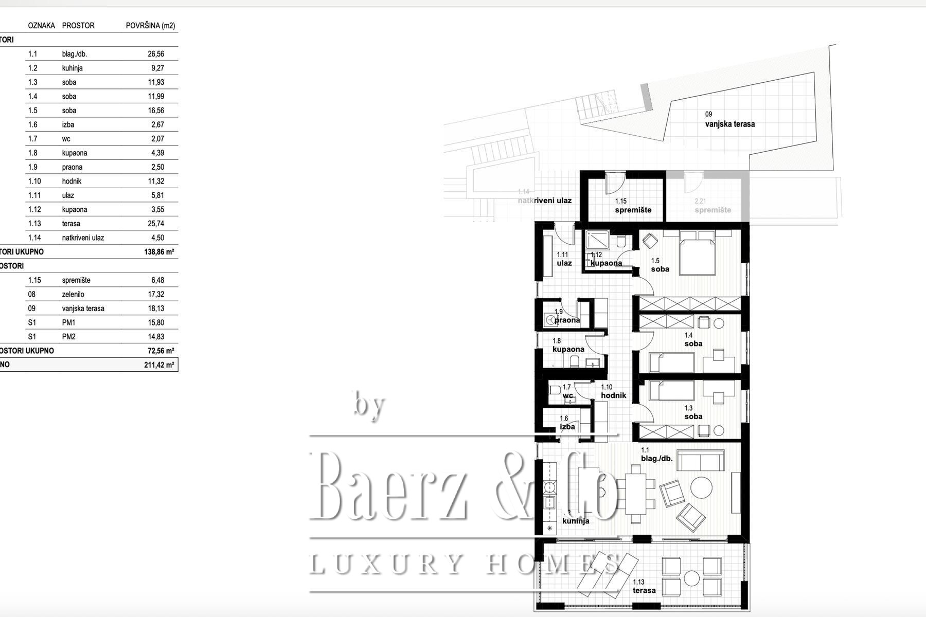 In Kostrena, one of the most beautiful and sought-after locations on the Kvarner coast, a luxurious two-level five-bedroom apartment of 251,58 m² is for sale in a modern building with a total of two floors. This elegant new development represents the perfect combination of sophisticated design, comfort, and contemporary living, offering a stunning sea view that will take your breath away.The apartment consists of a spacious living room and dining area of 40.92 m², connected to a modern kitchen of 7.79 m². It features five spacious bedrooms (9.17 m², 19.20 m², 14.36 m², 18.35 m², and 14.60 m²), three elegant bathrooms, a guest toilet, walk-in wardrobe, laundry room, storage room, pantry, hallway, and entrance area. A covered terrace of 25.74 m² provides additional space to enjoy the fresh air, peace, and beautiful panoramic sea views.Additionally, the apartment includes a private swimming pool, two outdoor terraces with a garden, two outdoor parking spaces, and a separate storage room of 6.48 m².Special attention has been given to the superior quality