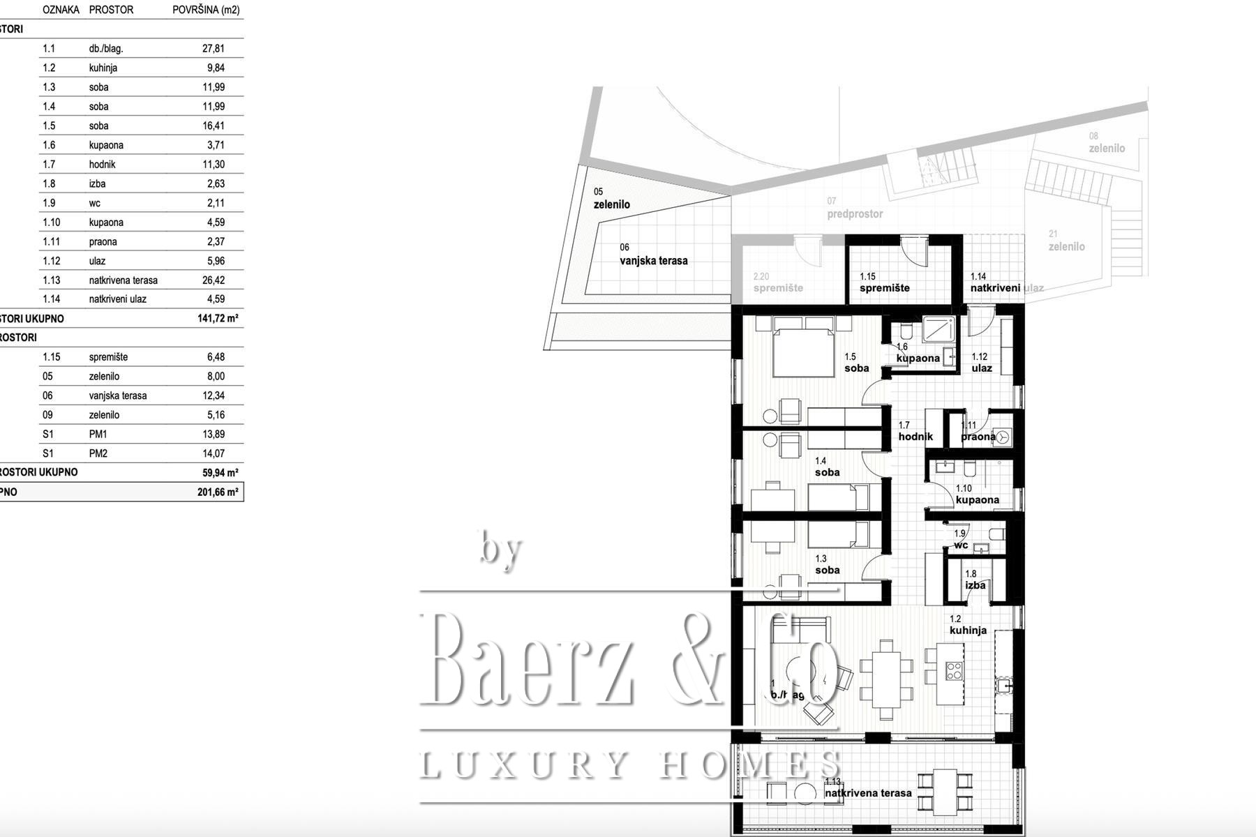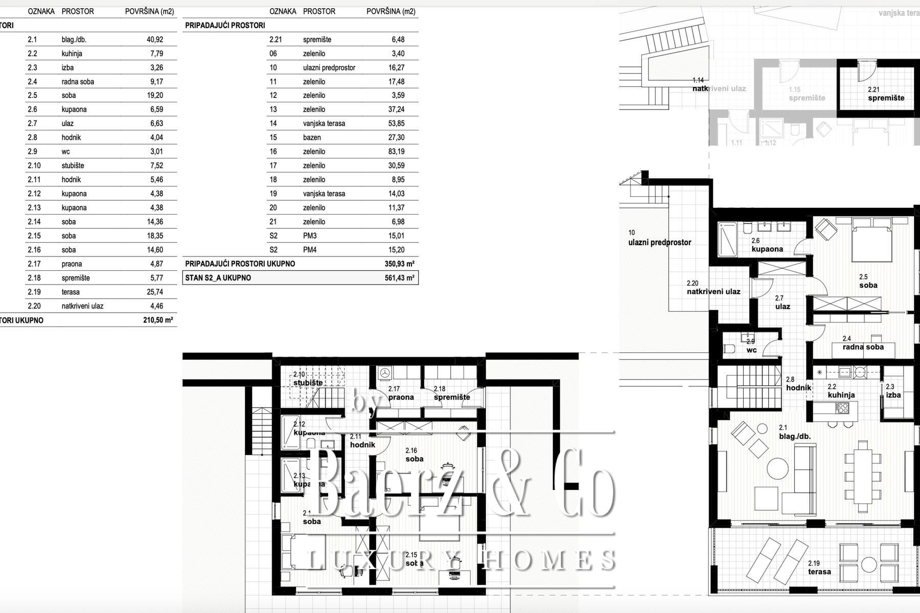 In Kostrena, one of the most beautiful and sought-after locations on the Kvarner coast, a luxurious two-level four-bedroom apartment of 250,80 m² is for sale in a modern building with a total of two floors. This elegant new development represents the perfect combination of sophisticated design, comfort, and contemporary living, offering a stunning sea view that will take your breath away.The apartment consists of a spacious living room and dining area of 42.20 m², connected to a modern kitchen of 7.73 m². There are four spacious bedrooms (21.91 m², 14.20 m², 14.20 m², and 14.20 m²), three elegant bathrooms, a walk-in wardrobe, laundry room, storage room, pantry, hallway, and entrance area. A covered terrace of 26.14 m² provides additional space to enjoy the fresh air, peace, and beautiful panoramic sea views.Additionally, the apartment includes a private swimming pool, two outdoor terraces with a garden, two outdoor parking spaces, and a separate storage room of 6.48 m².Special attention has been given to the superior quality of construction