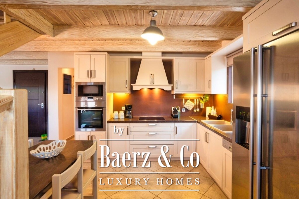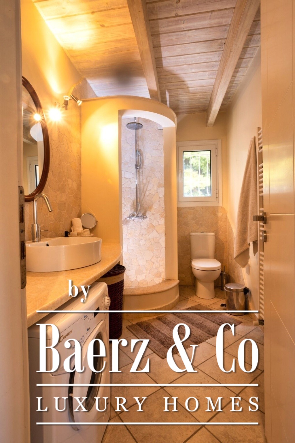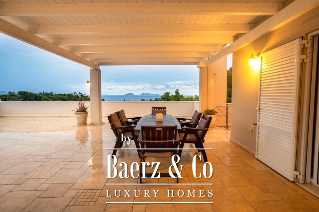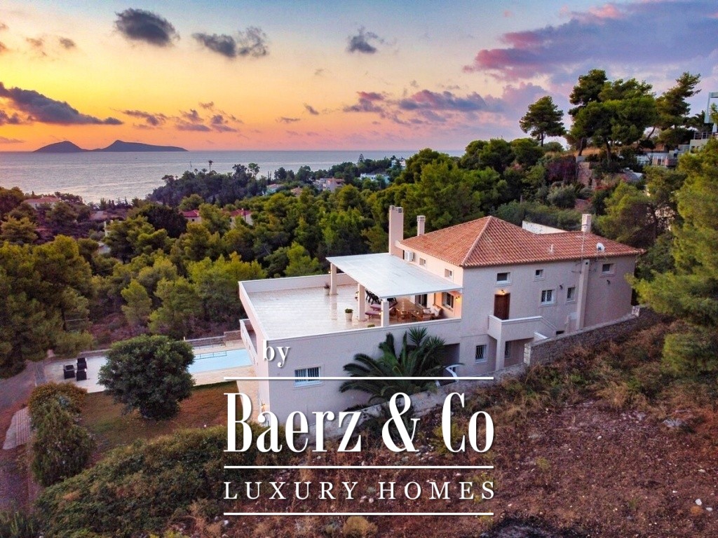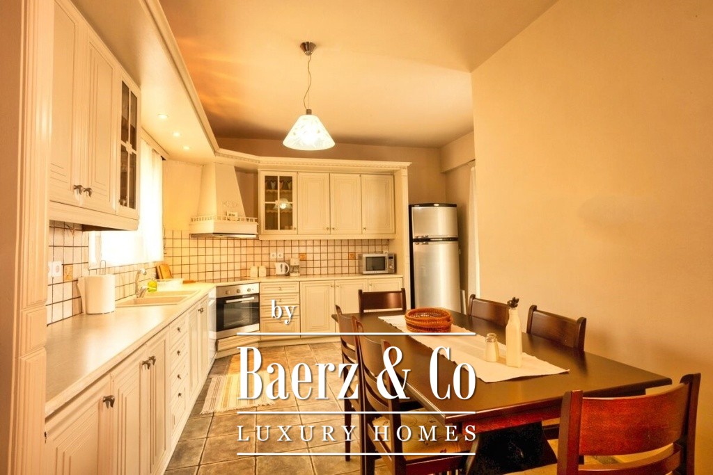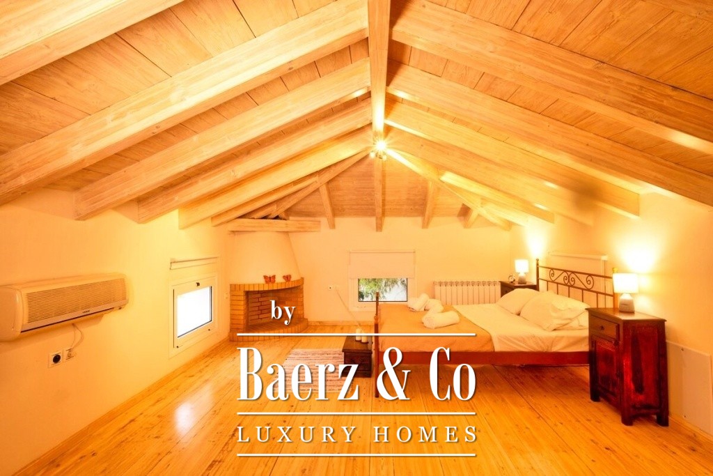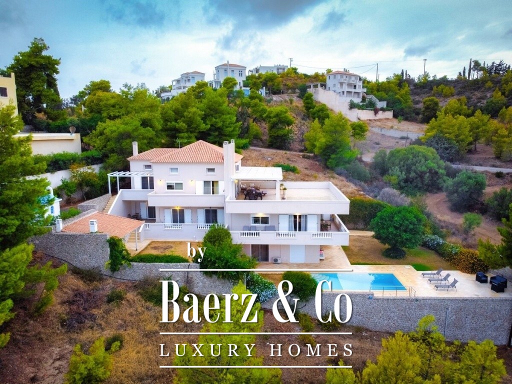 been configured, where 2 bedrooms have been configured. The plot of the residence is beautifully leveled and fenced with a stone wall. There is a 35 m² variable depth swimming pool, perimeter paving and covered barbecue with wood oven. The rest of the plot is planted with ornamental plants, trees and grass. In addition, at the entrance to the plot is a covered storage space - garage of 60 m². The special features of the residence are the peaceful environment in a pine wooded area, the beautiful view, the good construction quality, the access on foot to the nearby beaches and its excellent location. As an example, we mention that the residence is located at a distance of: 400 meters from the wonderful lace beaches of the area, 6 km from cosmopolitan Portoheli, 15 km from the professional golf course which is under construction, 200 km from Athens International Airport. In the above indicative distances we must also mention the ease of access to the wonderful, picturesque islands of Spetses and Hydra.