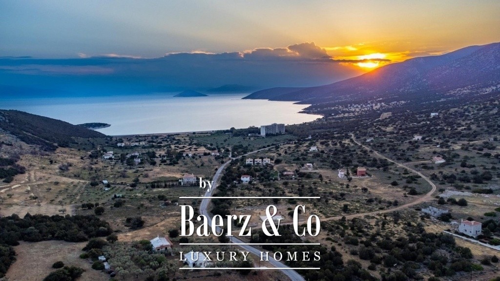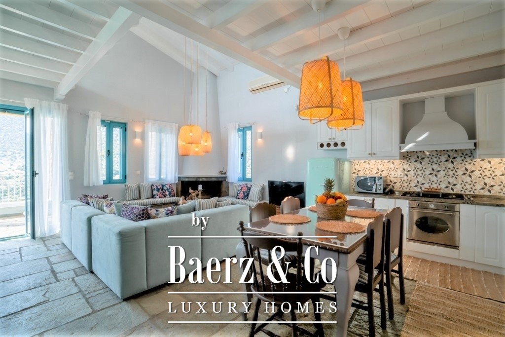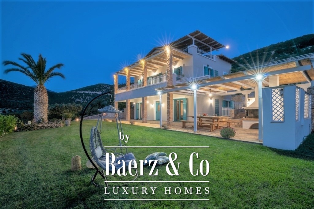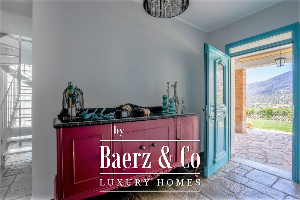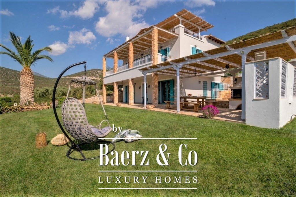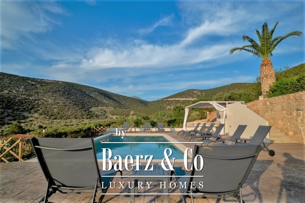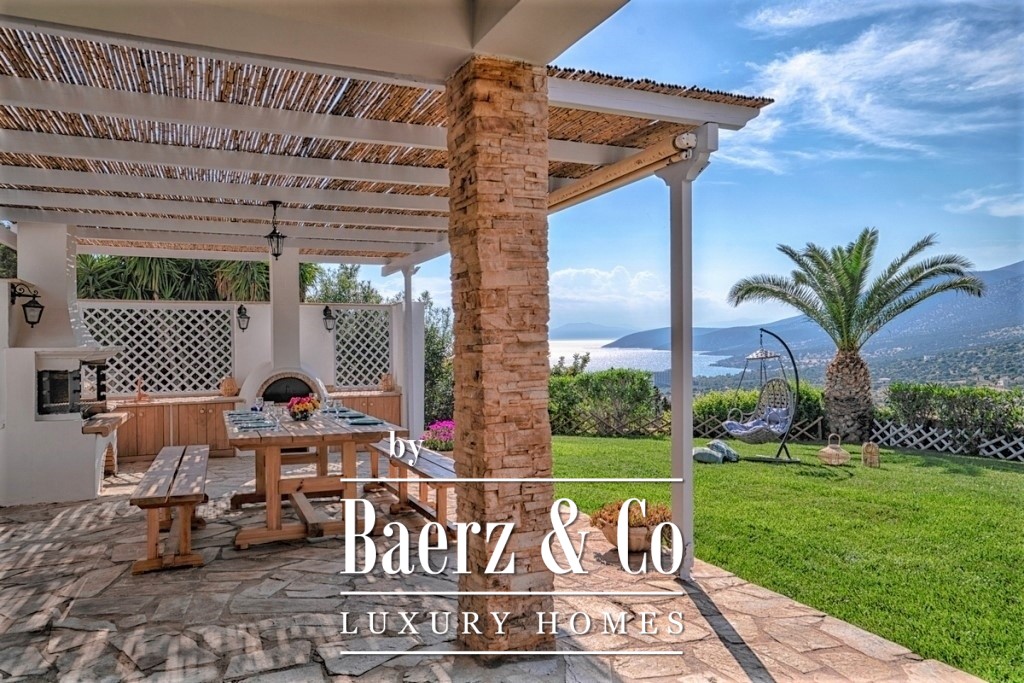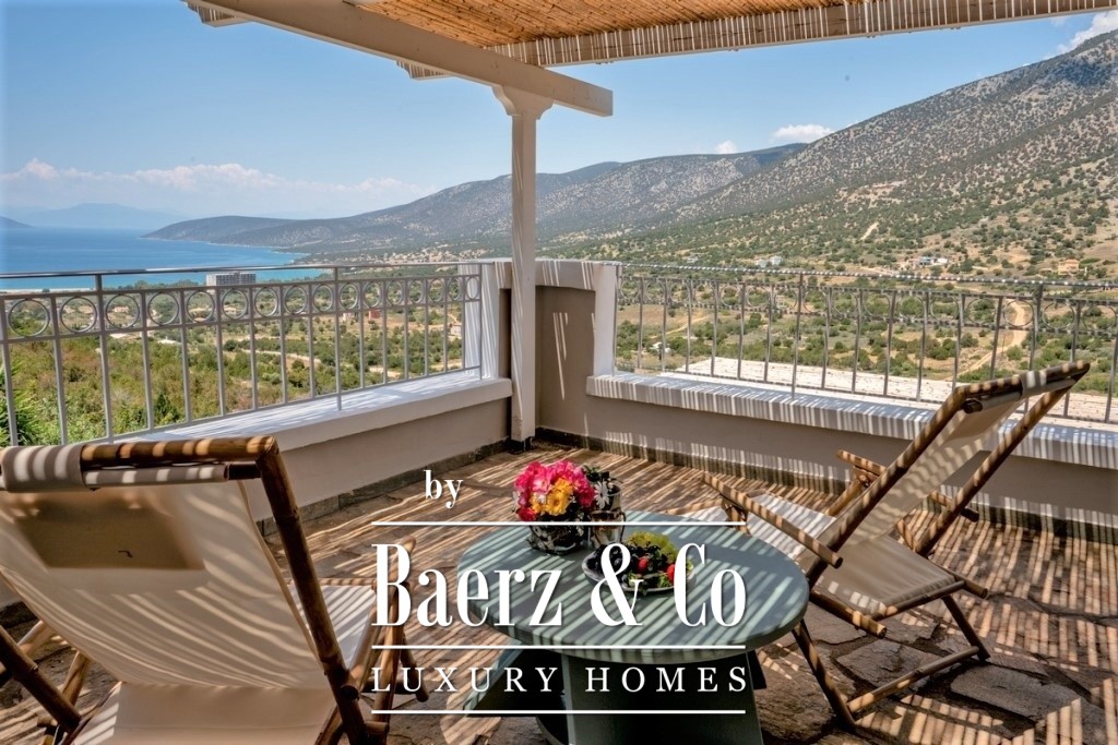 In a green, sloping land of 4,000 sq.m., a 3-level villa, with a total surface of 200 sq.m., offering an amazing and unobstructed view of the mountain and the sea is available for sale. On the middle level we find the main entrance that leads to a spacious common area, consisting of a living room with a fireplace, a dining room, a fully equipped kitchen and a bedroom. A large door leads to the front porch, where we will find a comfortable outdoor living room and a dining area. There one can enjoy endless moments of relaxation, gazing at the wonderful view towards the bay and the garden with the swimming pool. The upper level is a loft and consists of a bright bedroom, a second small utility room, a main bathroom and a balcony with the same beautiful view of the neighboring forest and