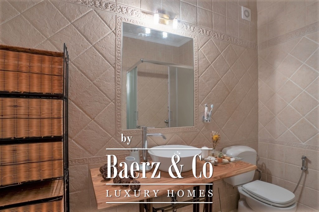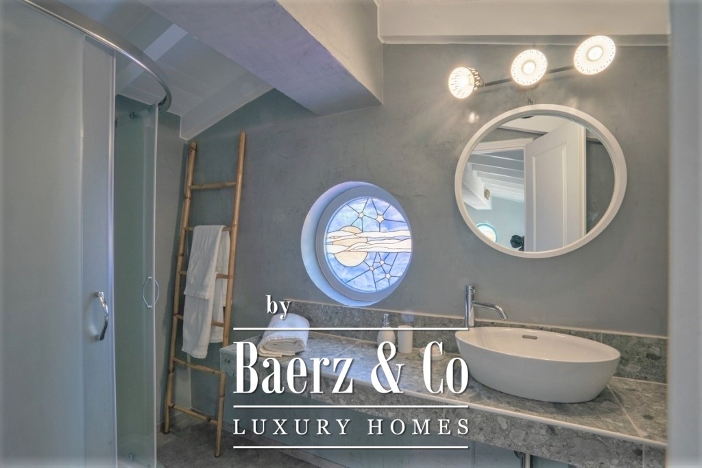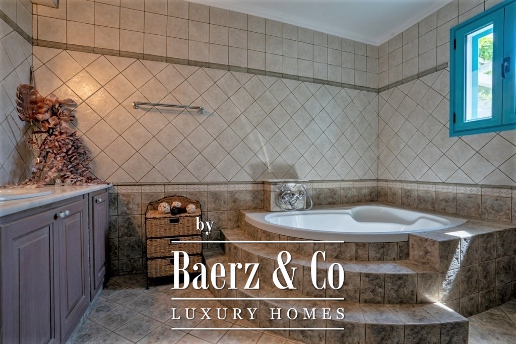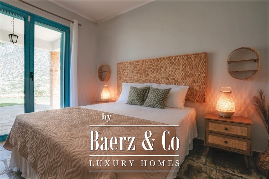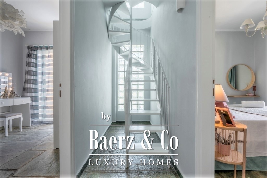 the bay. The 3rd level (ground floor) has a central entrance and consists of 3 bedrooms, each with an independent balcony door leading to a large covered terrace on the ground floor, a large central bathroom and an independent utility room. On this level there is a large bbq, a traditional wood oven and it is equipped with a large outdoor dining table made of solid wood. In the garden there are configurations with tall stone blocks that create large terraces, one of which includes the swimming pool with a beautiful panoramic view. Also. the house has two ground floor large storage rooms with a total surface of 130 sq.m. One is located at the entrance of the plot and the other is located next to the house. Within the plot we can also find a variety of olive and fruit trees.