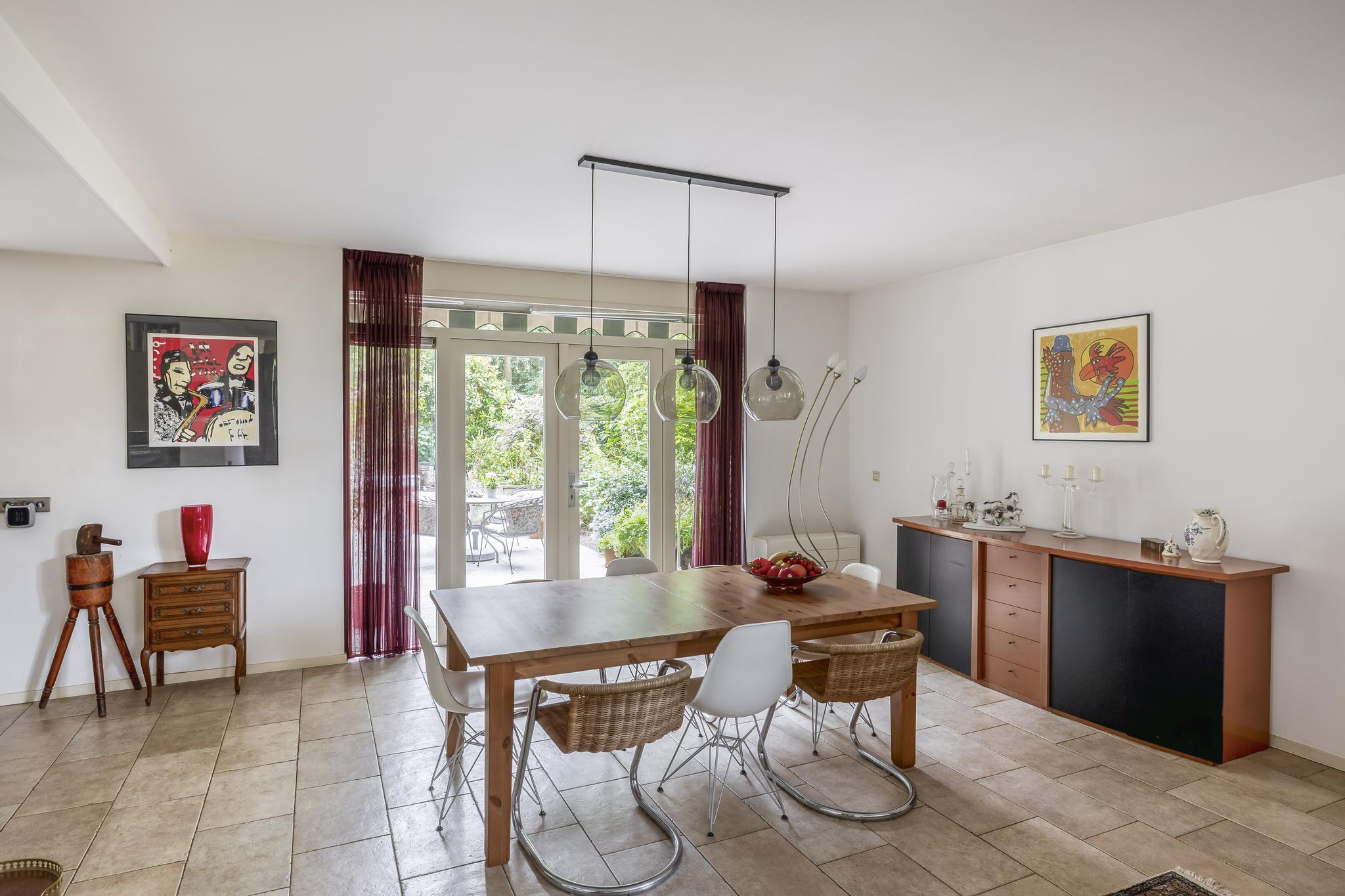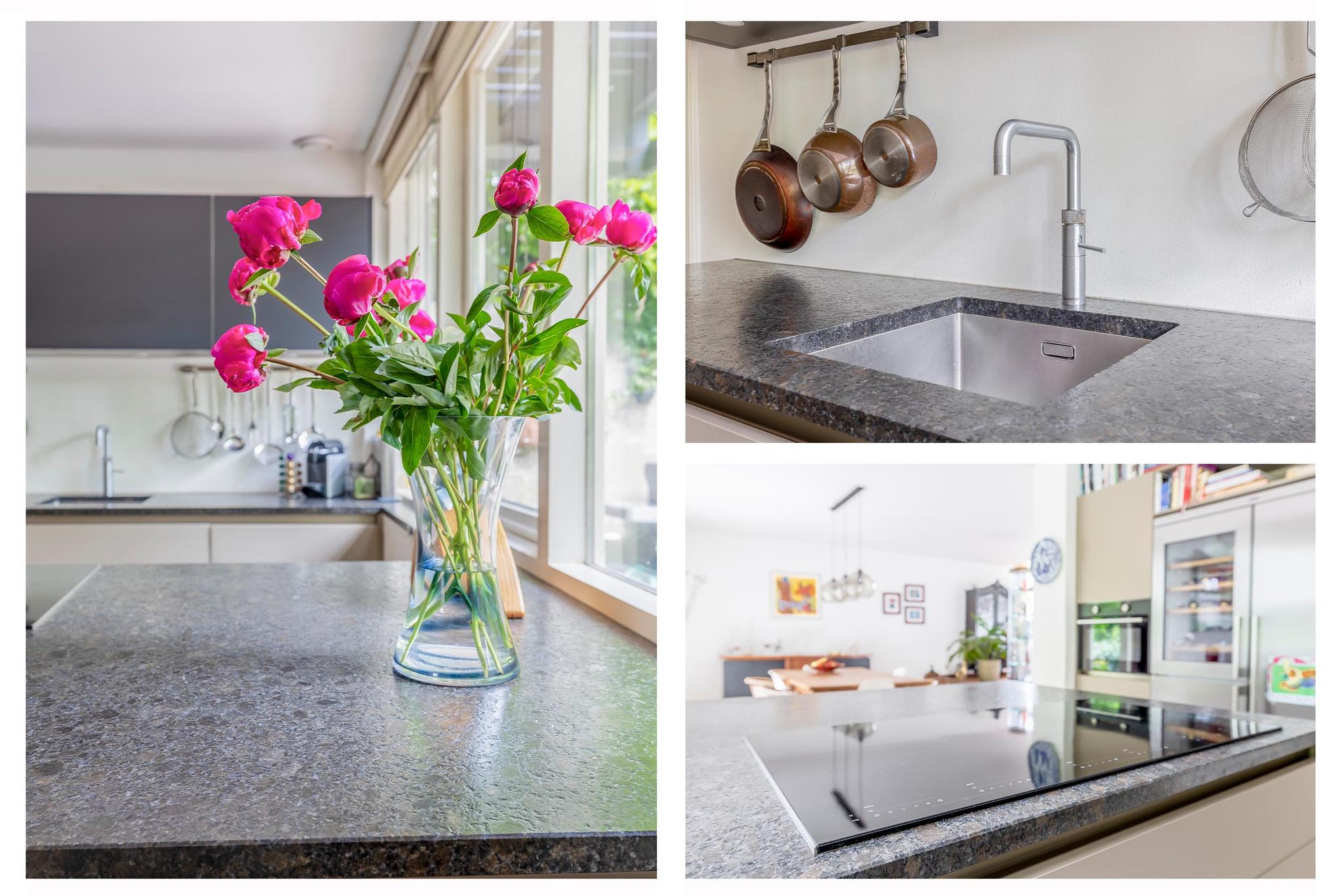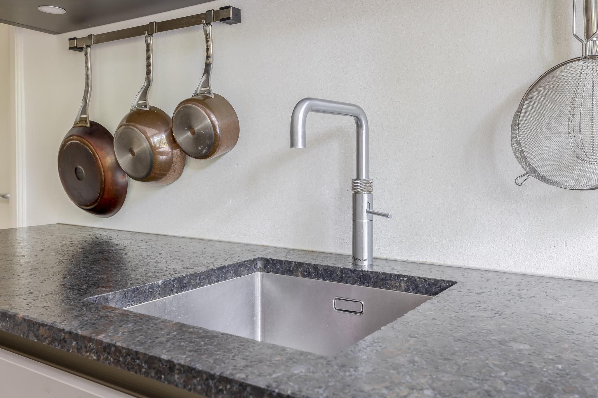 At the rear of the house lies the spacious kitchen, renovated about eight years ago. With a luxury layout and modern design—stone countertop, cooking island with induction hob and extractor, combi oven, steam oven, wine fridge, refrigerator, freezer, and dishwasher—it’s a dream for any cooking enthusiast. From the kitchen, you overlook the terrace and lush garden that surrounds the home.