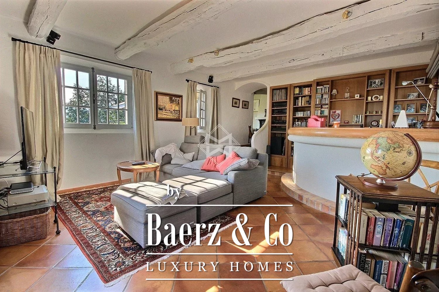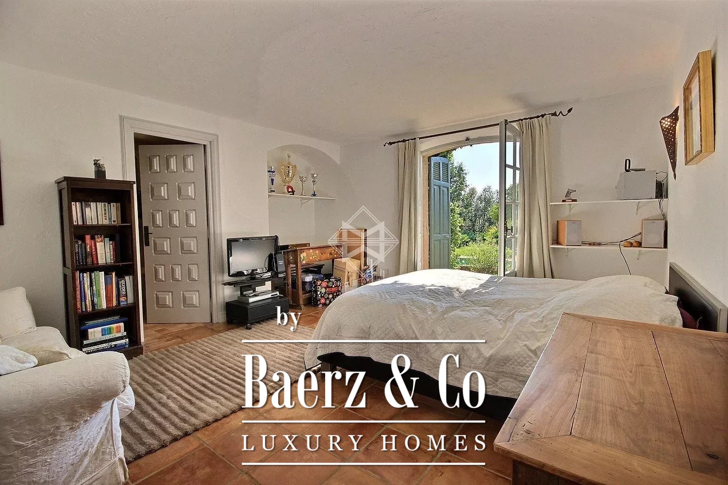 Entering the ground floor, a main foyer leads through to a living room with fireplace, the light amplified by terraces that open to the garden and swimming pool. The TV-bar room extends onto a Tropezian terrace, while a Salernes kitchen joins the dining room for sociable gatherings.