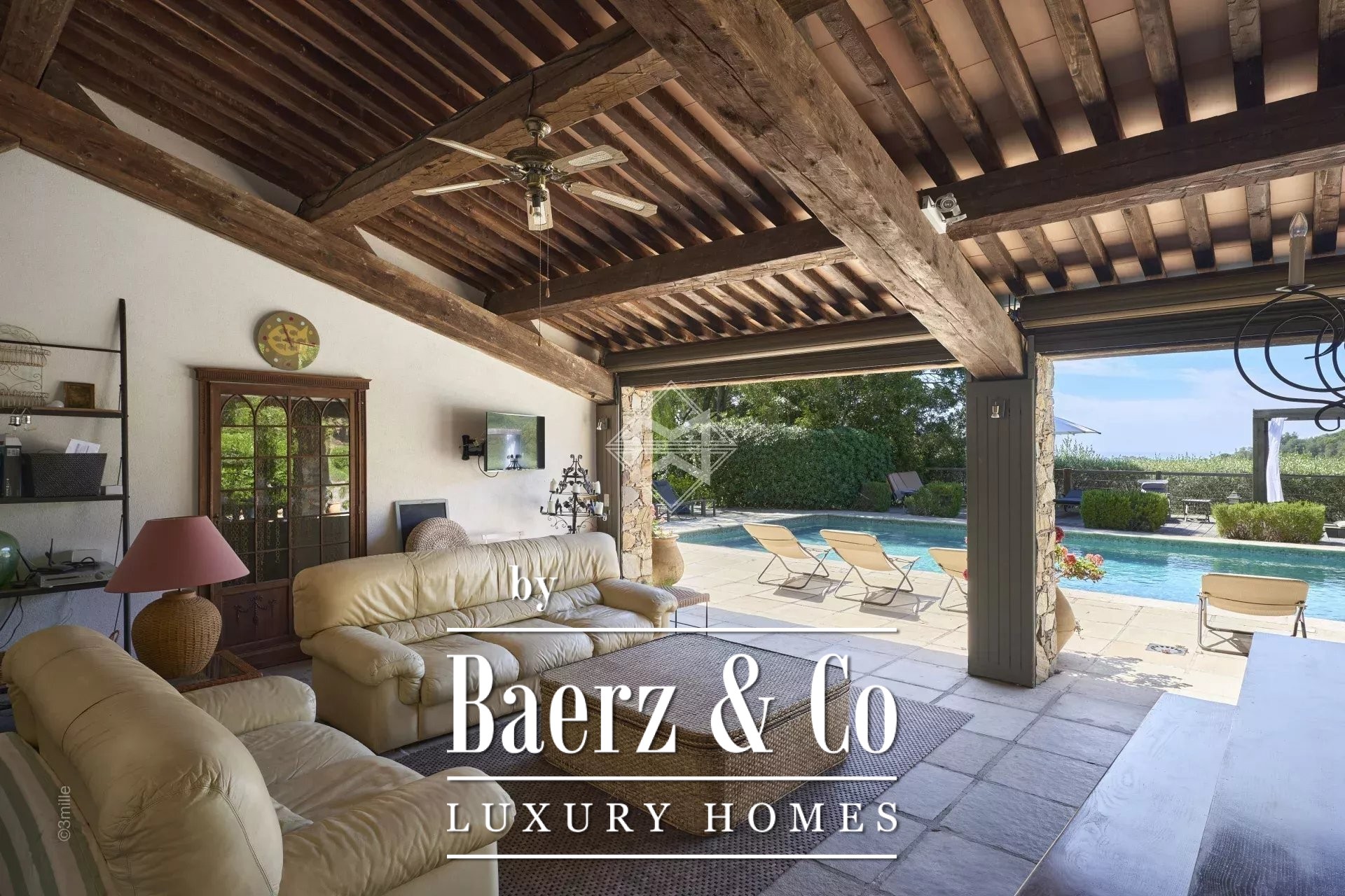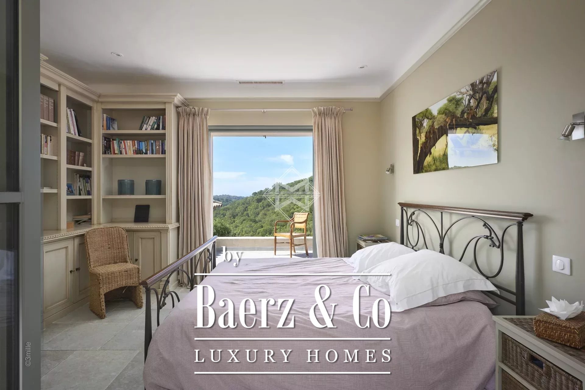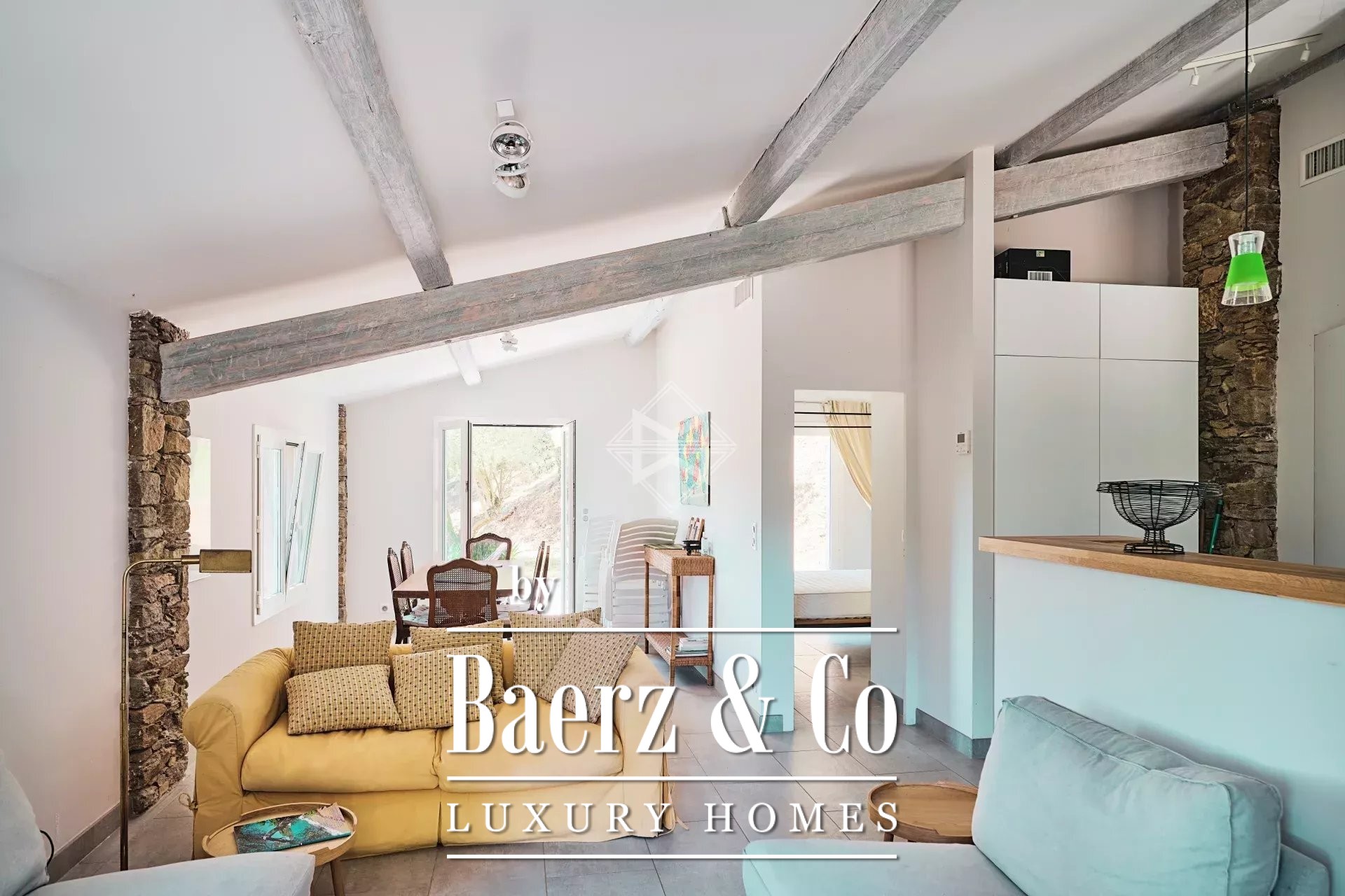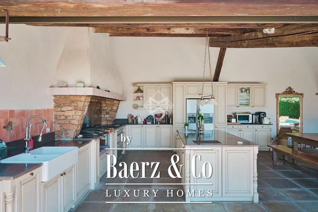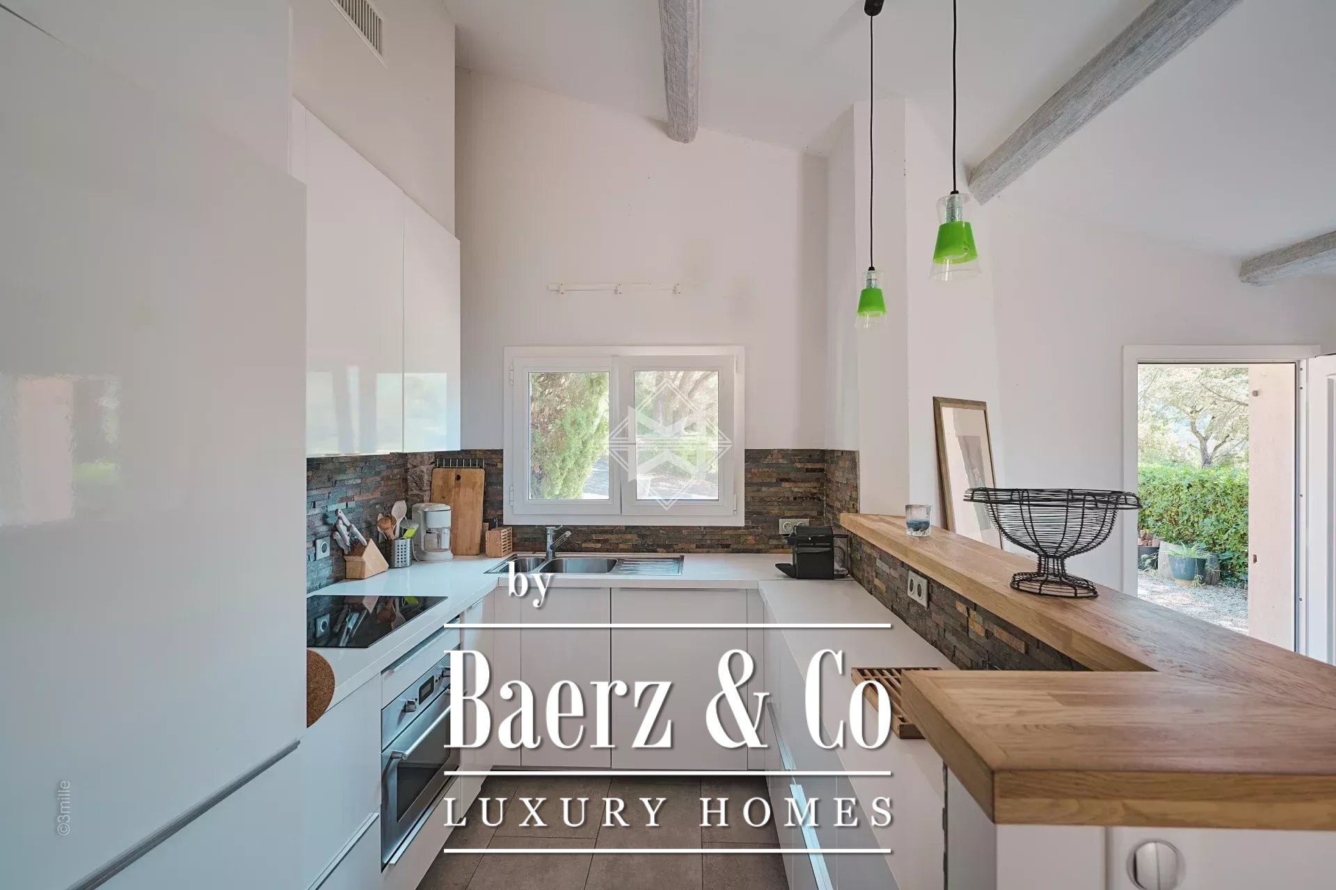 The main house enjoys a living room with fireplace open to a dining room and a fully equipped kitchen with high-end brand, a master bedroom of 60sq m including two offices, a dressing room, a bathroom the whole overlooking a solarium terrace with clear view of the nature of Gigaro as well as a glimpse of the sea