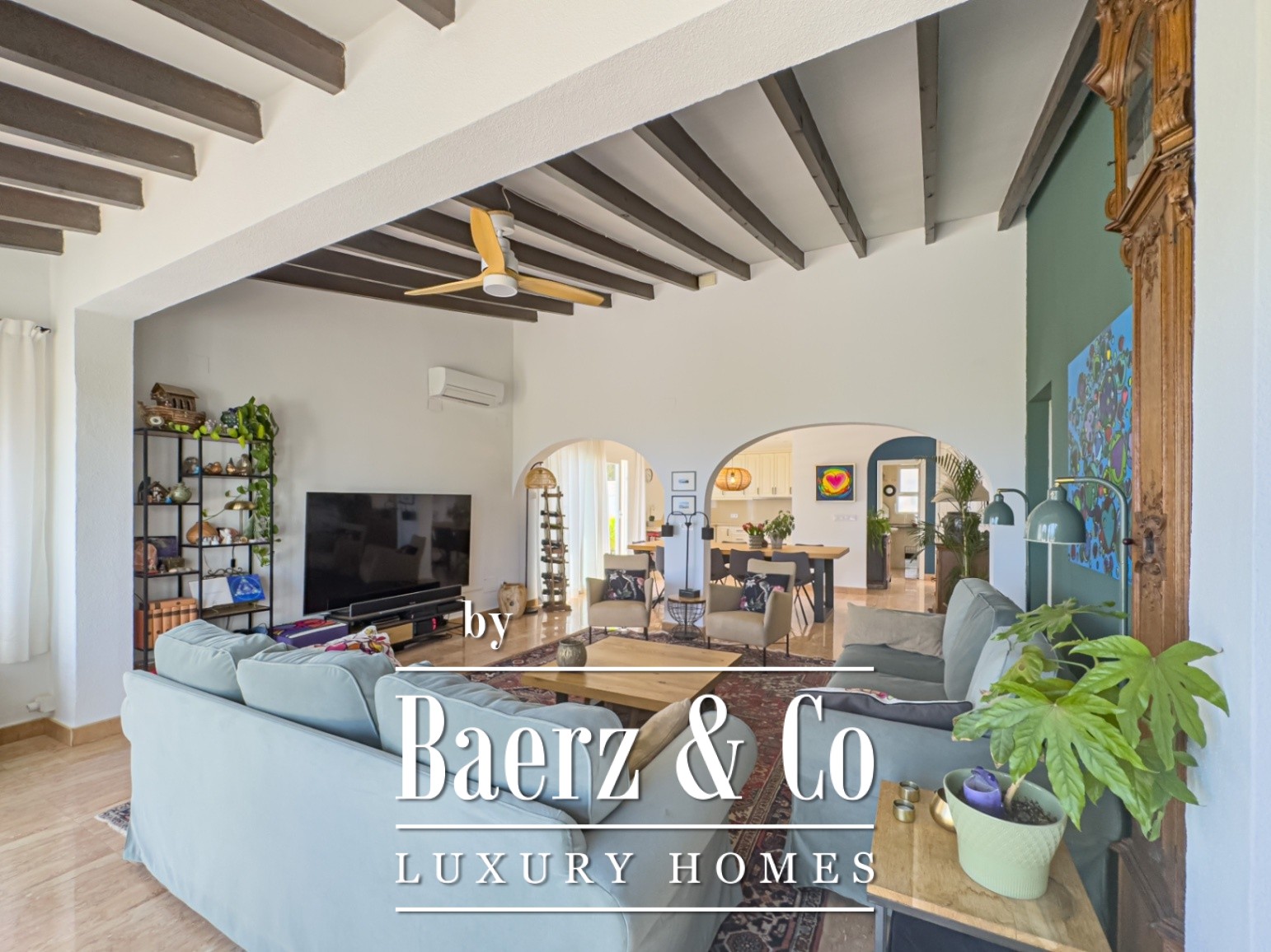 Outside, an array of palm and fruit trees create a sense of quiet seclusion. The private pool, dedicated parking, and refined garden spaces complete the sense of retreat. The outdoor kitchen enhances the Mediterranean atmosphere, making alfresco living effortless.