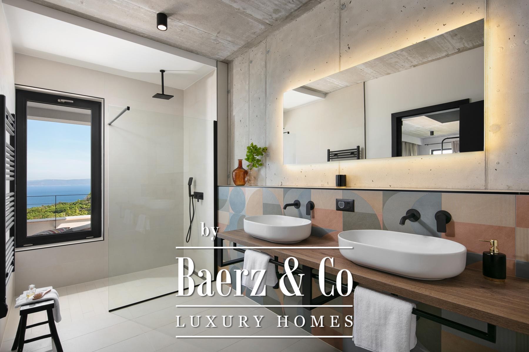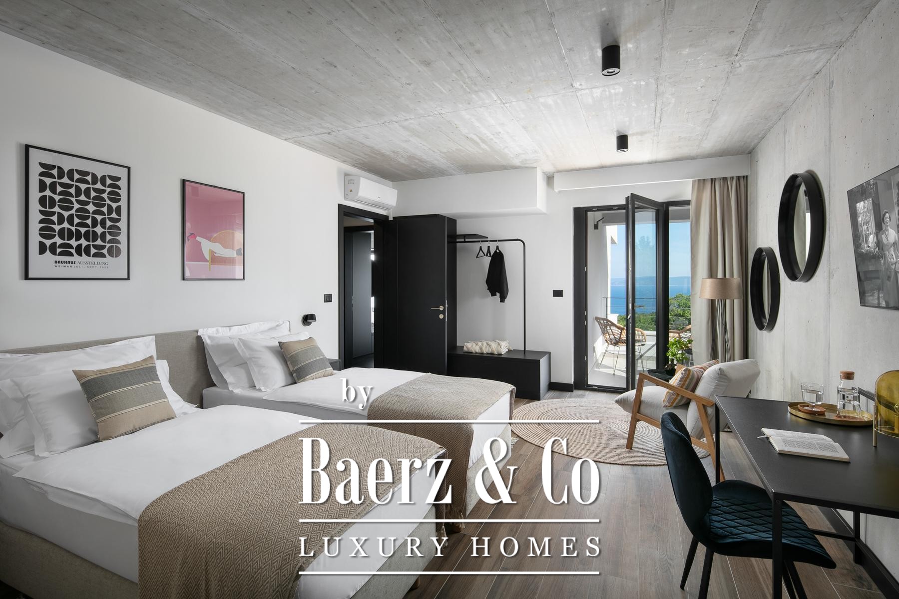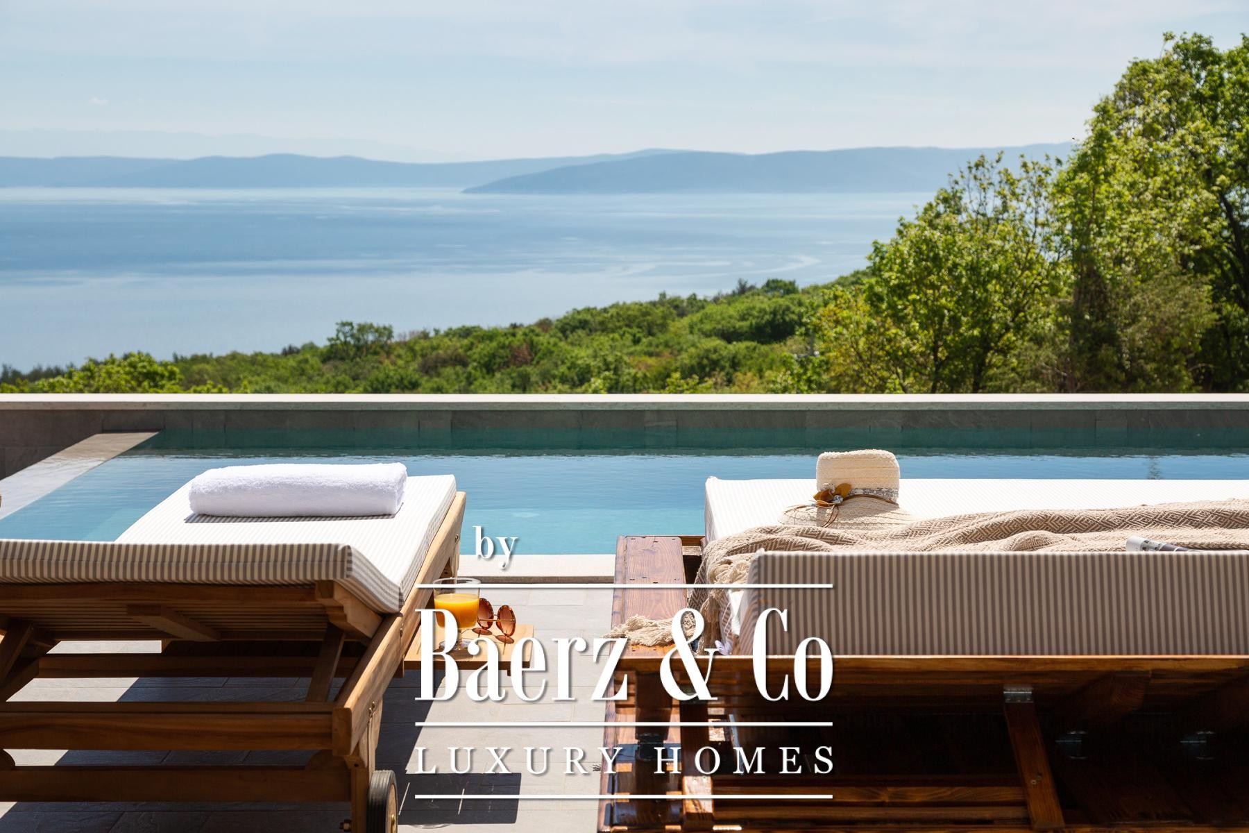 Villa Labin with panoramic Kvarner views exemplifies discreet modern design just outside the historic town of Labin. This 450 m² residence is positioned on an 827 m² plot, thoughtfully protected from both view and noise, and commands open vistas of the Kvarner Gulf, Rijeka, and Cres from every level. The villa’s architecture balances reinforced concrete construction with a restrained industrial aesthetic, softened by first-class Italian ceramic surfaces and curated furnishings tailored for premium hospitality.