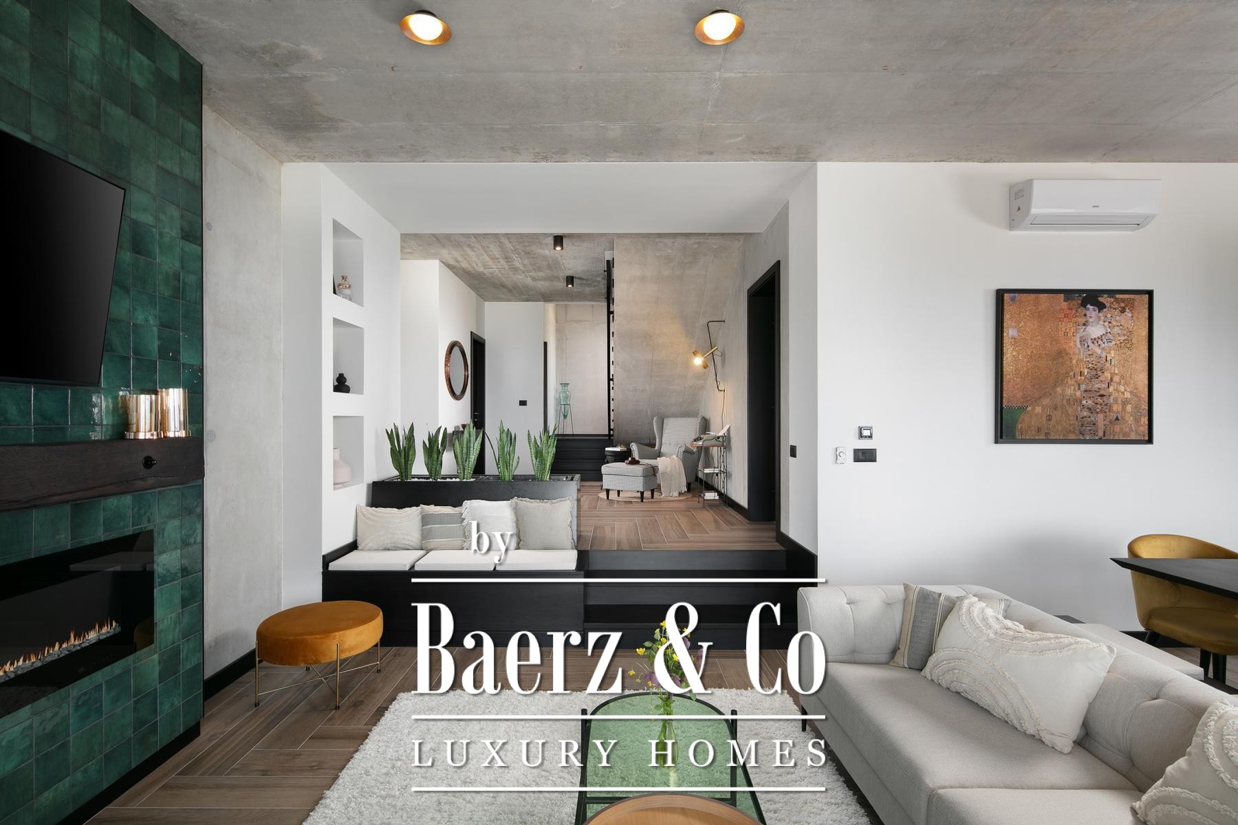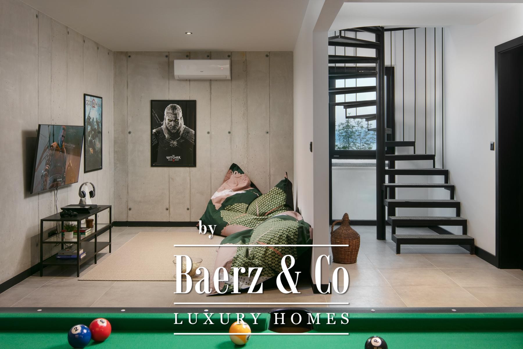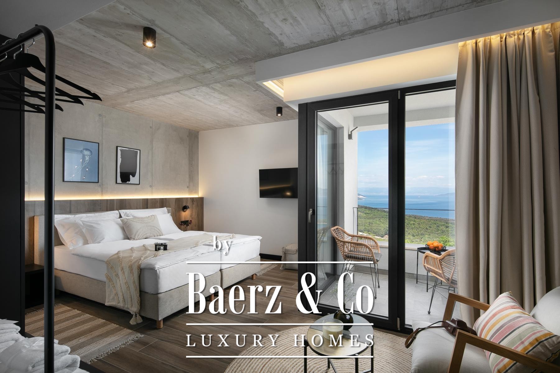 Villa Labin with panoramic Kvarner views exemplifies discreet modern design just outside the historic town of Labin. This 450 m² residence is positioned on an 827 m² plot, thoughtfully protected from both view and noise, and commands open vistas of the Kvarner Gulf, Rijeka, and Cres from every level. The villa’s architecture balances reinforced concrete construction with a restrained industrial aesthetic, softened by first-class Italian ceramic surfaces and curated furnishings tailored for premium hospitality.