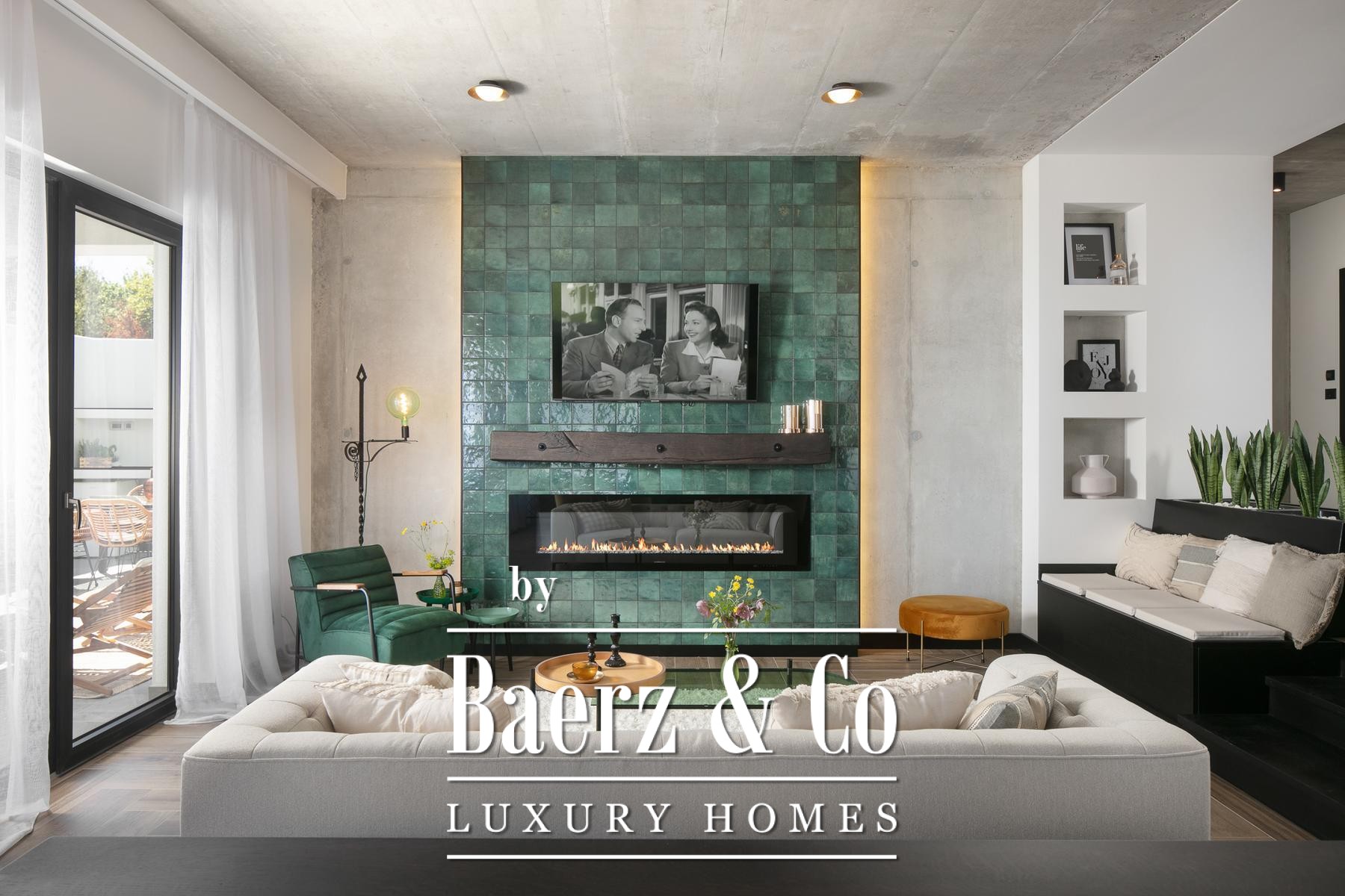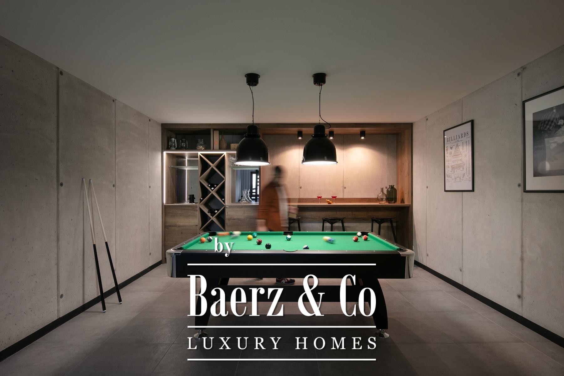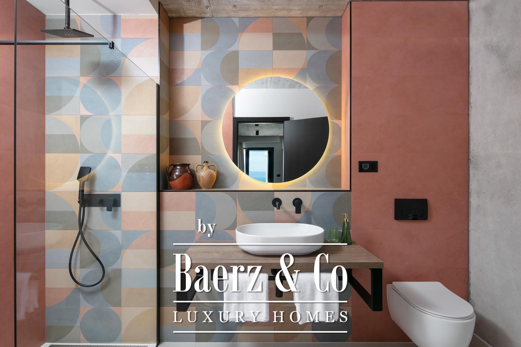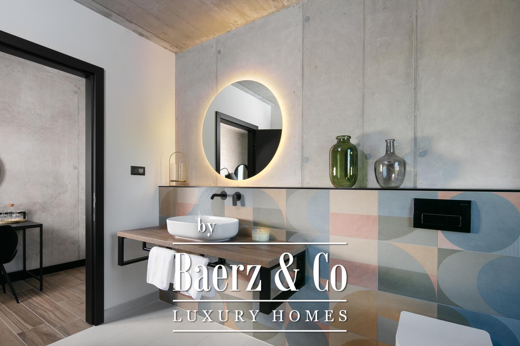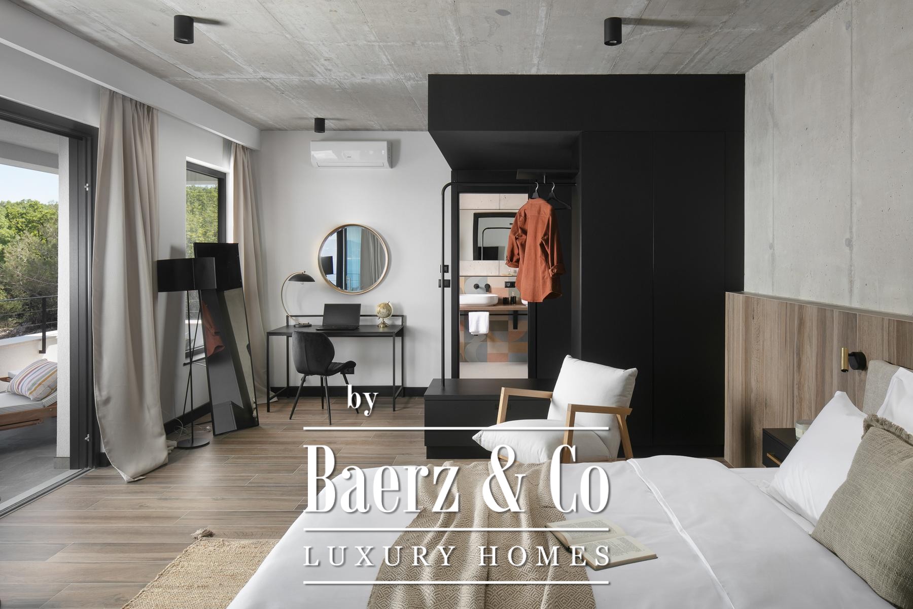 The ground floor provides an elegant flow, with a welcoming entrance hall, guest facilities, and a bedroom suite, unfolding into an open-plan living, dining, and kitchen area. Floor-to-ceiling glass directs light onto the covered terrace, where the private pool, sun deck, and a summer kitchen with barbecue invite seamless outdoor living. Upstairs, three further bedroom suites each enjoy a private terrace and en-suite bath, with the master adding a bathtub for tranquil respite.