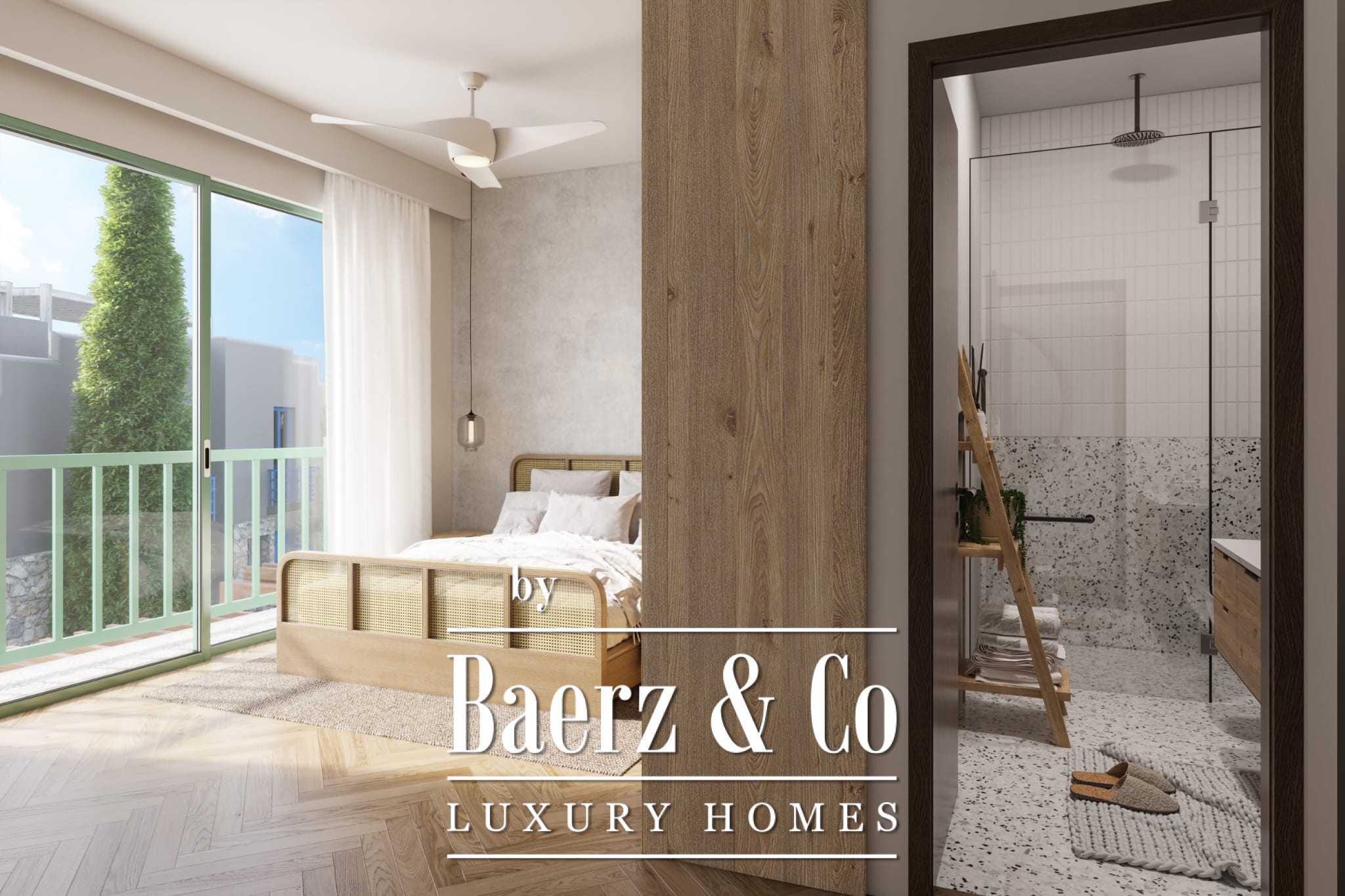 The village offers many choices for purchase 1- and 2-bedroom apartments or penthouses, 3-bedroom villas with private pools. These particulars reflect the 2-bedroom garden option which comprises of an open plan layout with fully fitted kitchen and living area combined, two double bedrooms with fitted wardrobes, bathroom, and entrance hallway. The living rooms leads onto a private garden area in front of the property