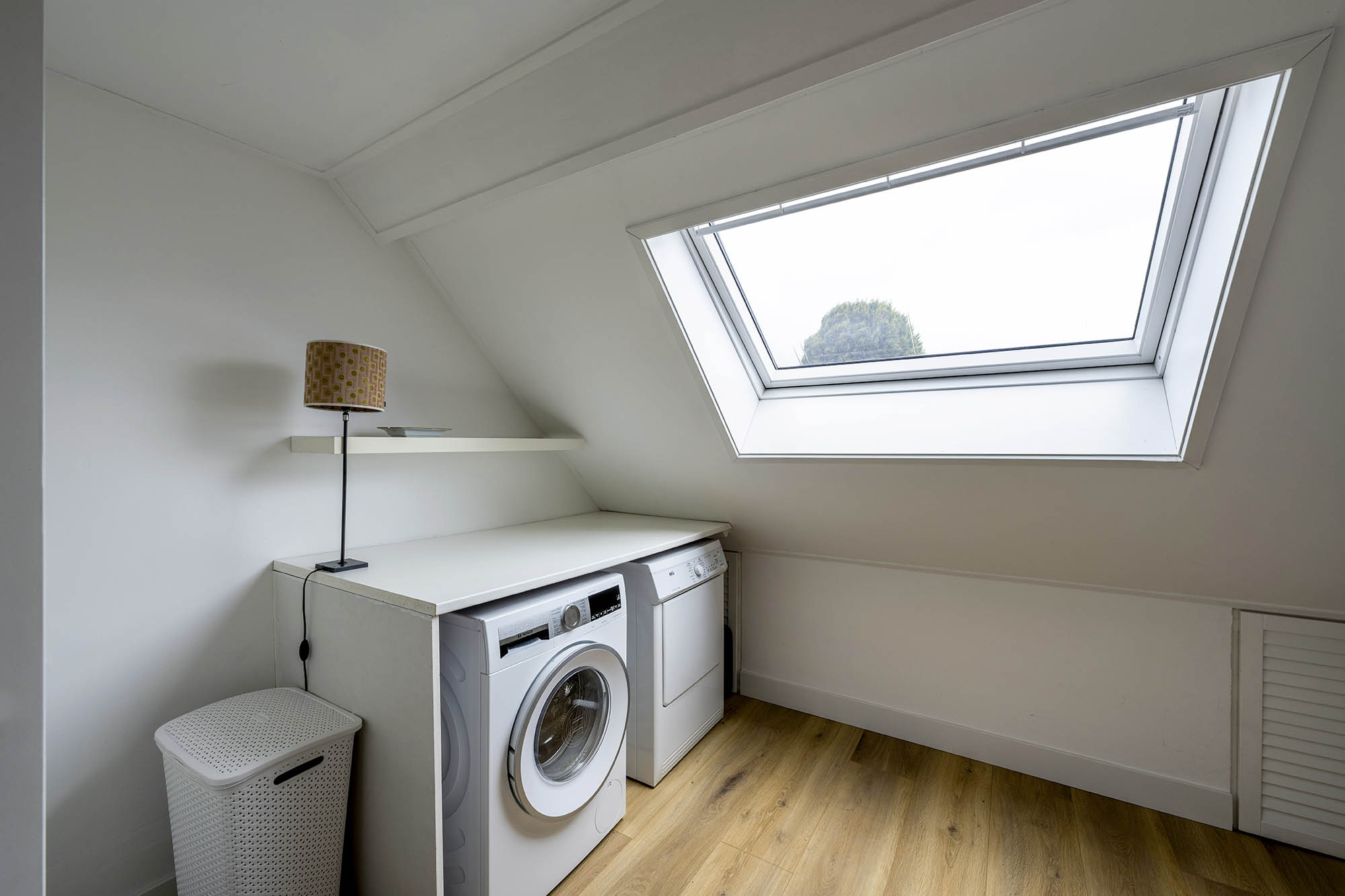 On the first floor there are three well-sized bedrooms, one of which is currently used as a laundry room, as well as a modern bathroom with bathtub, vanity unit, and toilet. A fixed staircase takes you to the second floor, where the master bedroom with built-in wardrobes and private bathroom forms a delightful private retreat.