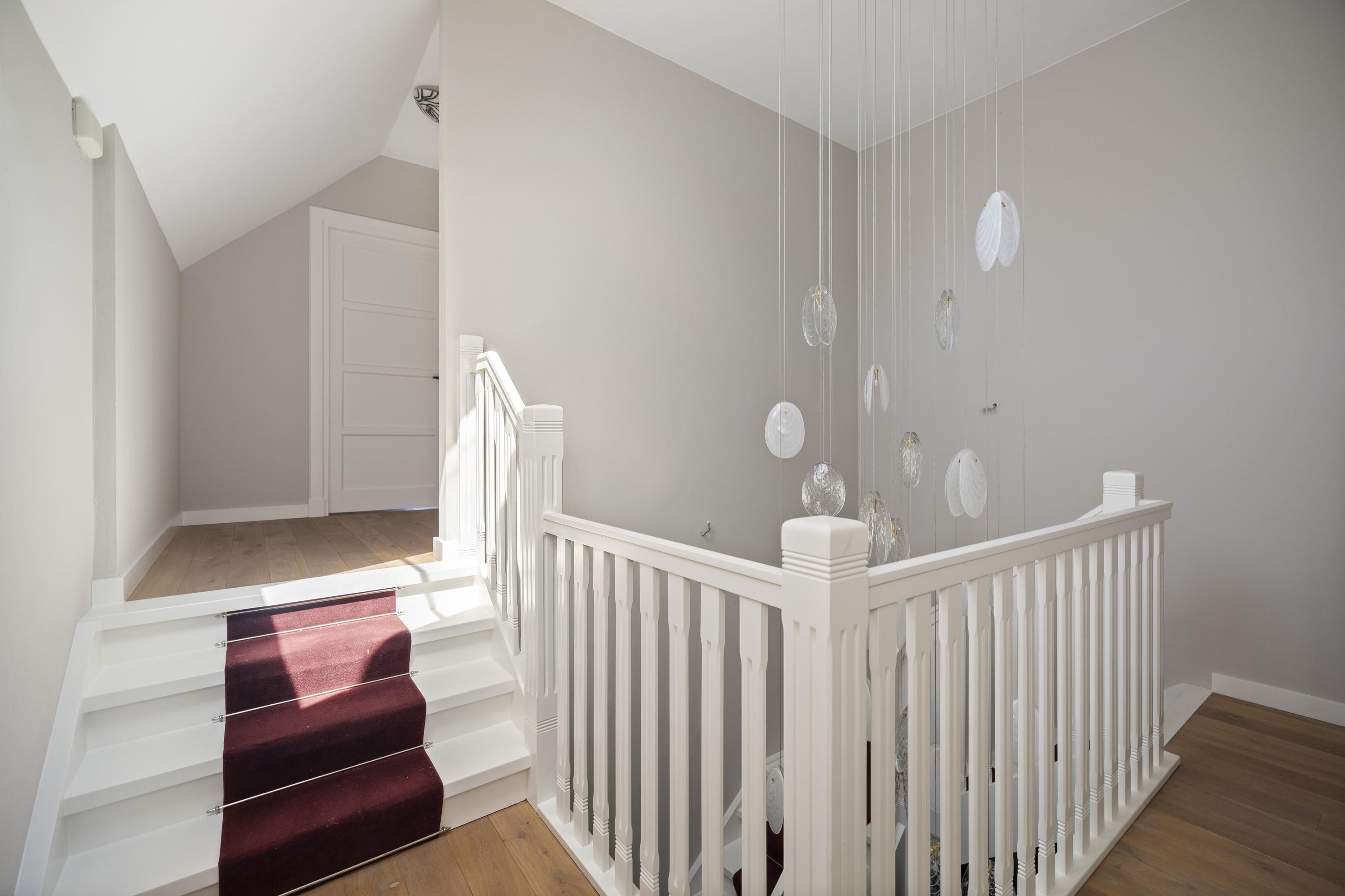 The light-filled landing leads to three bedrooms, two of which are suites with their own bathrooms. The master suite evokes the feel of a boutique hotel, complete with walk-in wardrobe and integrated bathroom with bath, walk-in shower, and twin basins. Indulging in the freestanding bath becomes all the more blissful when you light the glass-fronted fireplace. The landing also includes storage cupboards and a separate Geberit AquaClean WC.