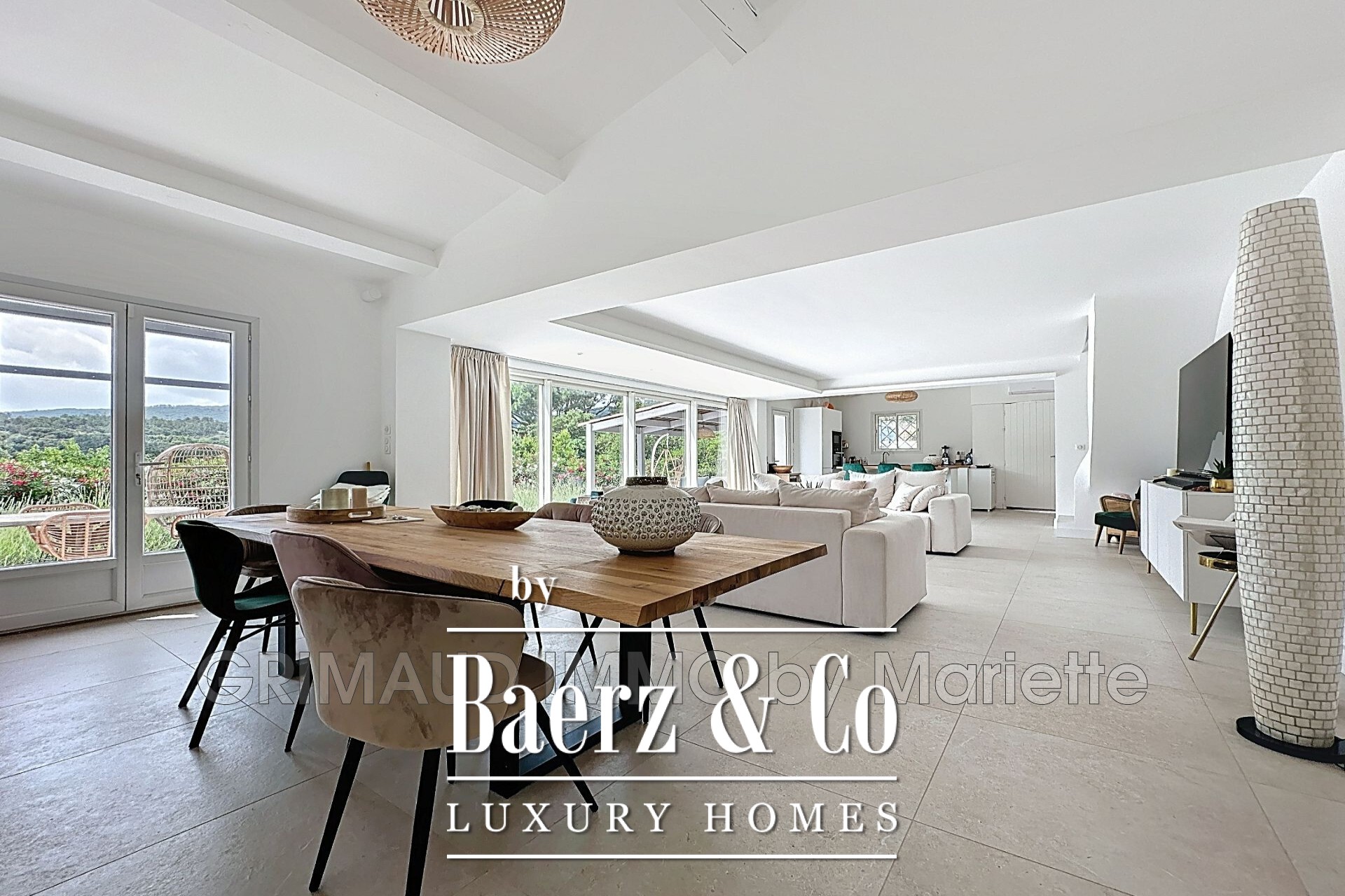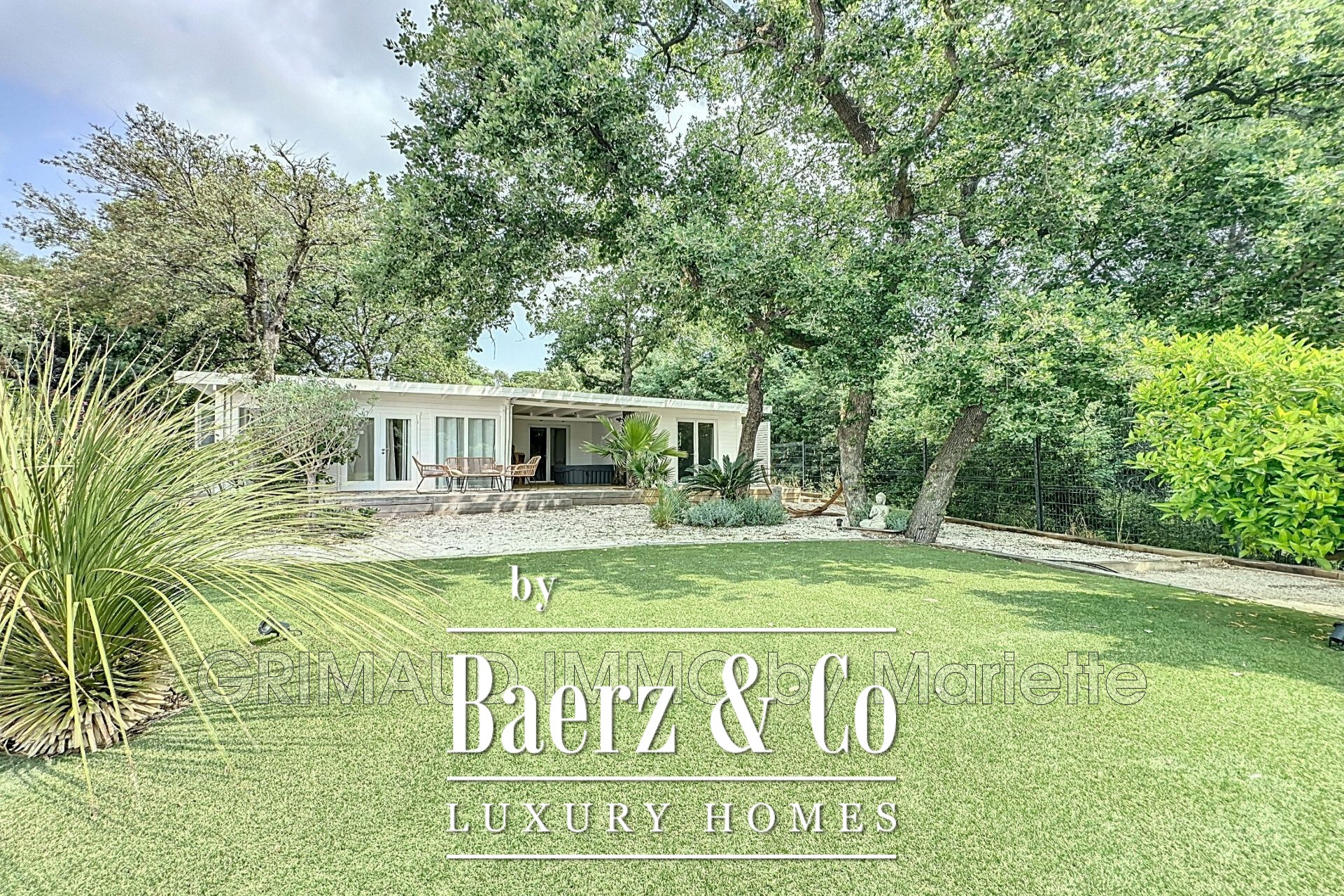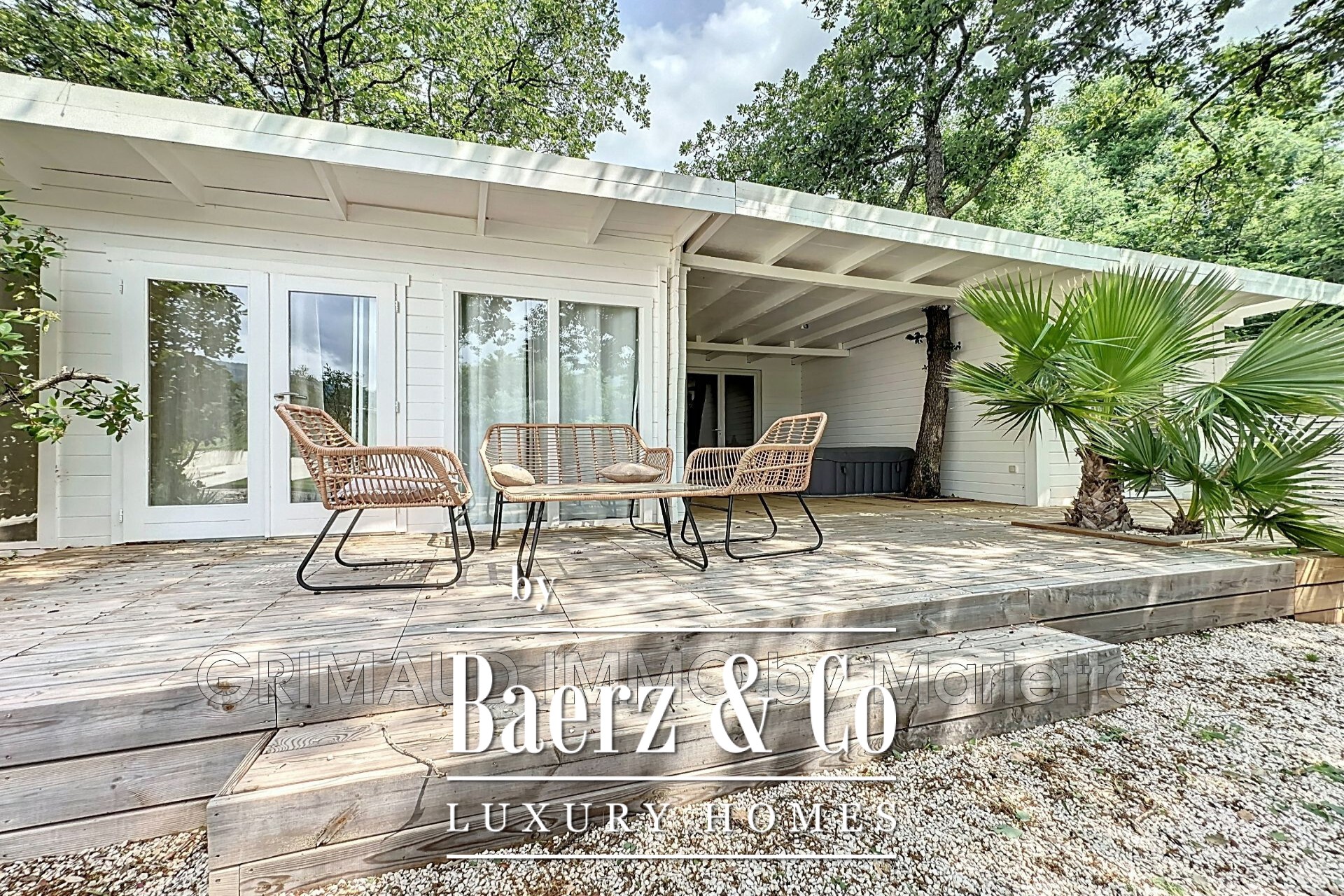 own shower room, a walk-in closet, and a charming view. Three separate wooden chalets, each with a shower room and WC, complete the property—perfect for hosting guests or as a rental opportunity. Parking is available for three vehicles. Within walking distance of the village center of Plan-de-la-Tour. For more properties, visit our website: www.grimaudimmo.com