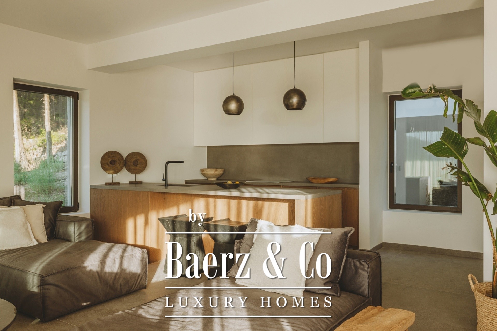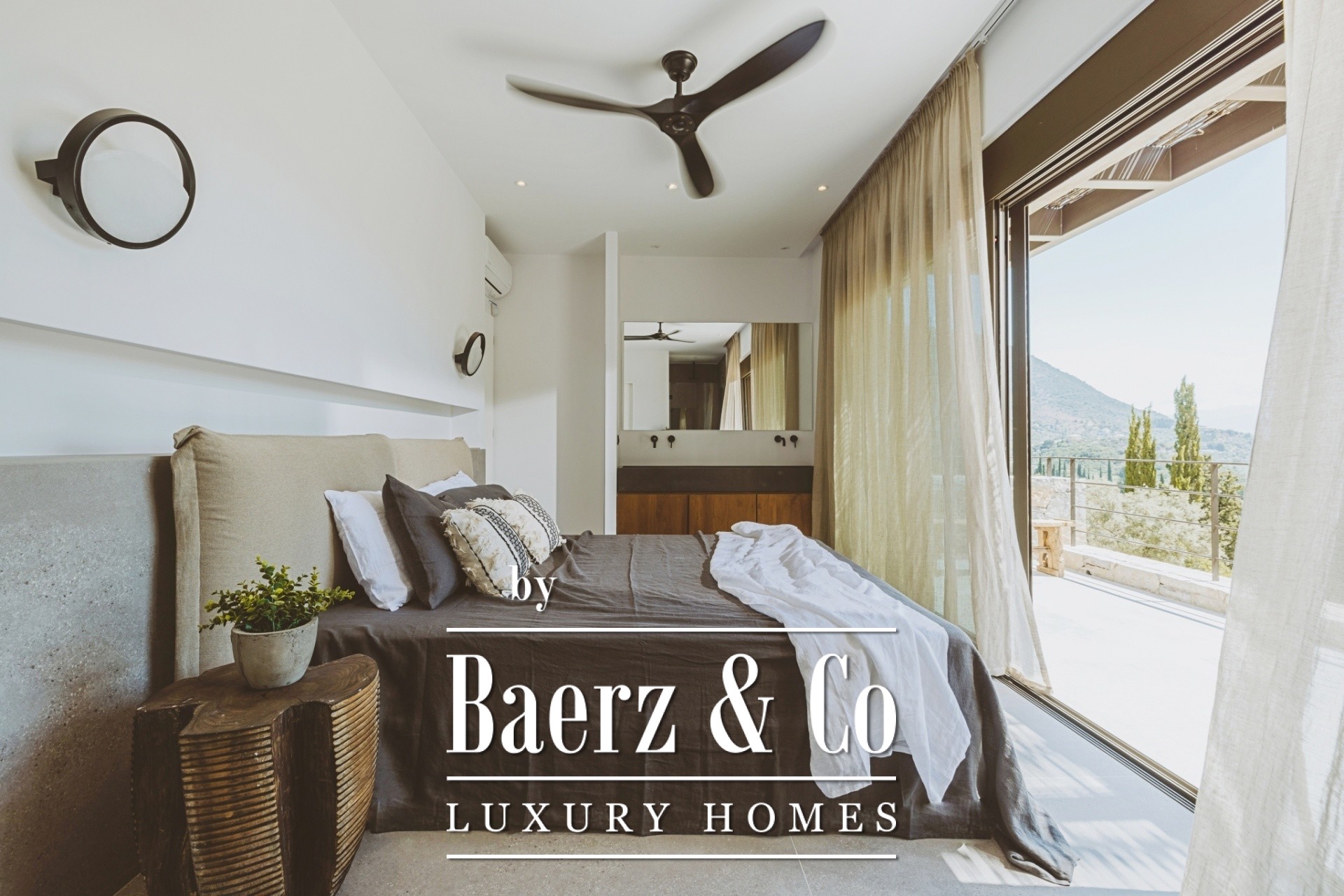 The entrance to the property opens into a spacious and elegant open-plan dining area, where the panoramic view of the endless blue Ionian blends seamlessly with modern architecture and luxury. The kitchen is integrated with the living room and, together with the interior dining area, harmony is evident everywhere. On the same level, there are two bedrooms, each with its own en-suite bathroom, ensuring comfort and privacy for guests or family members.