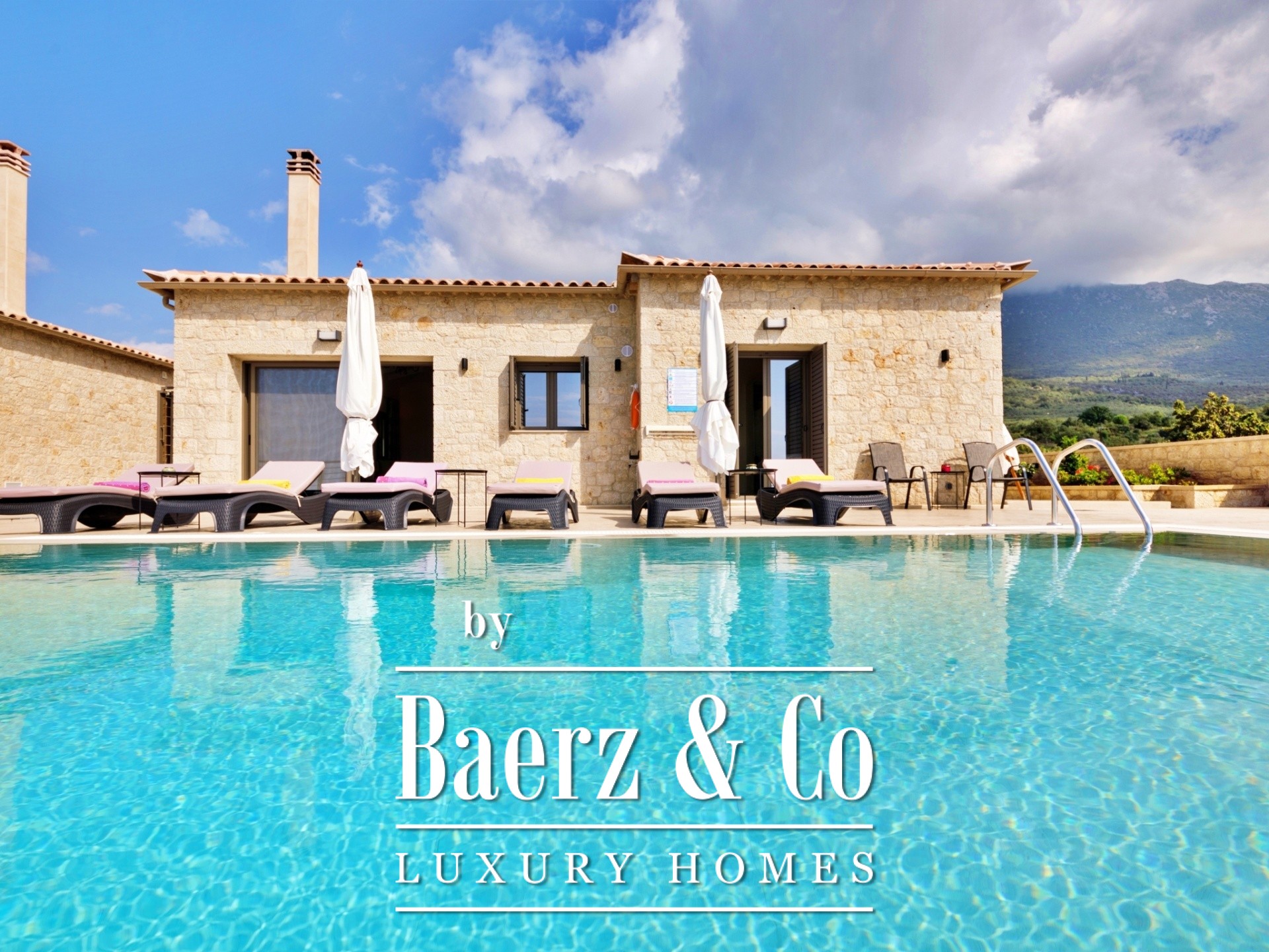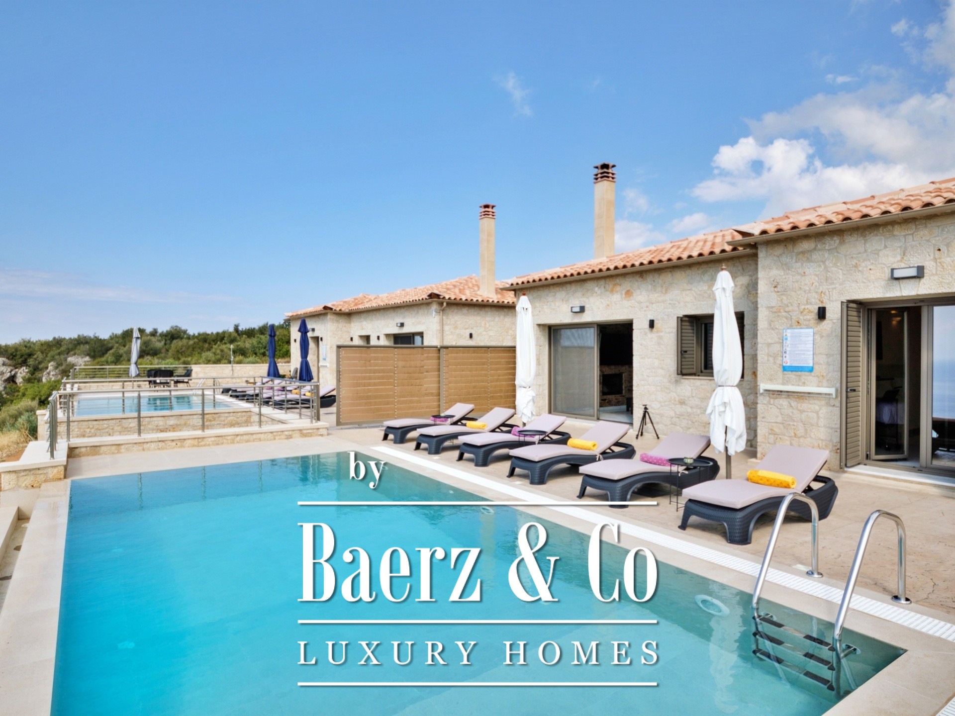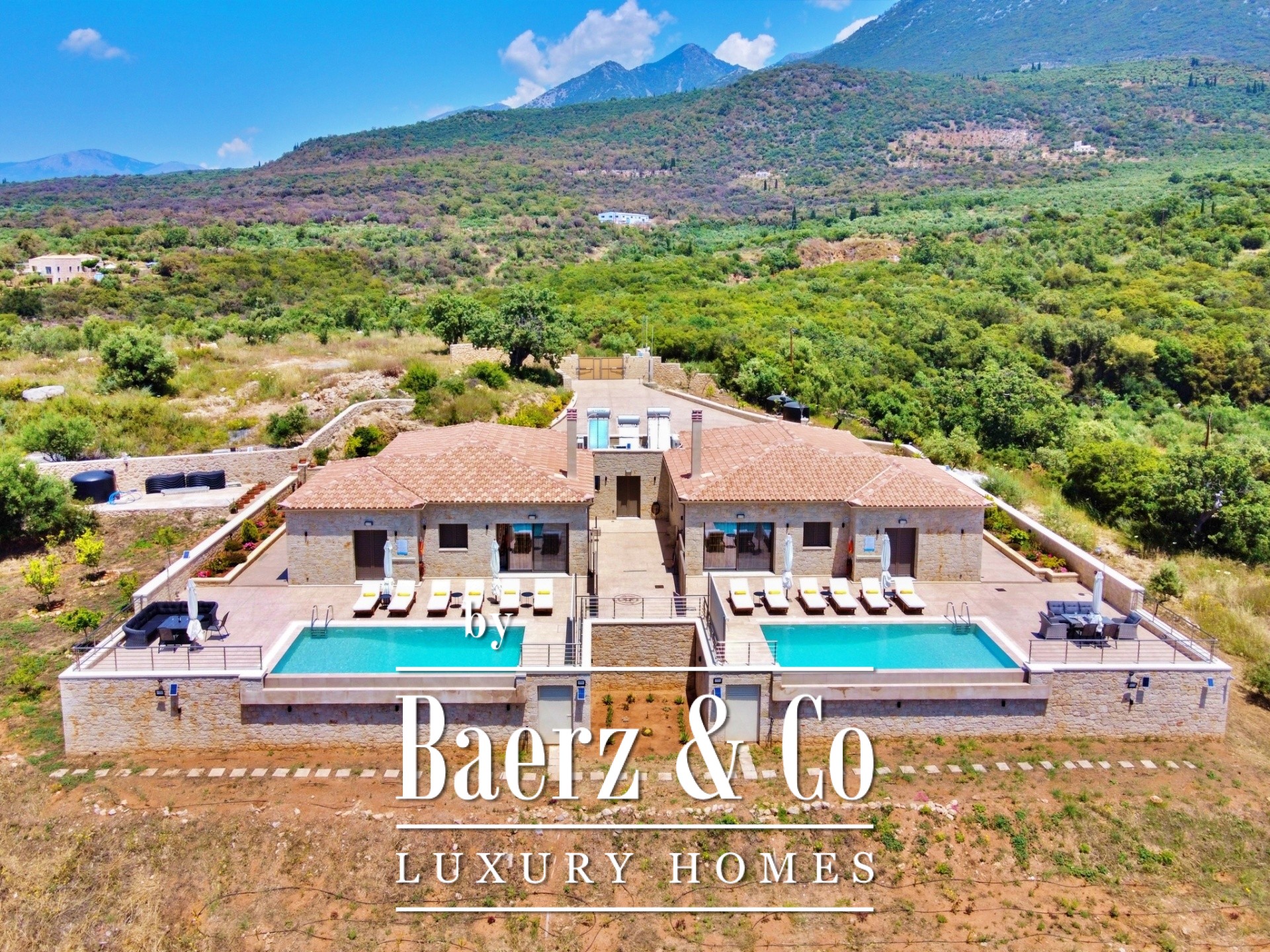 Selected property. Available for sale from our office is a complex of two independent villas with an independent guest house in Neochori of the Municipality of Lefktro. These are two identical villas of 152sqm each and are designed with simple lines and high quality materials. They are located within a plot of 8.012sqm with west orientation and literally on the most beautiful "balcony" of Western Mani. Each villa consists of a living room, dining room, open plan kitchen and 3 bedrooms, two of them with en-suite bathrooms. The aesthetics of the property in combination with the quality materials of construction and decoration give unparalleled harmony with the place. The residential complex is surrounded by olive trees and perched on top of a hill overlooking the
