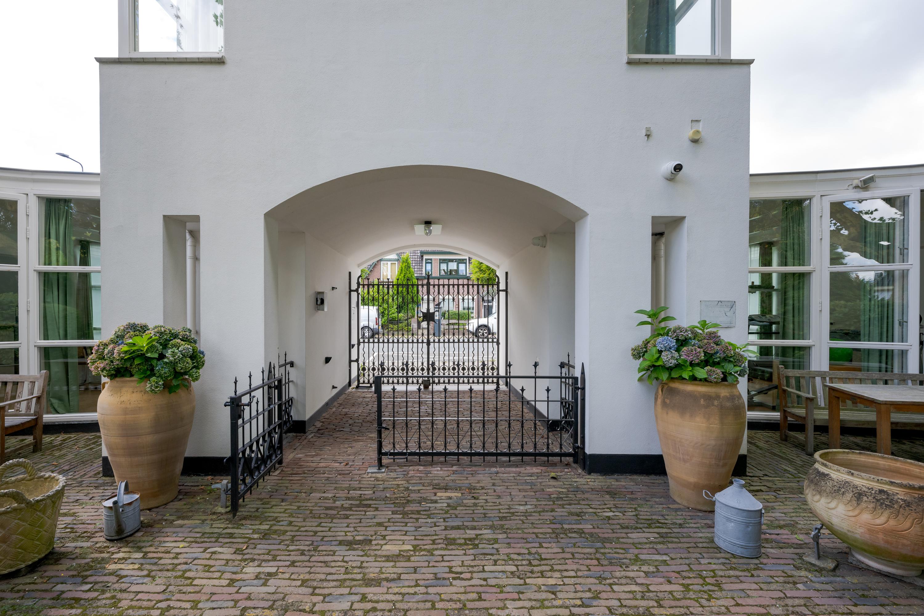 The gatehouse from 1995 is symmetrical in design with a central passage in the middle and on the ground floor an entrance on both the left and right sides. The left wing is used as an office, which also has a toilet, shower and pantry. The right wing is used as a fitness room and also has a toilet, shower and pantry. From both the left and right wings there is a staircase to the room above the gate, which is now furnished as a guest bedroom. The facade of the gatehouse consists largely of glass and has French doors to the garden in both wings, which ensures plenty of light and a connection to the inner garden.