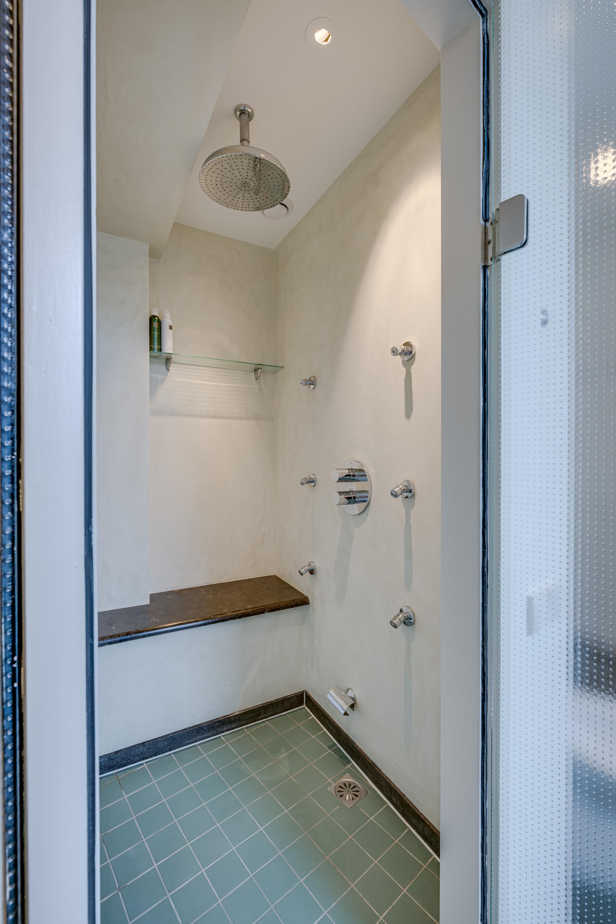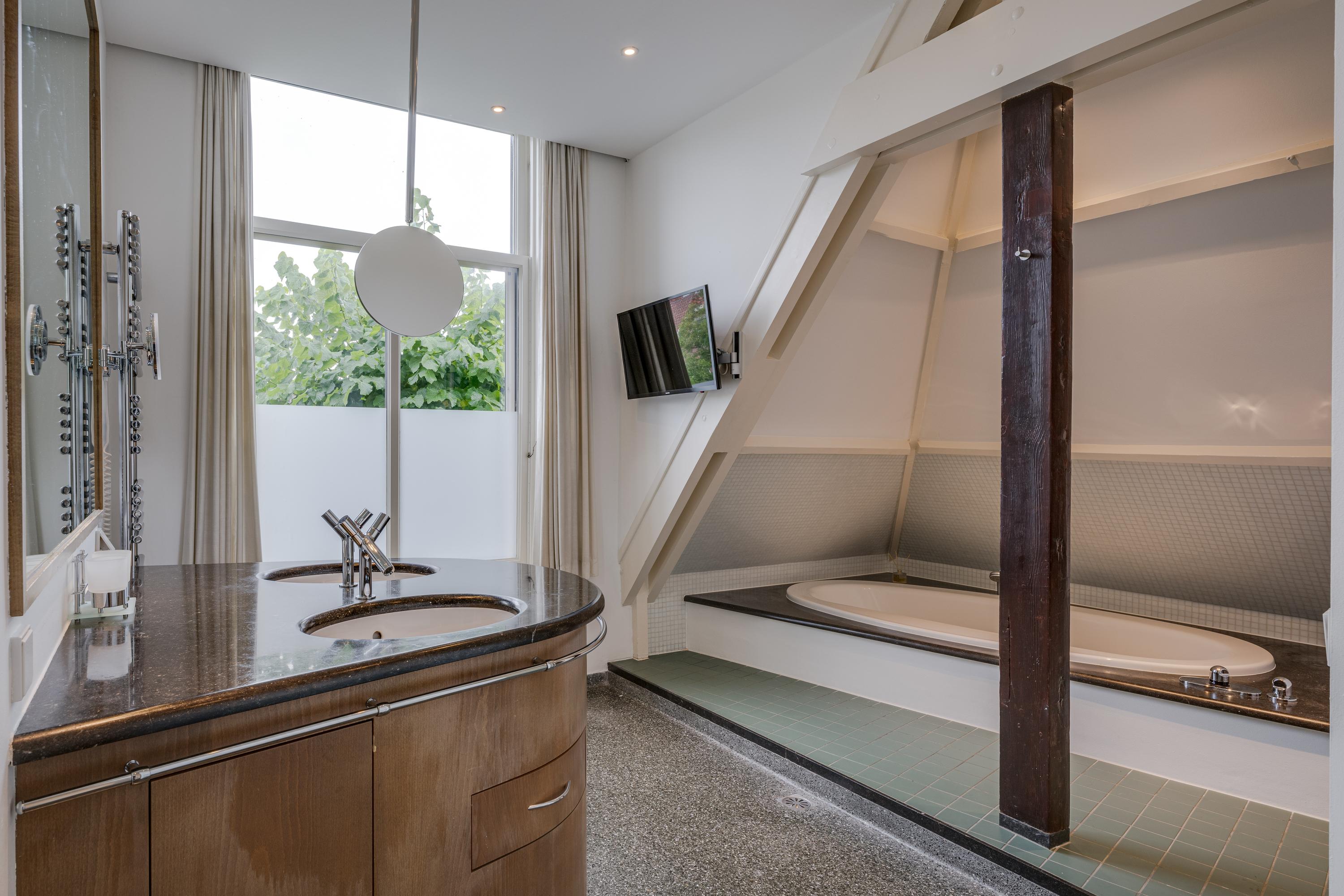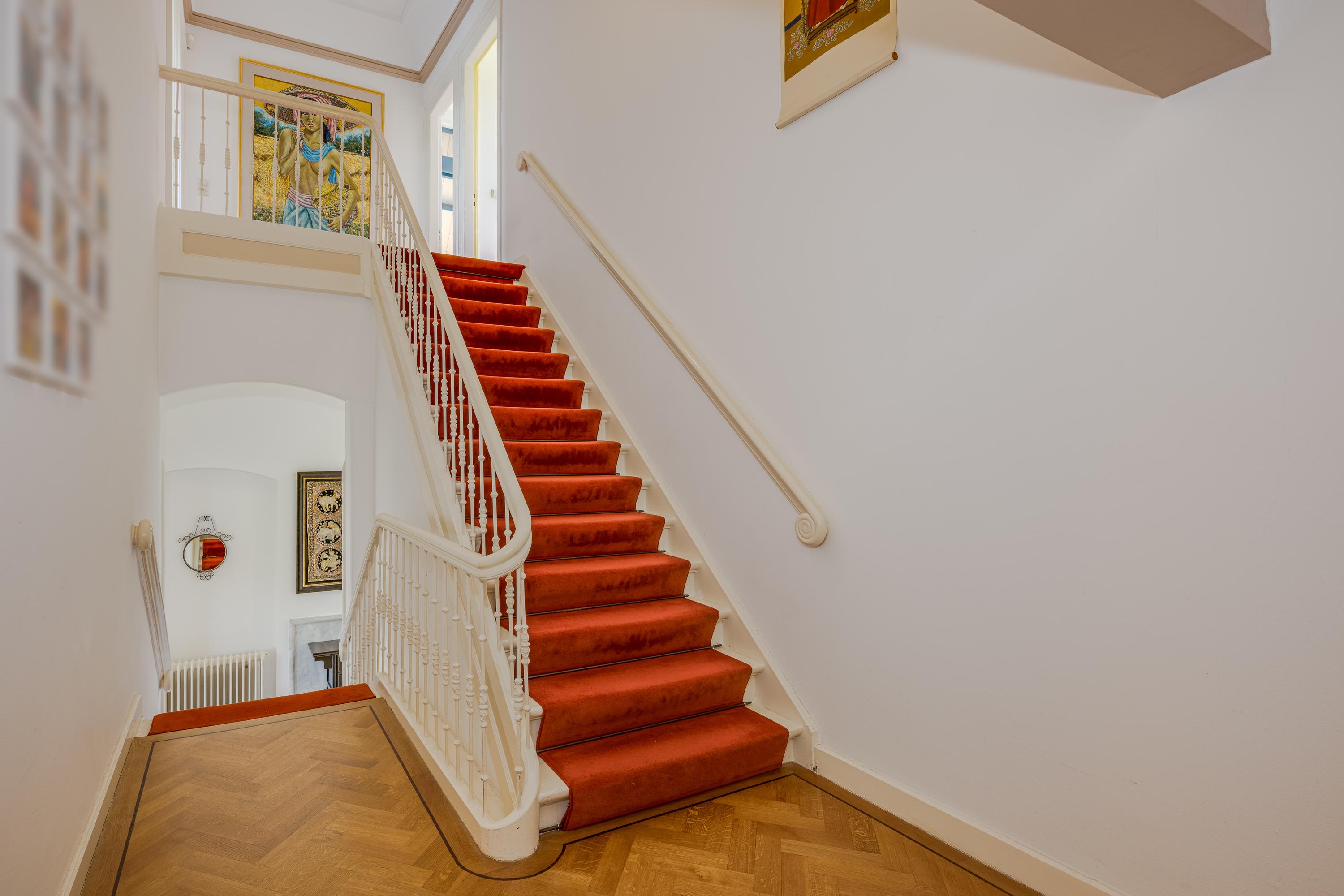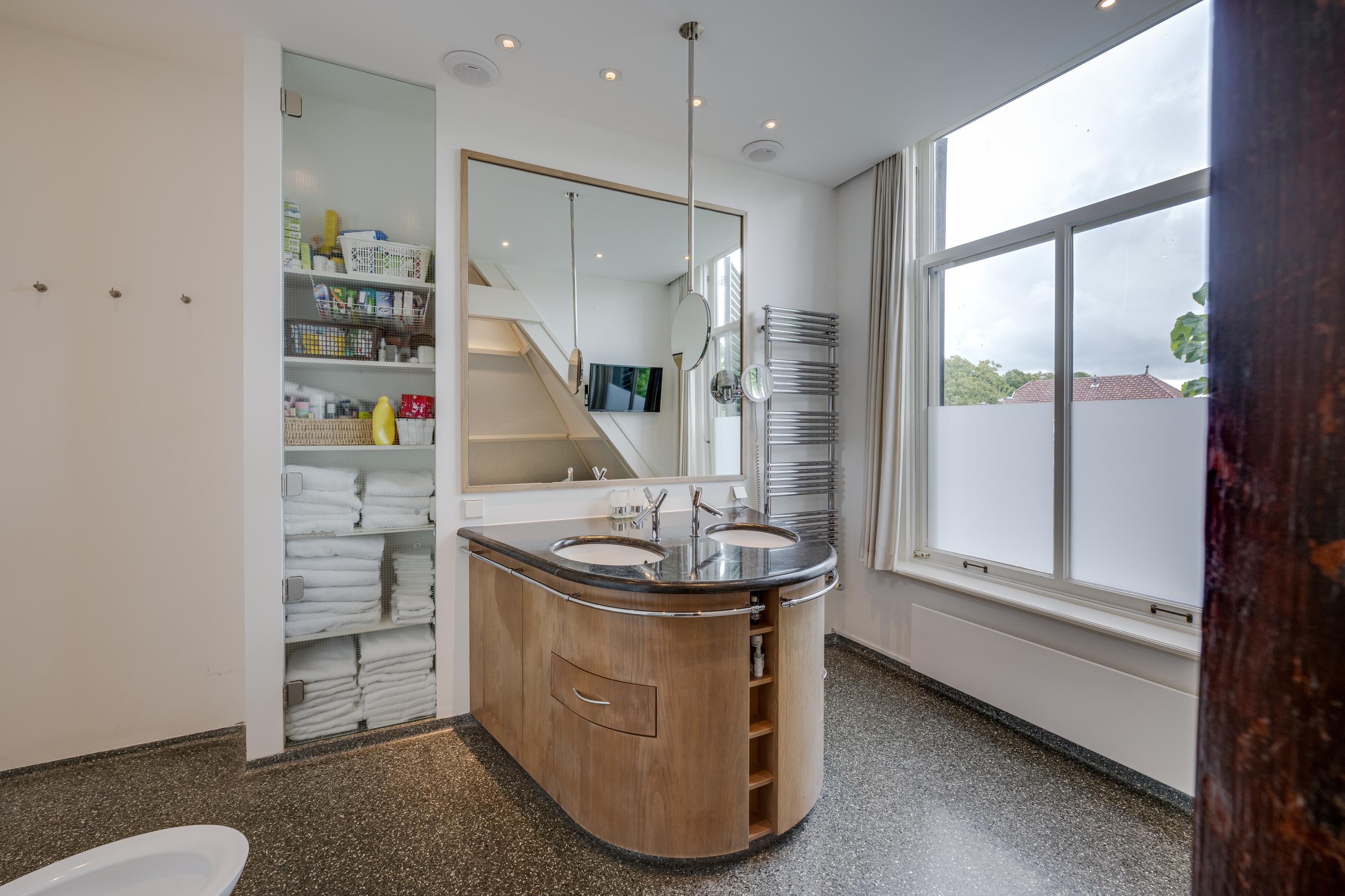 The landing staircase forms the heart of the house and the connection, with an access to a spacious toilet room with wall closet and fountain, to the sleeping floor. Here are three spacious bedrooms with the master bedroom on the water side and walk-in closet. The bedrooms are characterized by the high ceilings and the view of the garden and the water, with the master bedroom standing out because of its size. The bathroom is equipped with every luxury with a granite floor, underfloor heating and 2 washbasins built into natural stone. Not only hygiene, but also relaxation: in addition to a sunken duo bath, a shower room with rain shower and "Turkish bath", sauna, a wall bidet and a wall closet.