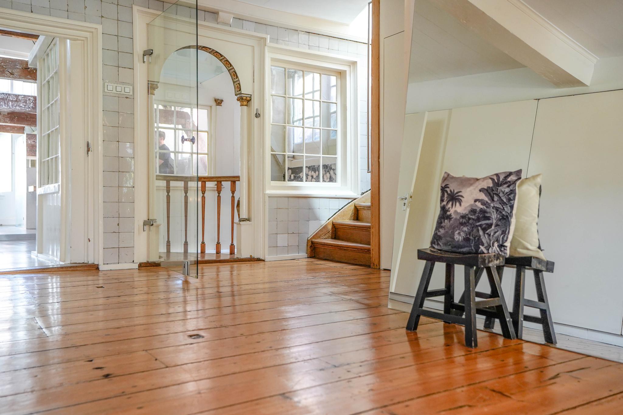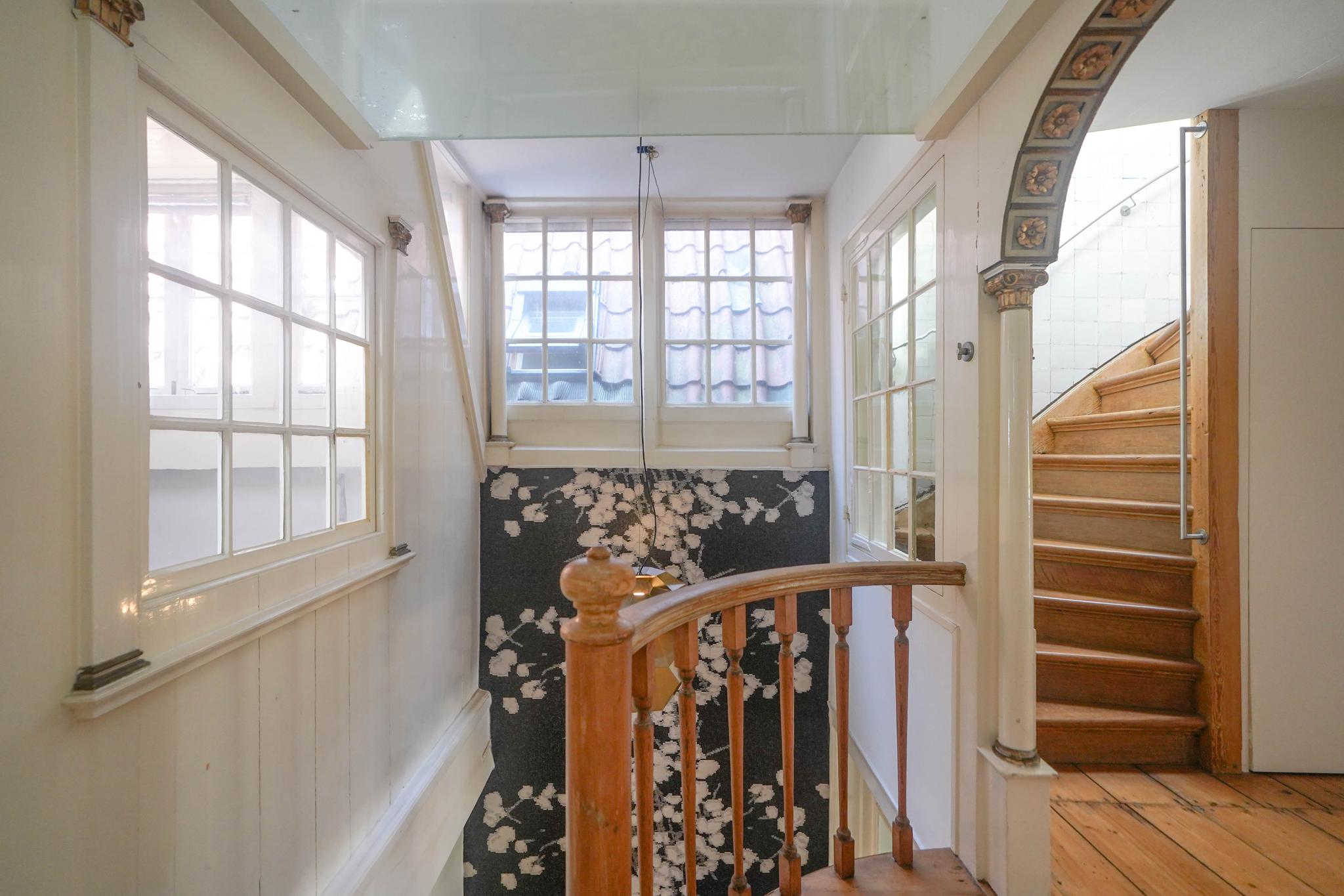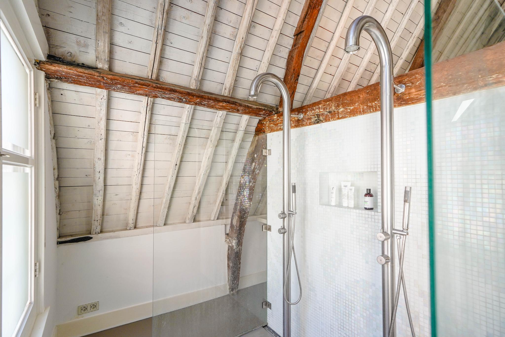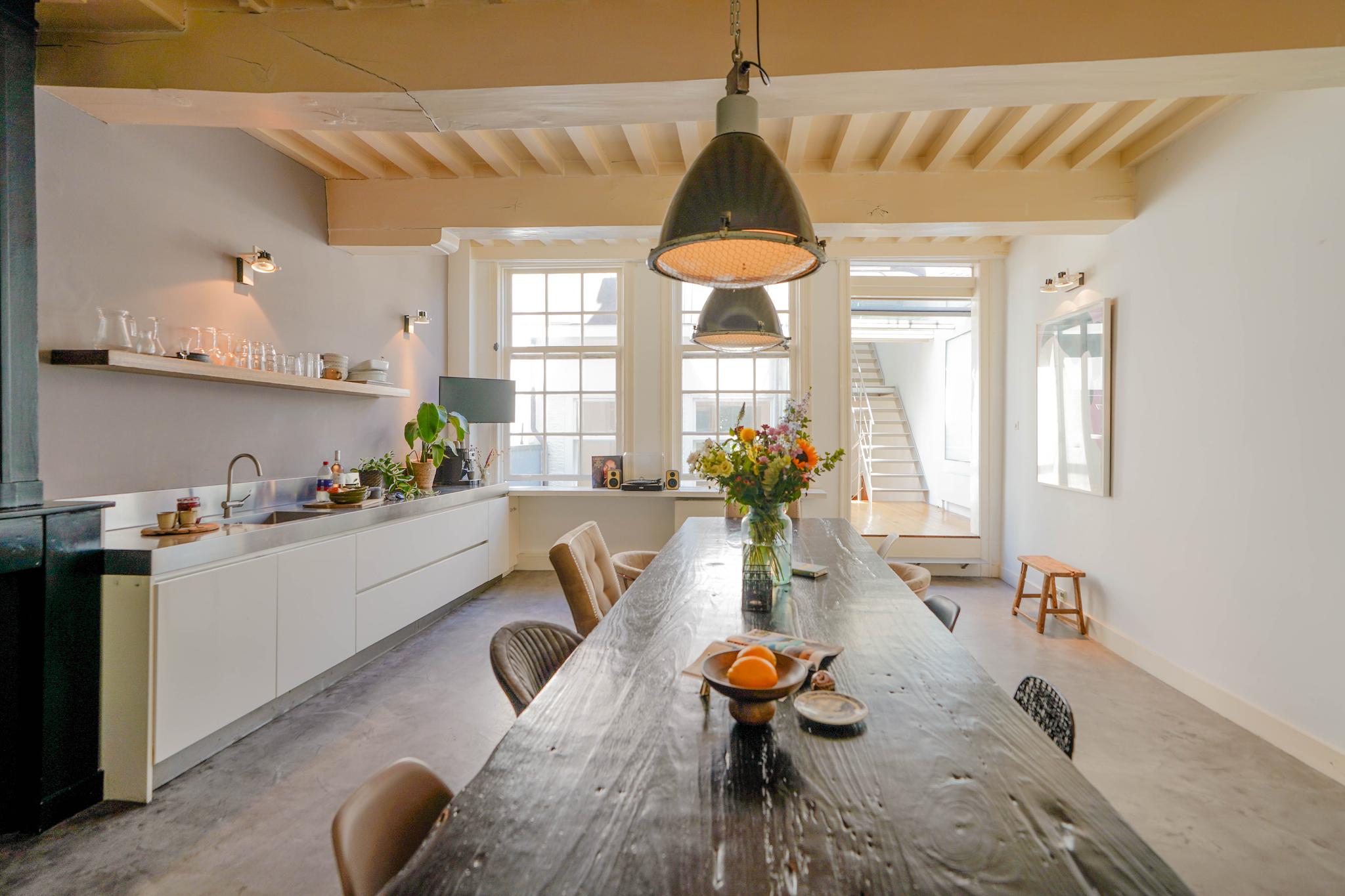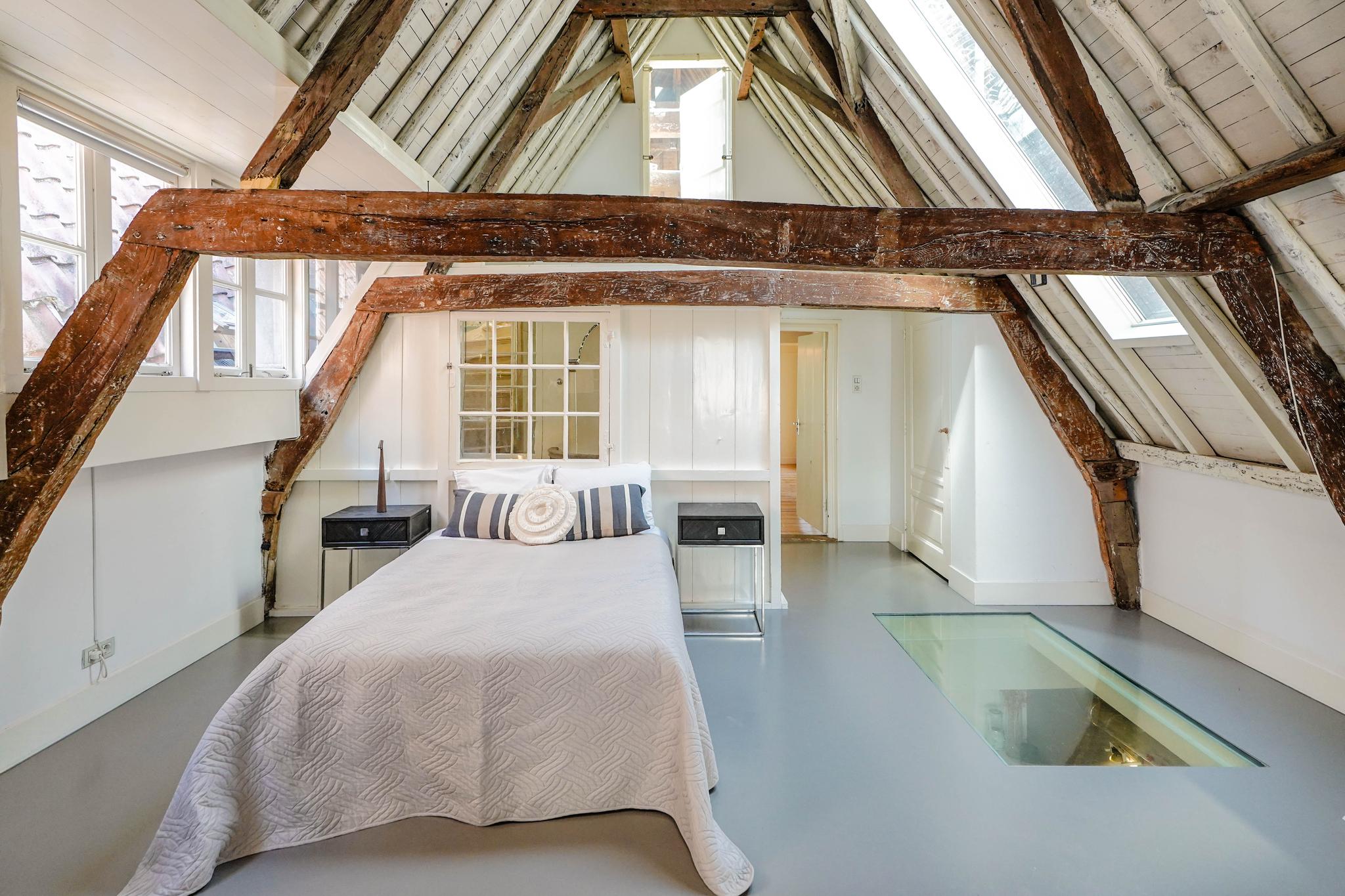 The front house is the original main house. In addition to the currently rented ground floor with shop, you will now find the living room of no less than 70 m² on the 1st floor from which you overlook the Rhine and the Stadhuisplein. At the rear is the kitchen/diner with space. A lot of space. With 50 m², long worktops and a dining table that seats 12, this is now the heart of the house. From here there is also one of the passages to the back house along the courtyard, which provides a lot of light. The sleeping floors are one floor higher. Here the house has been peeled back to the structure with the beautiful wooden siding roof in full view. High Velux windows have been installed between the tracks, providing beautiful light at any time of the day. At the front you will find three bedrooms, a bathroom and, above all, plenty of storage space with fitted wardrobes and a linen room, spread over two floors. At the rear, the master bedroom with ensuite bathroom covers the entire roof with a ridge of no less than 8 meters high.