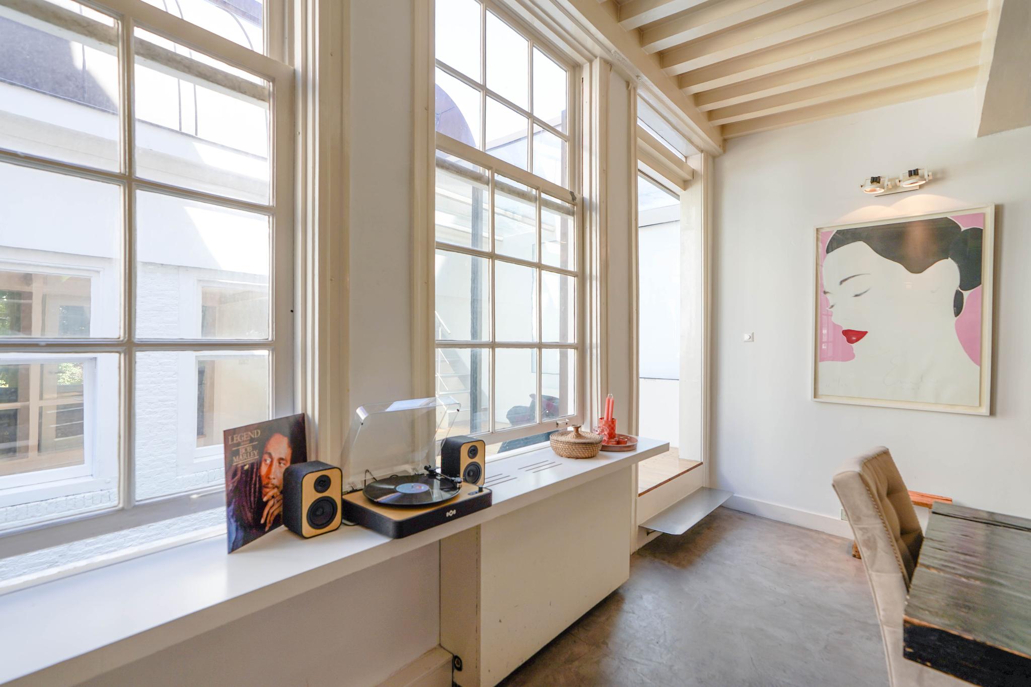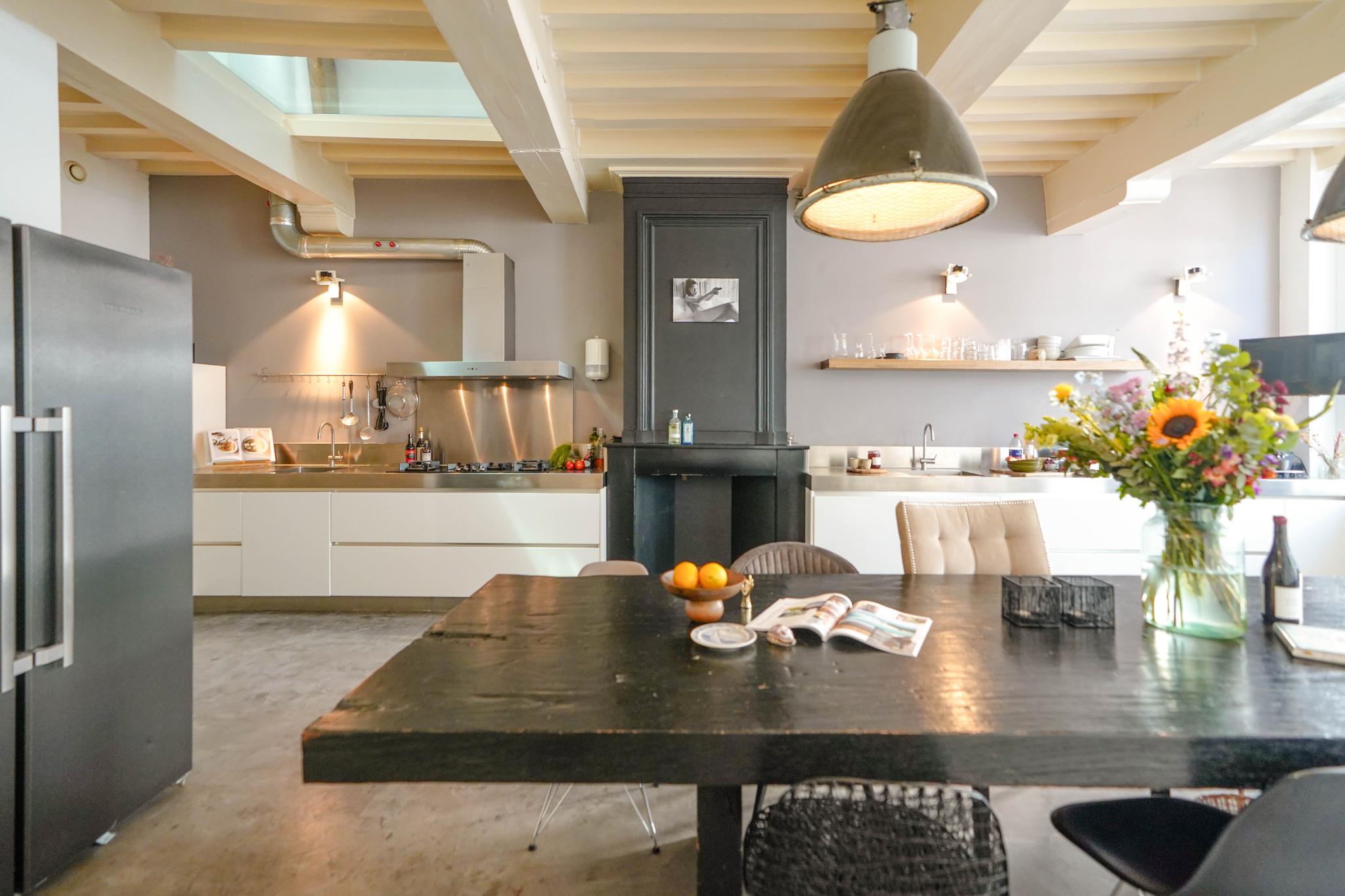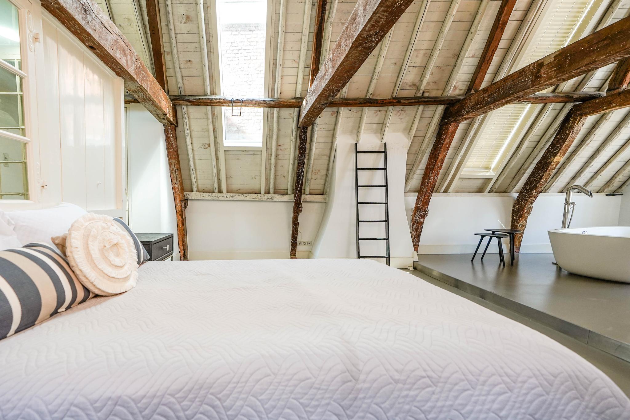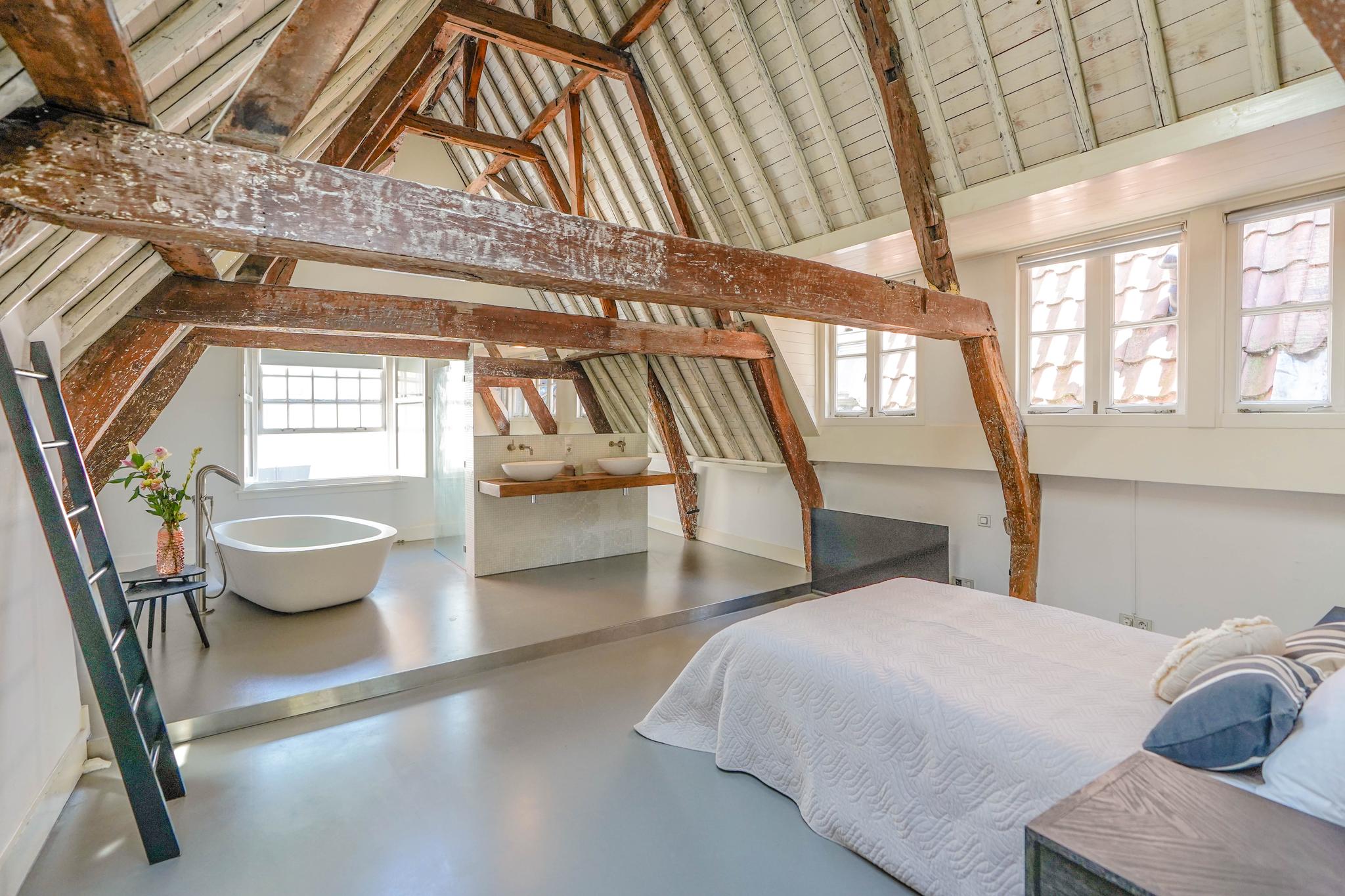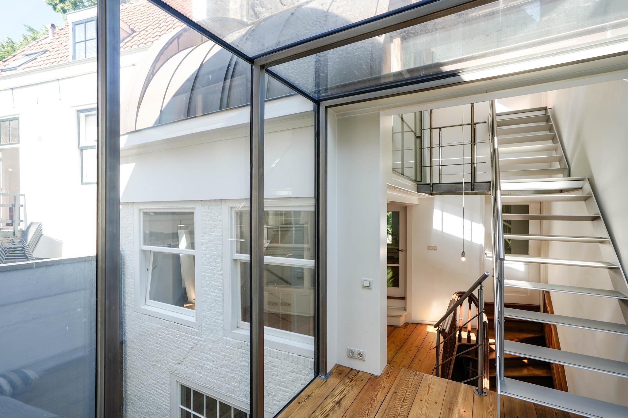 The front house is the original main house. In addition to the currently rented ground floor with shop, you will now find the living room of no less than 70 m² on the 1st floor from which you overlook the Rhine and the Stadhuisplein. At the rear is the kitchen/diner with space. A lot of space. With 50 m², long worktops and a dining table that seats 12, this is now the heart of the house. From here there is also one of the passages to the back house along the courtyard, which provides a lot of light. The sleeping floors are one floor higher. Here the house has been peeled back to the structure with the beautiful wooden siding roof in full view. High Velux windows have been installed between the tracks, providing beautiful light at any time of the day. At the front you will find three bedrooms, a bathroom and, above all, plenty of storage space with fitted wardrobes and a linen room, spread over two floors. At the rear, the master bedroom with ensuite bathroom covers the entire roof with a ridge of no less than 8 meters high.