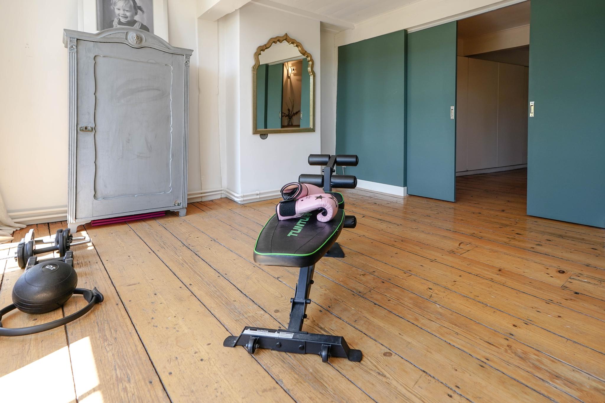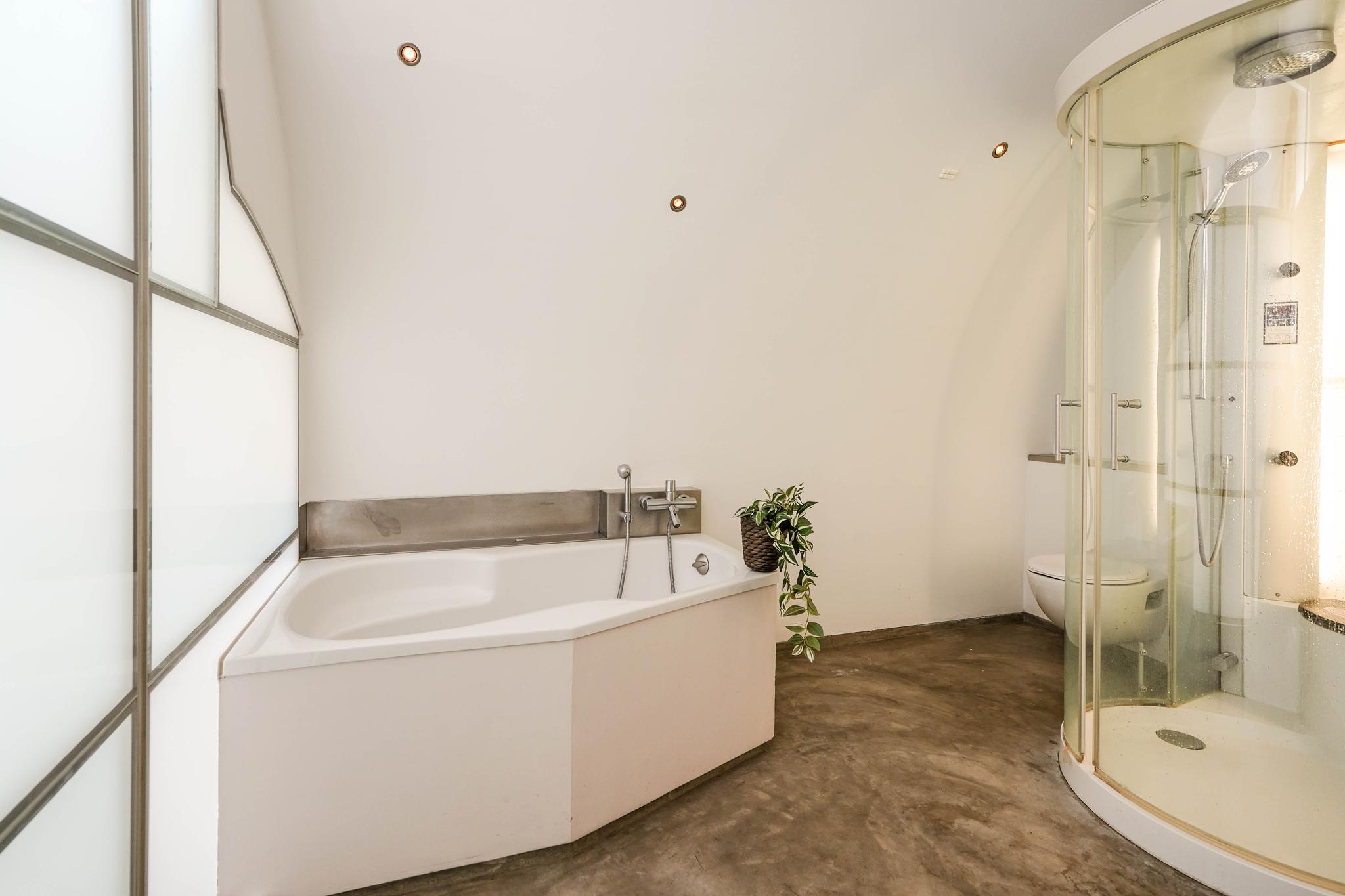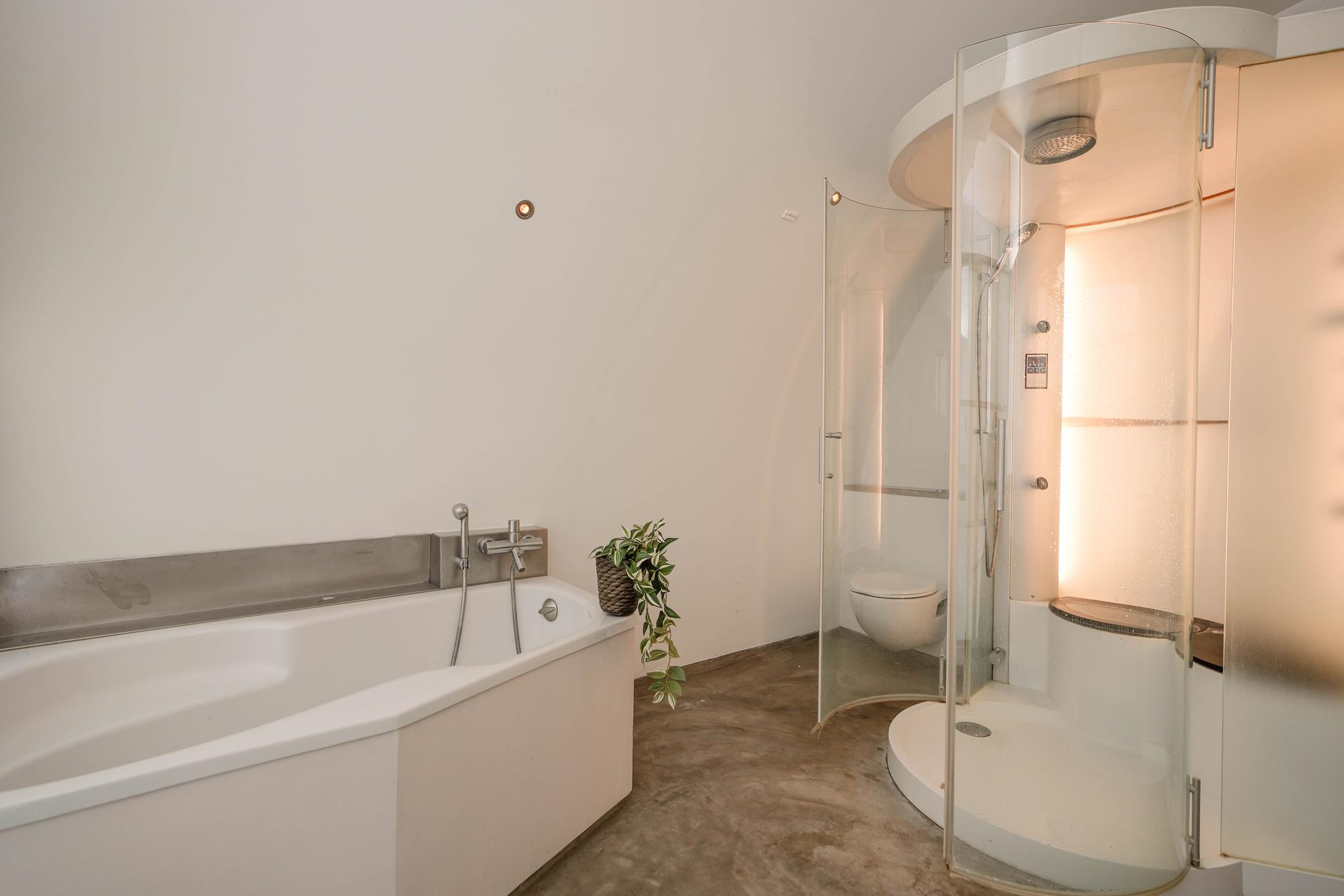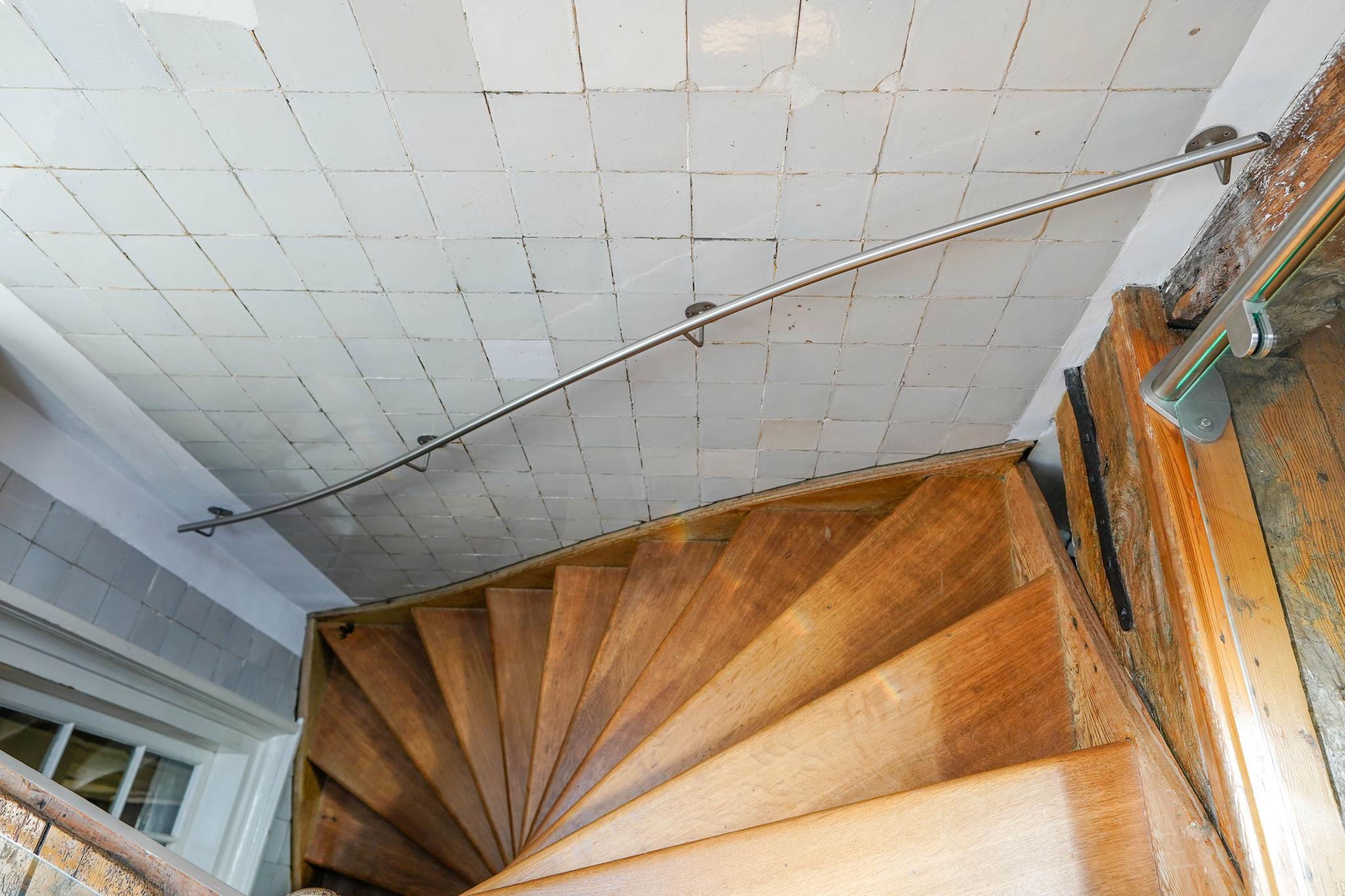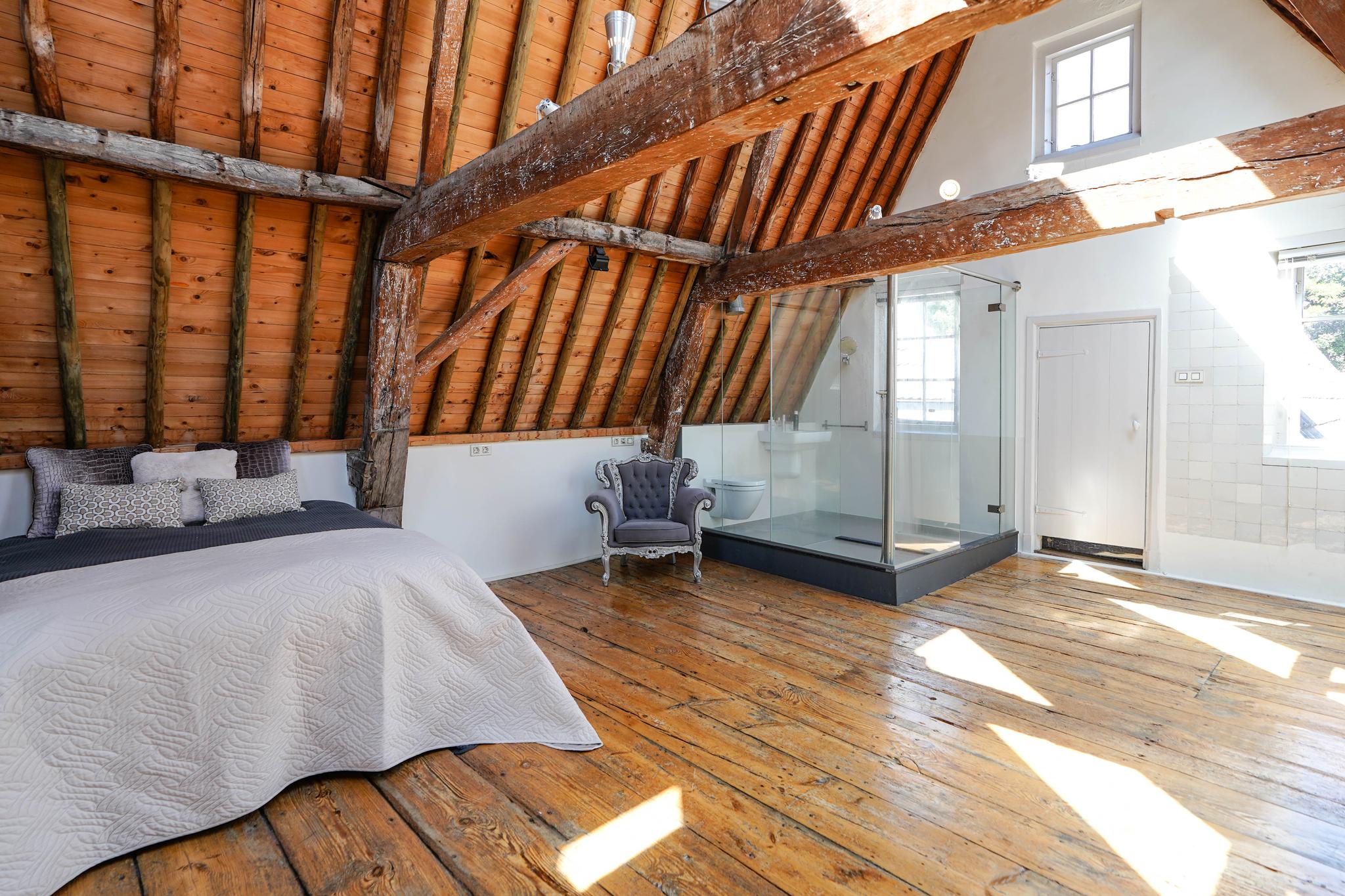 The front house is the original main house. In addition to the currently rented ground floor with shop, you will now find the living room of no less than 70 m² on the 1st floor from which you overlook the Rhine and the Stadhuisplein. At the rear is the kitchen/diner with space. A lot of space. With 50 m², long worktops and a dining table that seats 12, this is now the heart of the house. From here there is also one of the passages to the back house along the courtyard, which provides a lot of light. The sleeping floors are one floor higher. Here the house has been peeled back to the structure with the beautiful wooden siding roof in full view. High Velux windows have been installed between the tracks, providing beautiful light at any time of the day. At the front you will find three bedrooms, a bathroom and, above all, plenty of storage space with fitted wardrobes and a linen room, spread over two floors. At the rear, the master bedroom with ensuite bathroom covers the entire roof with a ridge of no less than 8 meters high.
