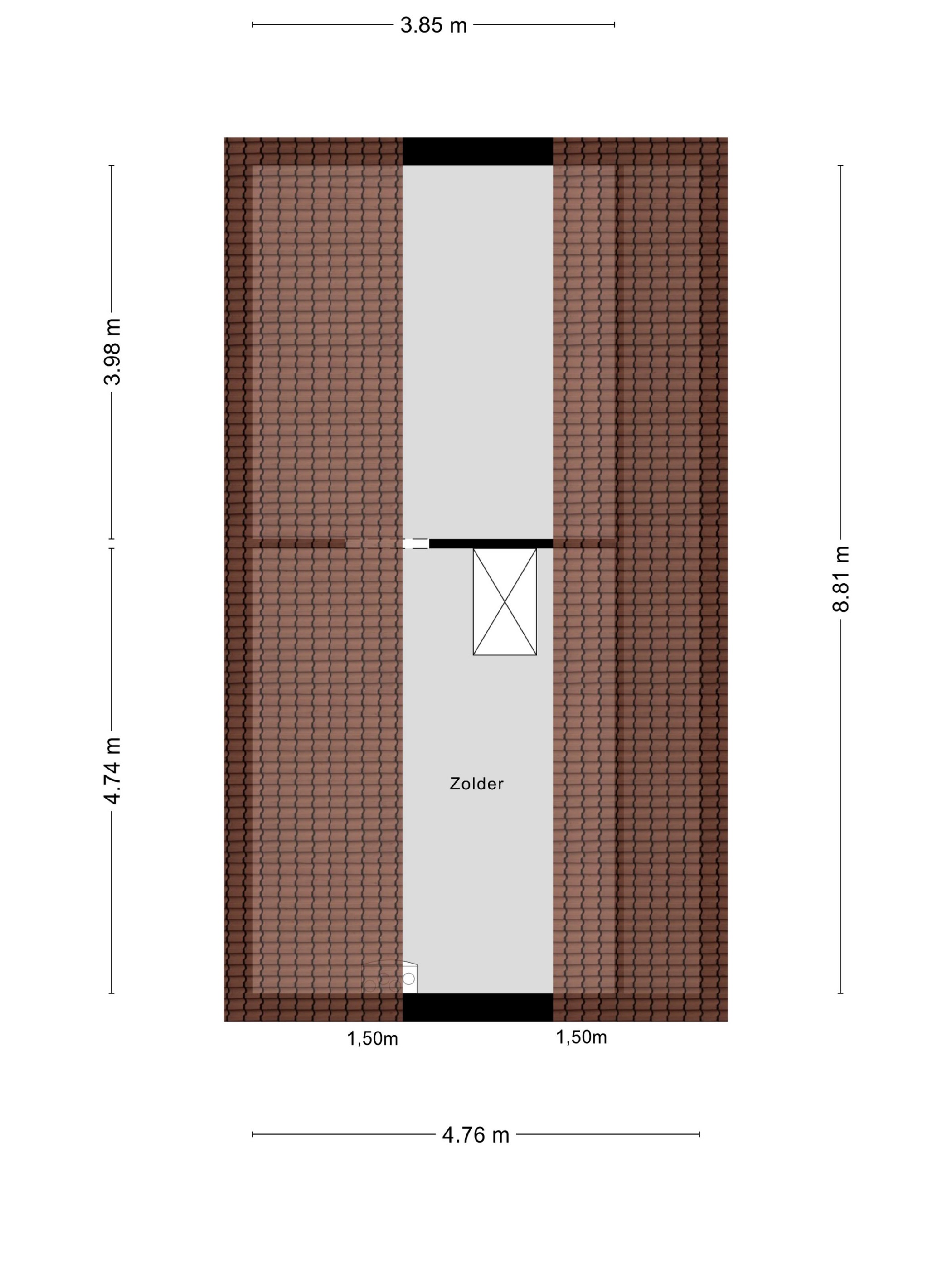 Open zolderruimte ten behoeve van extra opslag, vv. opstelplaats WTW-systeem, wandafwerking sauswerk, vloer afgewerkt met tapijt, dakplaten in het zicht.