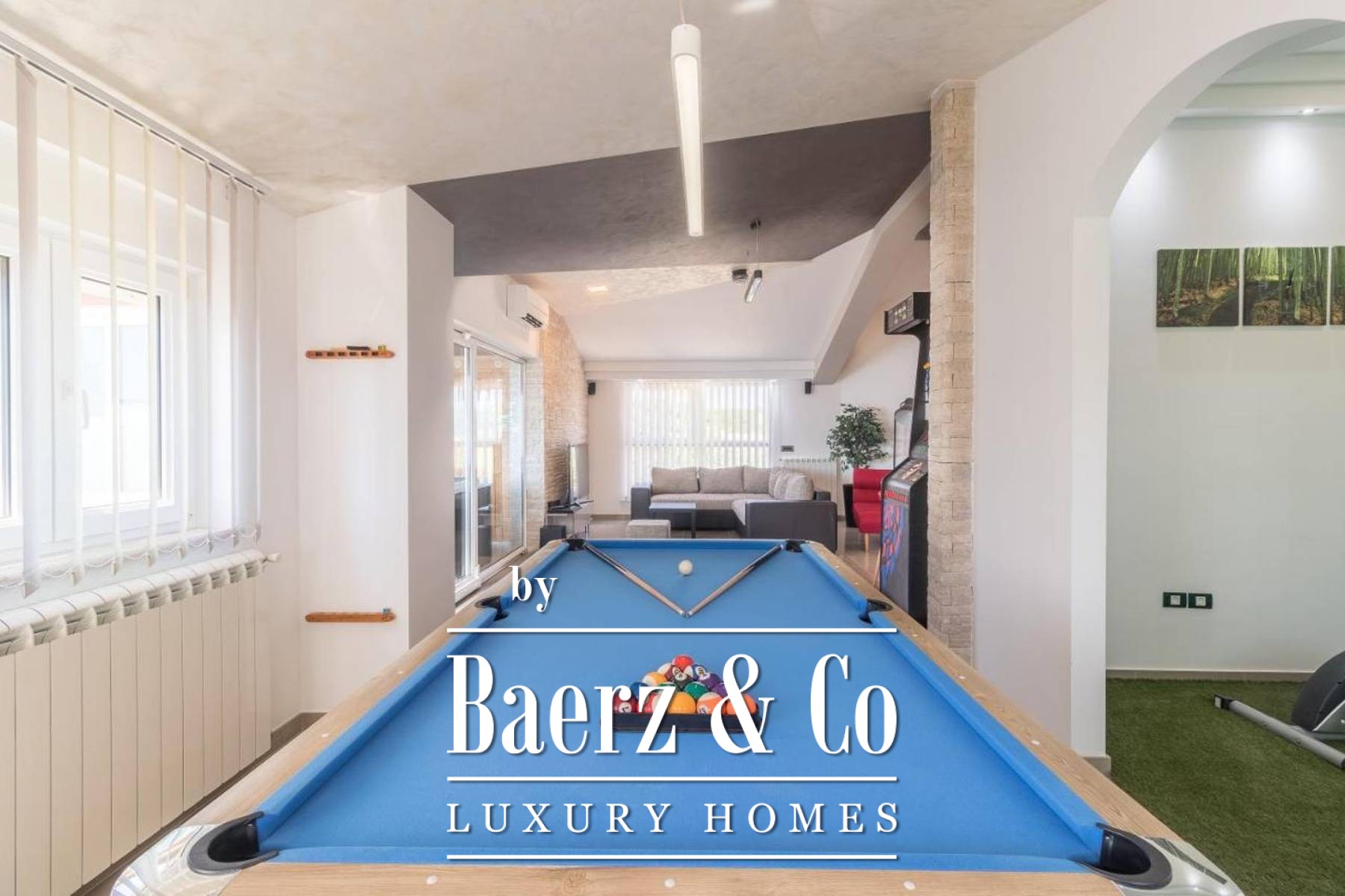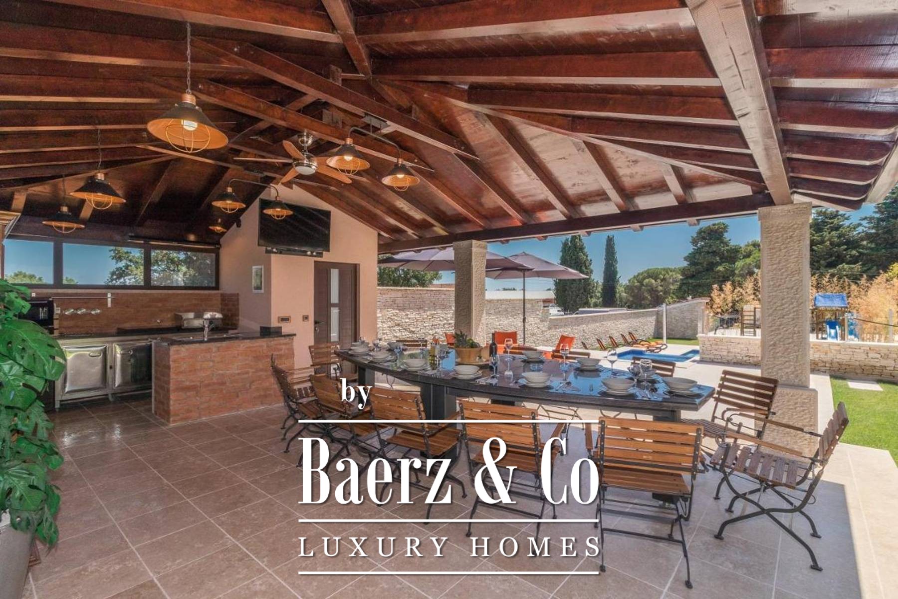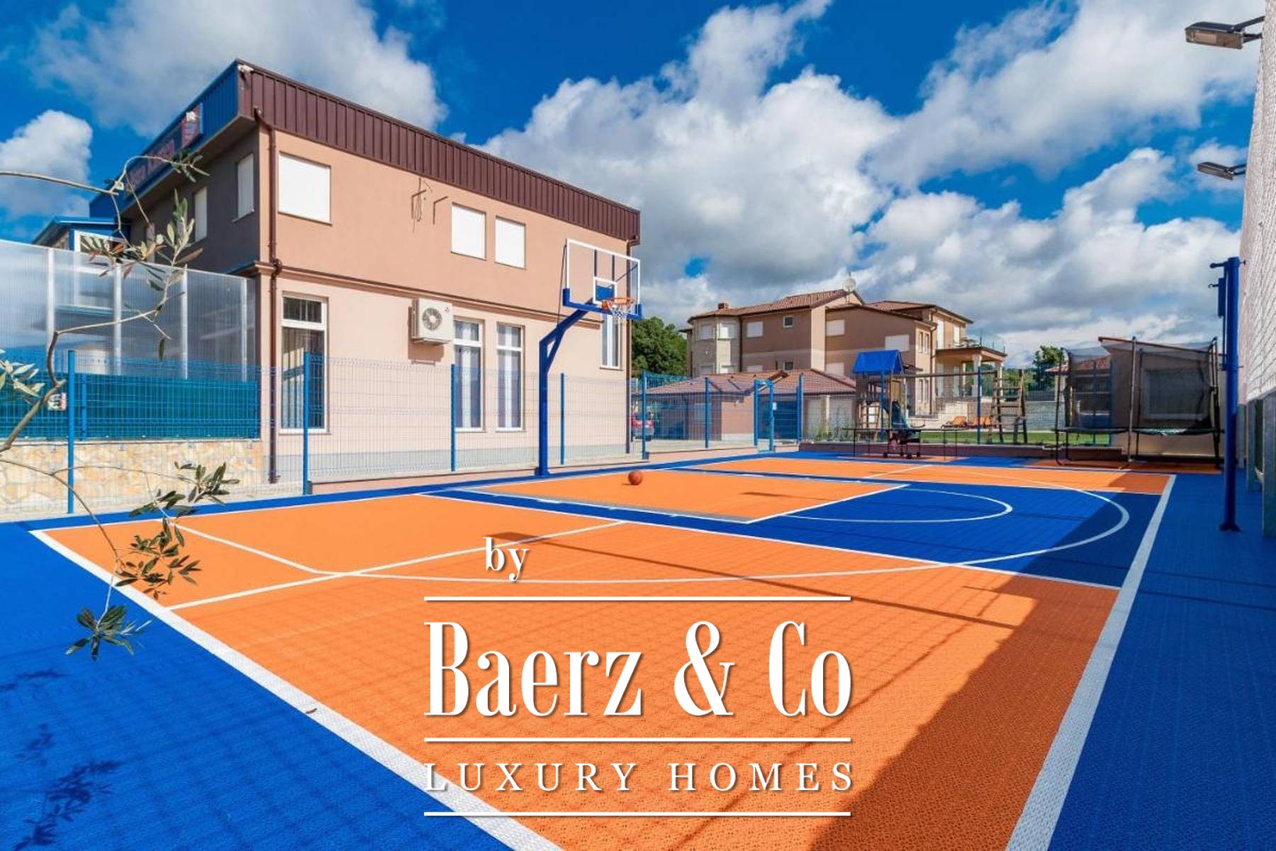 Villa Ližnjan with heated pool in southern Istria is defined by its 400 m² of refined living space, seven bedrooms, and sweeping views of the surrounding landscape. This villa stands on a 1,636 m² plot, offering total immersion in nature while remaining near Pula, the Adriatic, and local amenities. The ground floor welcomes with a kitchen, living, and dining areas opening to the porch and landscaped gardens, creating a seamless indoor-outdoor rhythm. On the first and second floors, the layout features six bedrooms, each with balconies that frame nature, and master suites equipped with both bathtubs and showers. A large terrace takes full advantage of the views, with a jacuzzi set against the landscape. Outdoors, a heated pool illuminated by LED lighting is complemented by a spa zone, while the fully equipped summer kitchen and dining area invite gatherings for twelve beneath a shaded porch. The architecture balances natural stone and granite, imbuing the residence with understated elegance. Recreational amenities include table tennis, billiards, darts, a fitness room, sauna, whirlpool, a playground, and a private basketball court. Villa Ližnjan positions itself as a distinctive opportunity among luxury villas for sale in Ližnjan, catering to those who seek privacy, quality, and a strong sense of place in Croatia’s Istrian heartland.