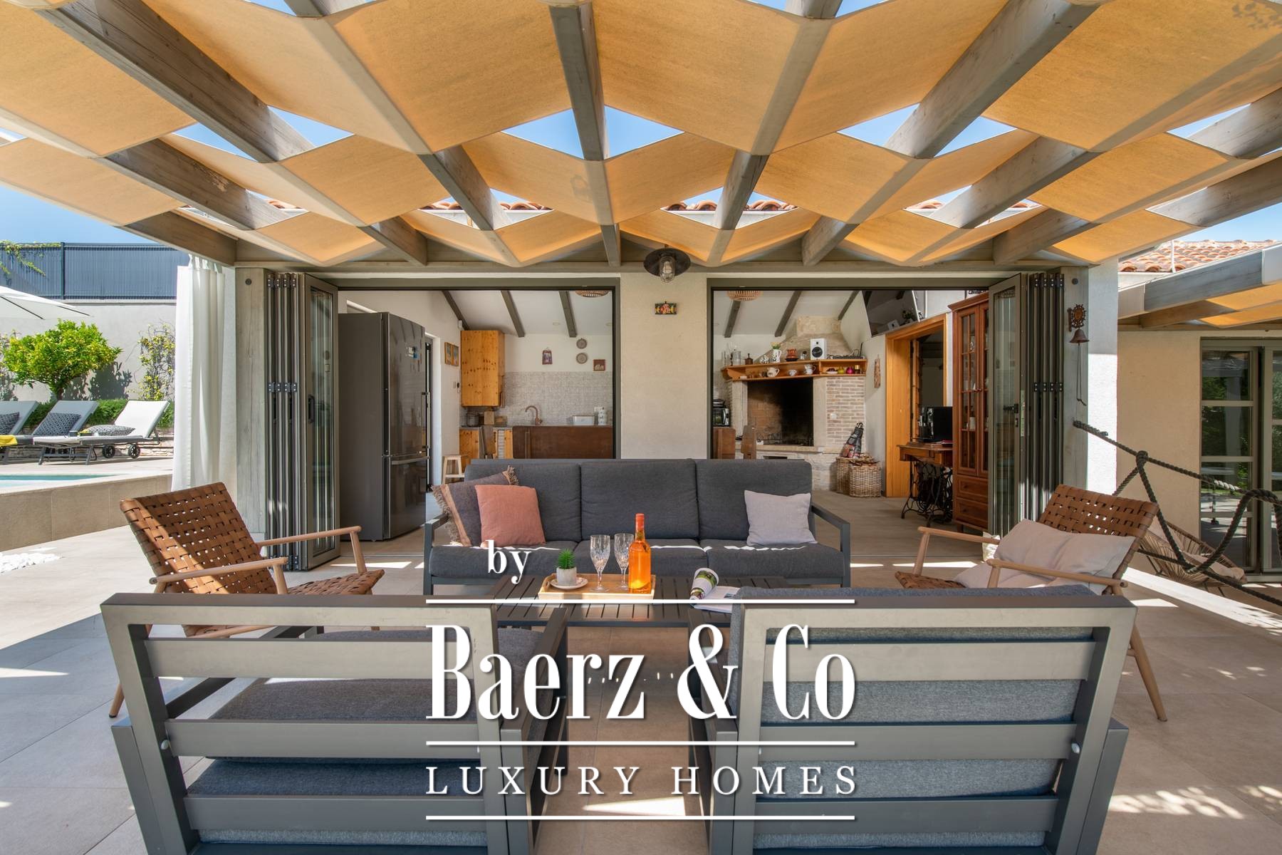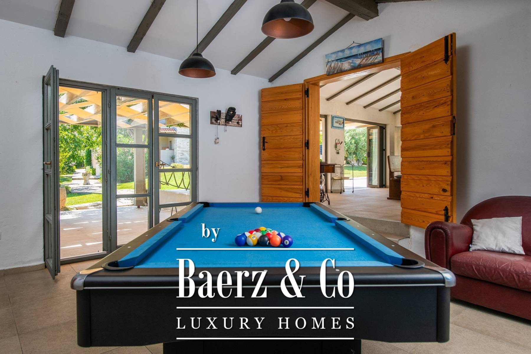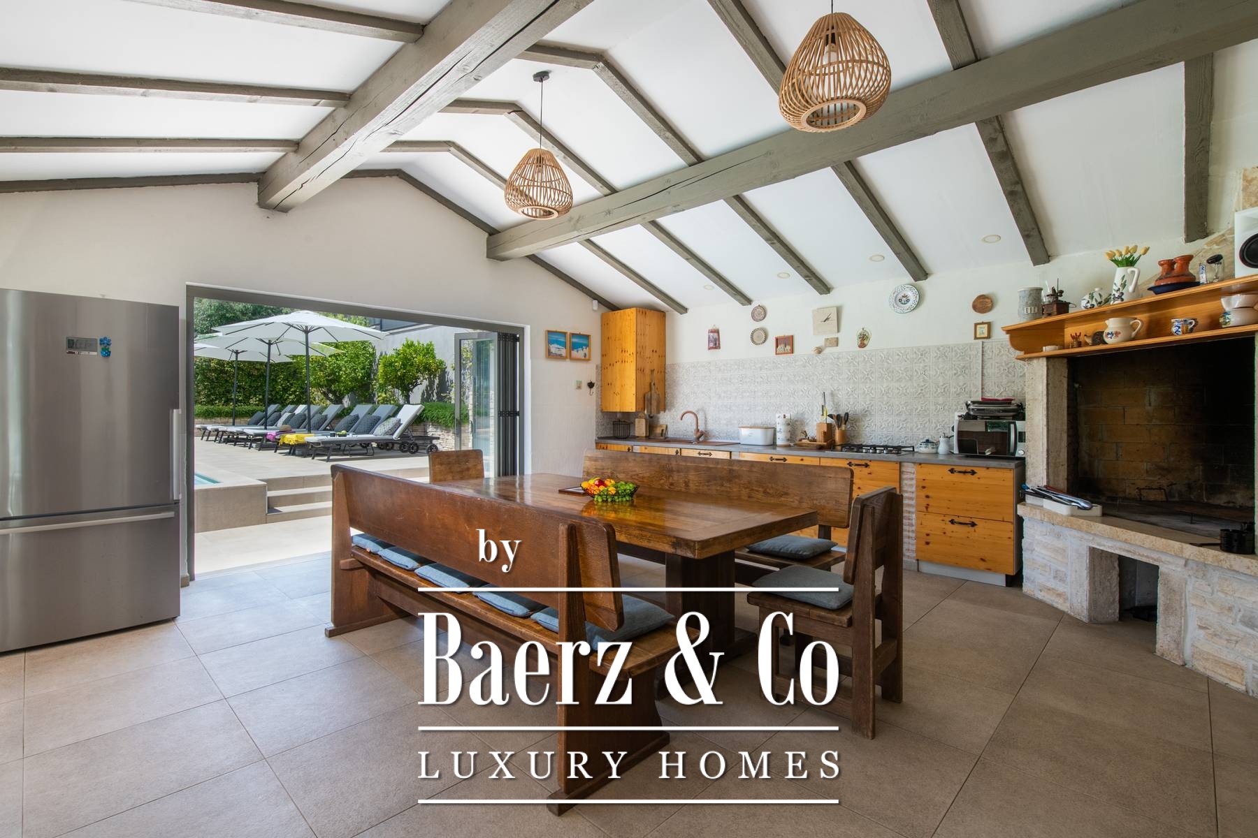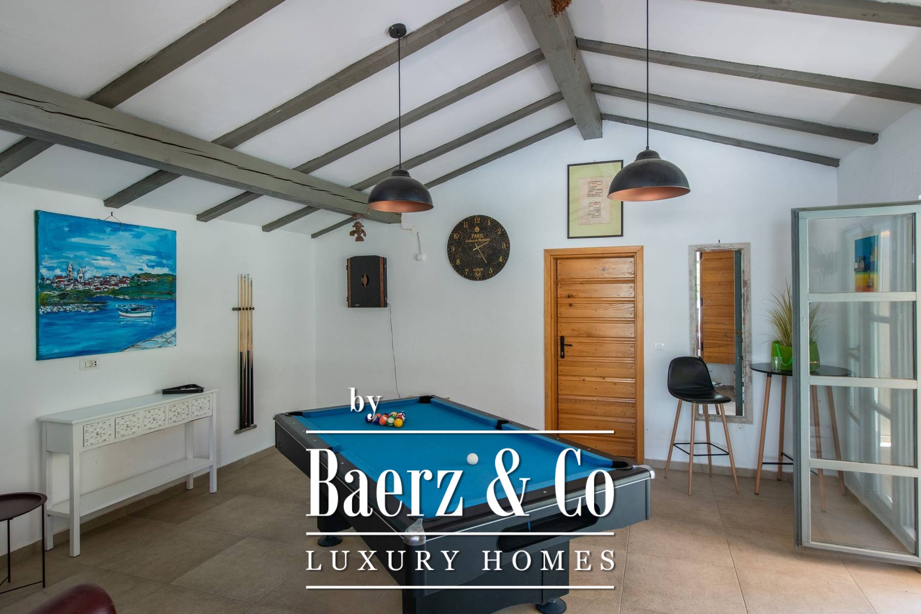 Six bedrooms and six bathrooms are arranged across the upper floors with a measured attention to light and air. The villa combines robust stonework, contributing to its consistent summer coolness, and seamless air-conditioning for modern ease. On the grounds, a separate 165 m² guest house with a two-level terrace, outdoor kitchen, fireplace, and a suite for leisure—pool table, darts, table football—extends the venue for both quiet enjoyment and lively company. A walled and covered parking area accommodates five vehicles discreetly.