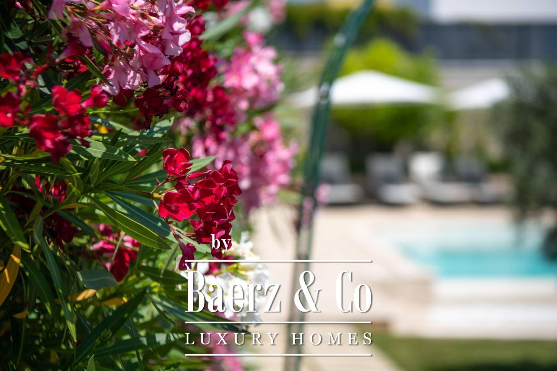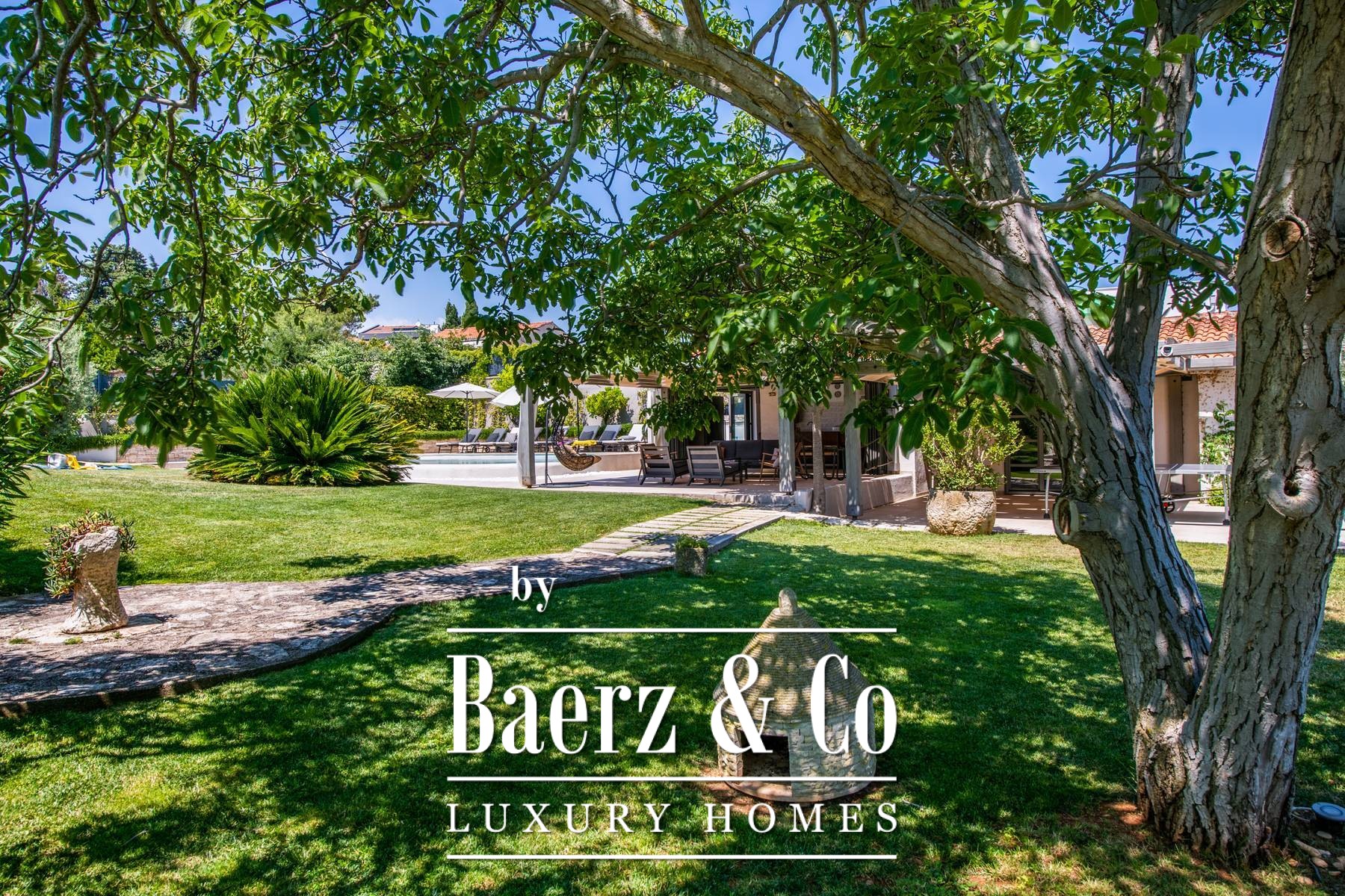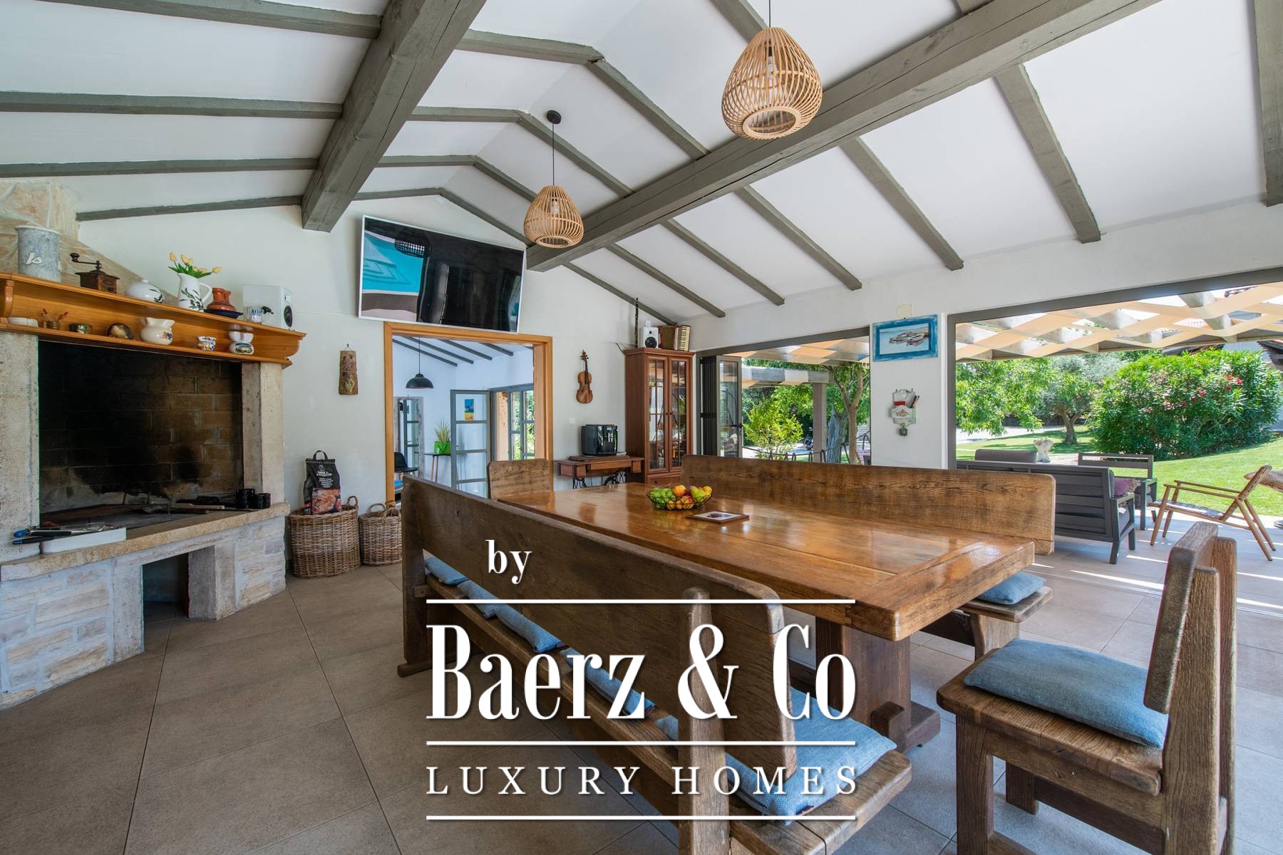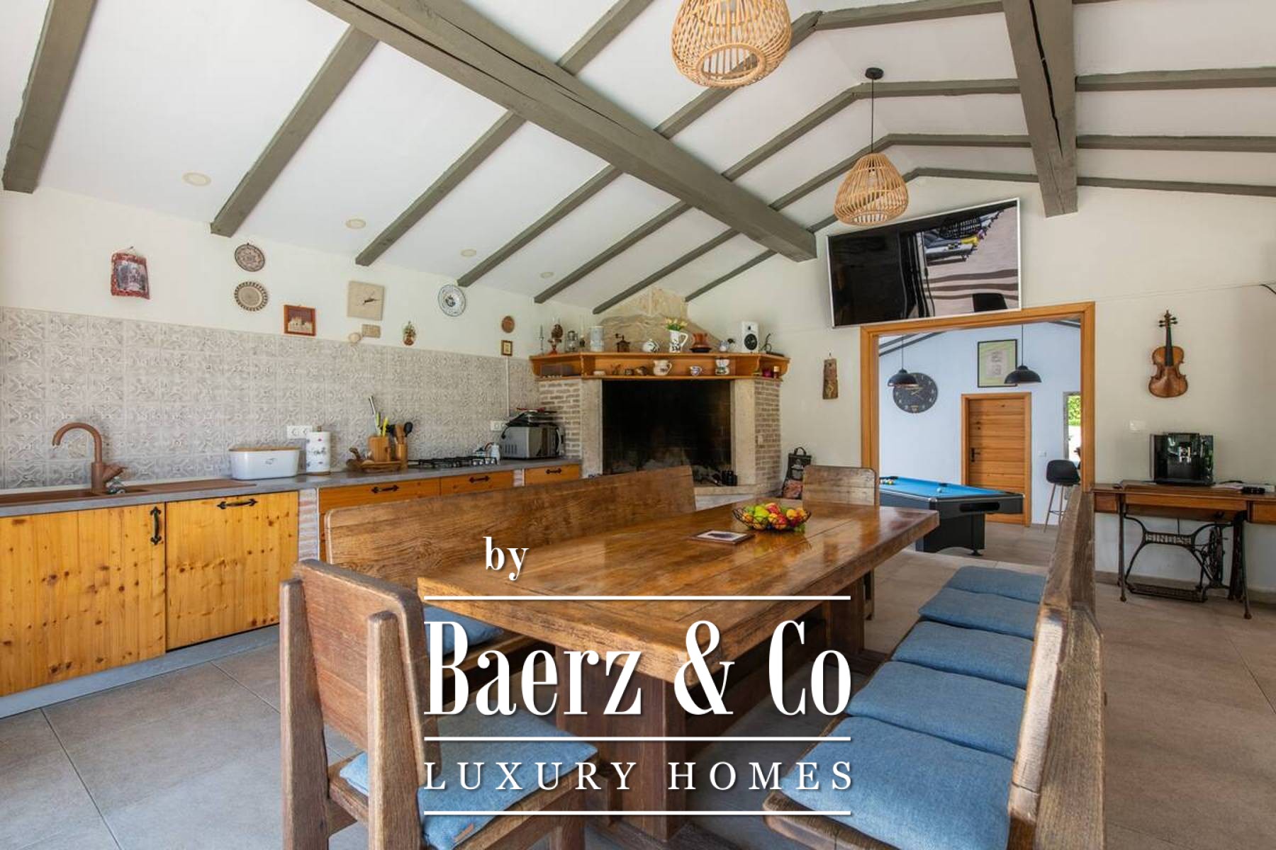 Six bedrooms and six bathrooms are arranged across the upper floors with a measured attention to light and air. The villa combines robust stonework, contributing to its consistent summer coolness, and seamless air-conditioning for modern ease. On the grounds, a separate 165 m² guest house with a two-level terrace, outdoor kitchen, fireplace, and a suite for leisure—pool table, darts, table football—extends the venue for both quiet enjoyment and lively company. A walled and covered parking area accommodates five vehicles discreetly.
