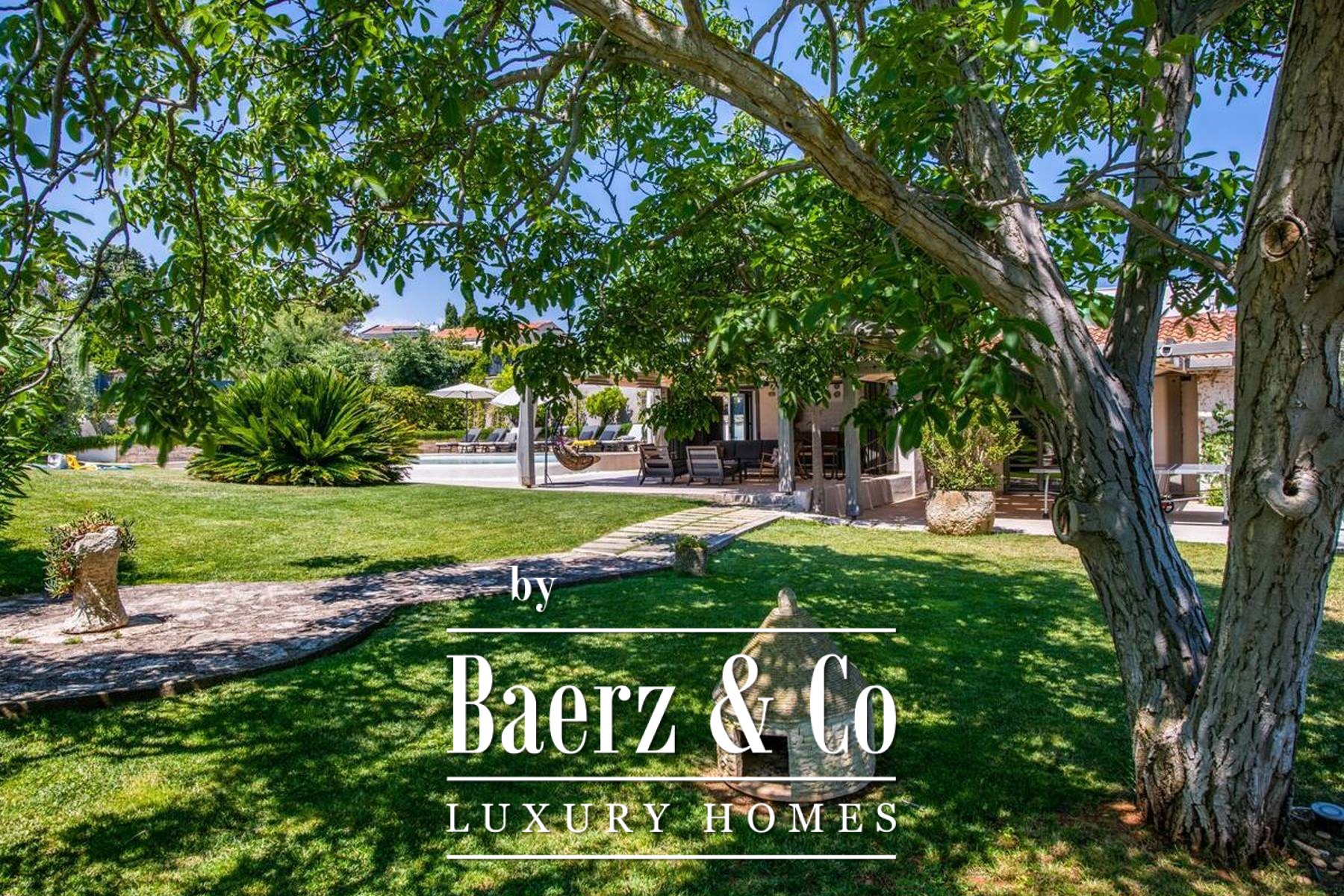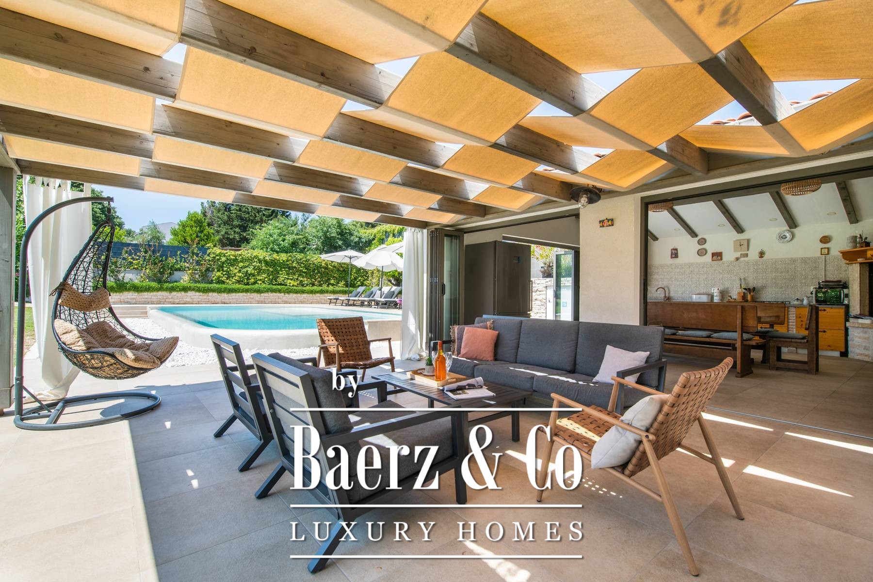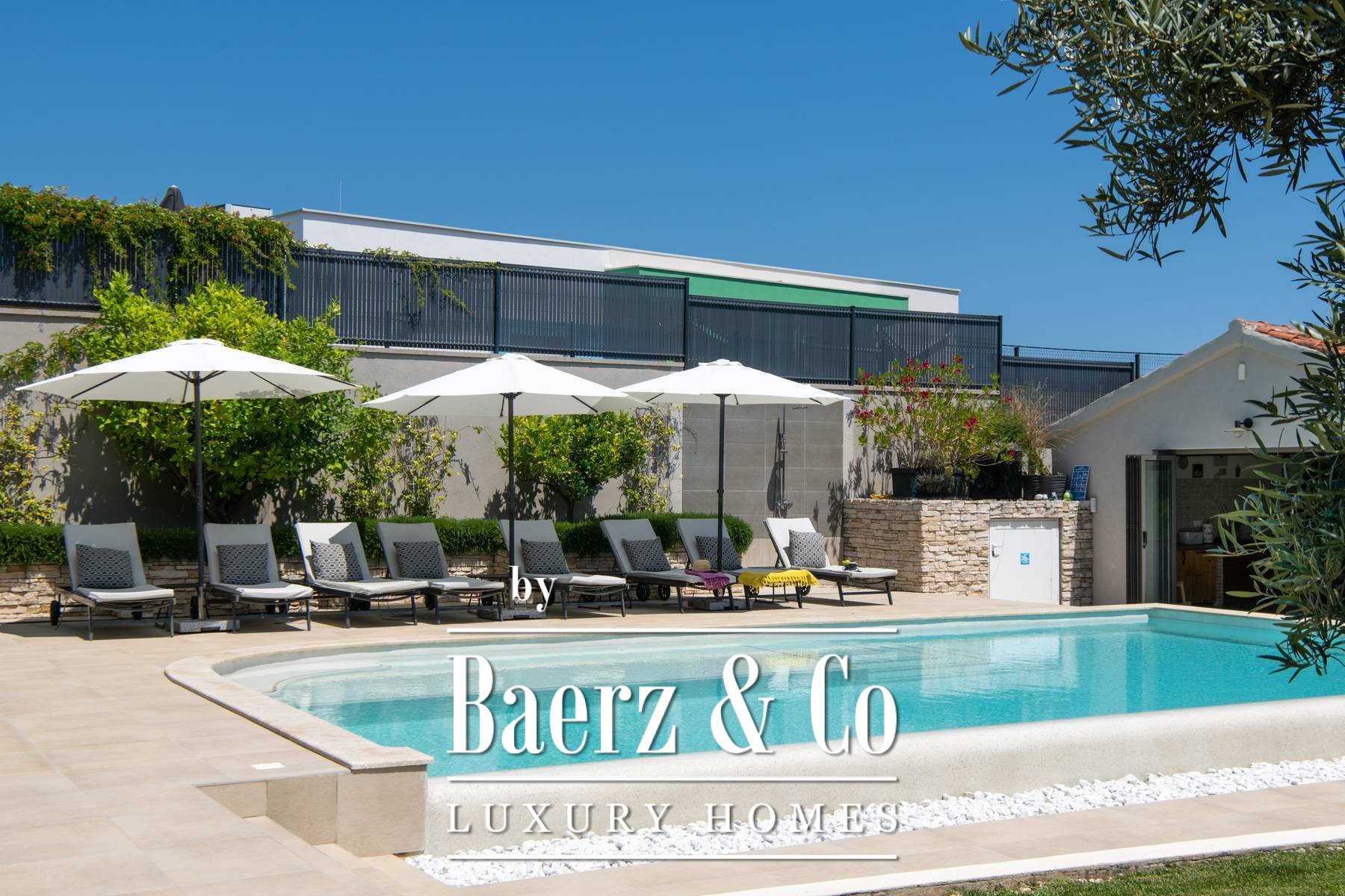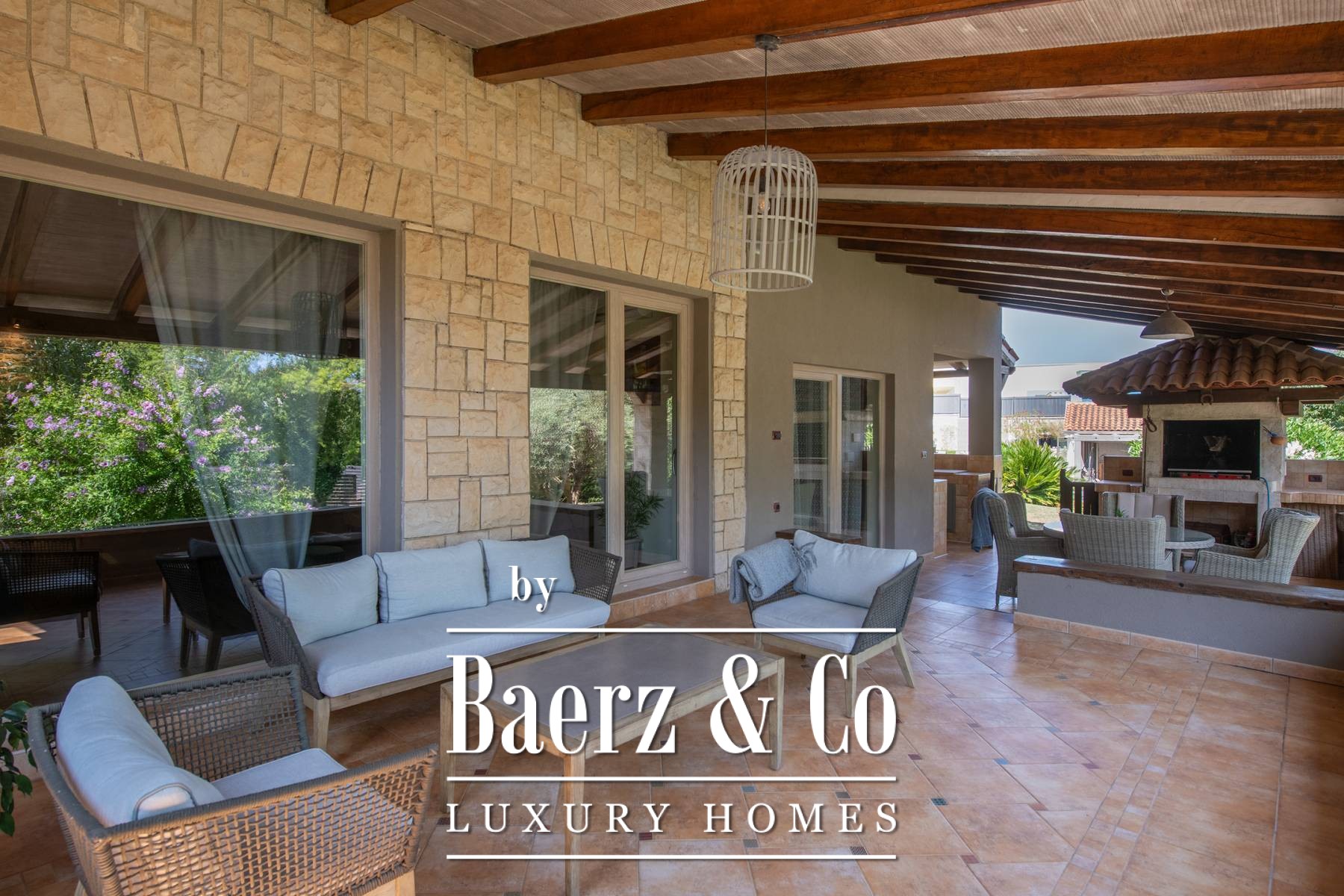 Six bedrooms and six bathrooms are arranged across the upper floors with a measured attention to light and air. The villa combines robust stonework, contributing to its consistent summer coolness, and seamless air-conditioning for modern ease. On the grounds, a separate 165 m² guest house with a two-level terrace, outdoor kitchen, fireplace, and a suite for leisure—pool table, darts, table football—extends the venue for both quiet enjoyment and lively company. A walled and covered parking area accommodates five vehicles discreetly.