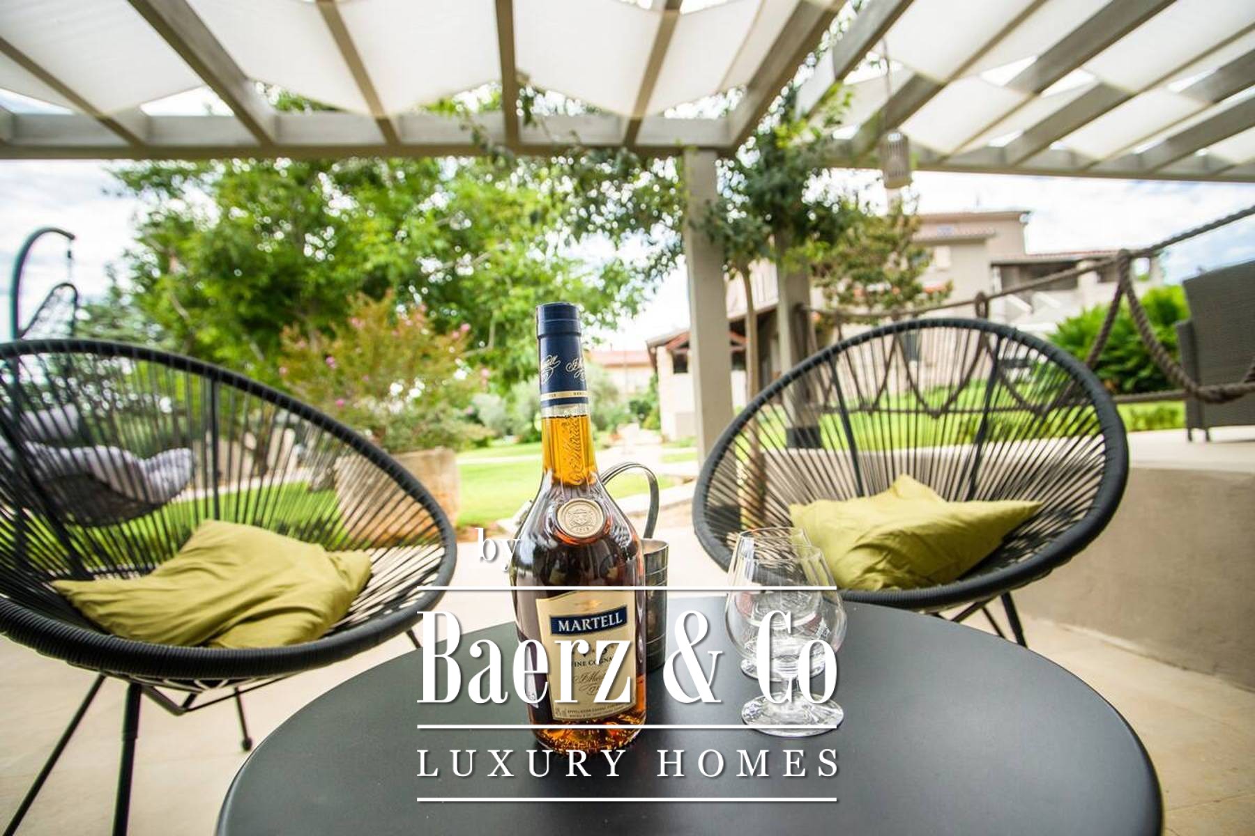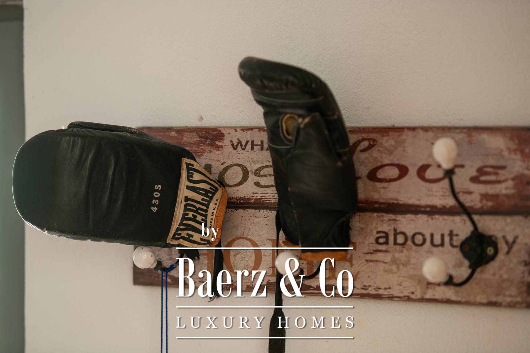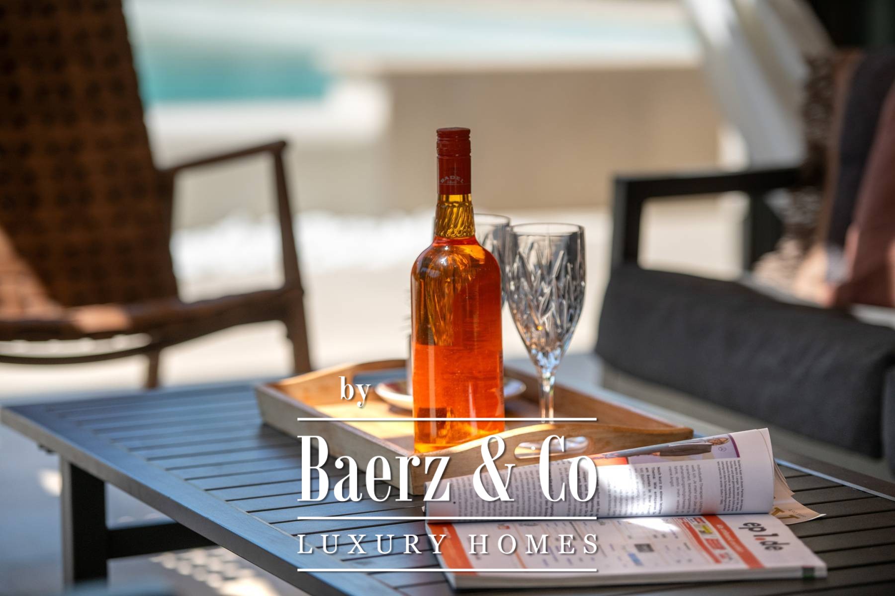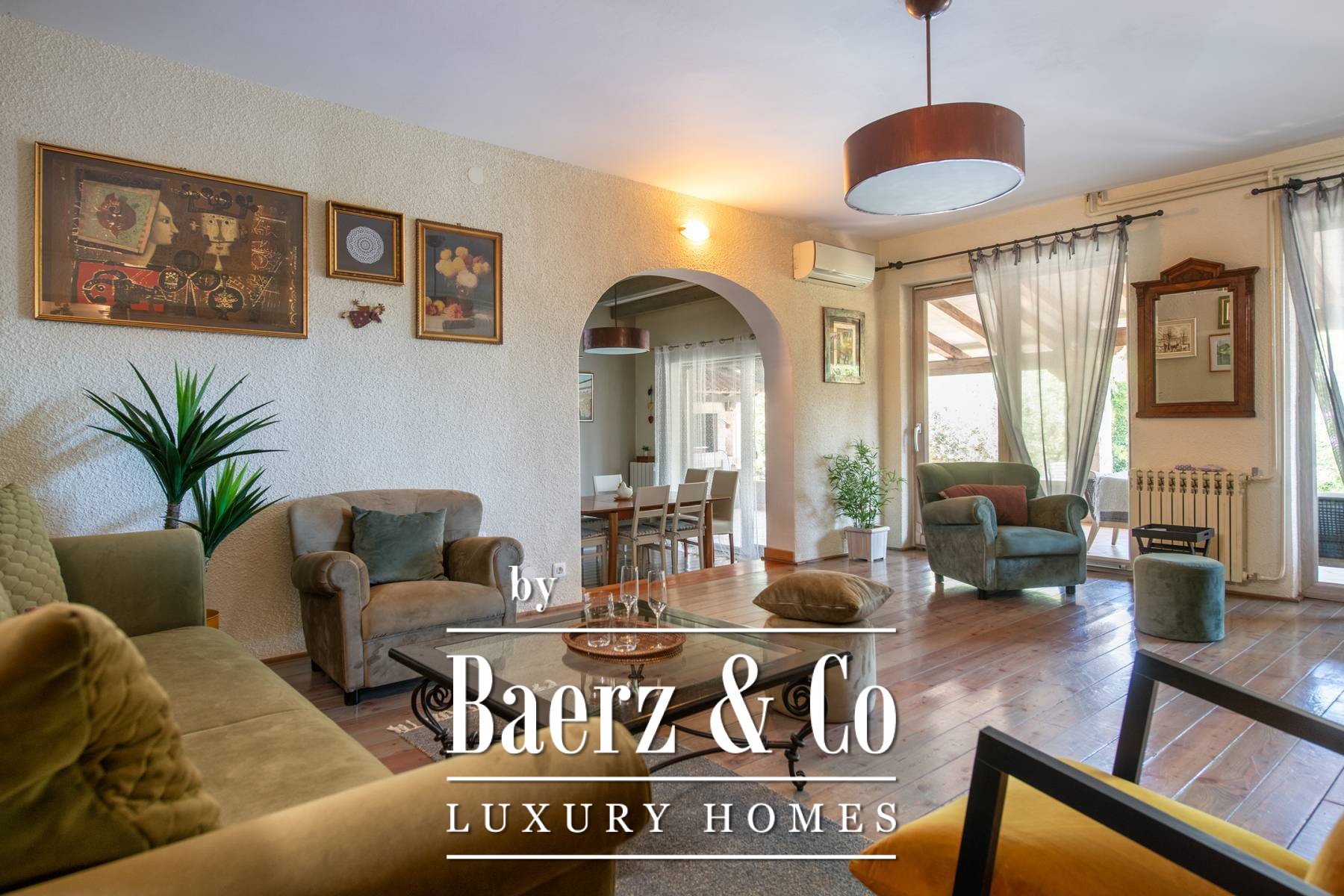 Six bedrooms and six bathrooms are arranged across the upper floors with a measured attention to light and air. The villa combines robust stonework, contributing to its consistent summer coolness, and seamless air-conditioning for modern ease. On the grounds, a separate 165 m² guest house with a two-level terrace, outdoor kitchen, fireplace, and a suite for leisure—pool table, darts, table football—extends the venue for both quiet enjoyment and lively company. A walled and covered parking area accommodates five vehicles discreetly.