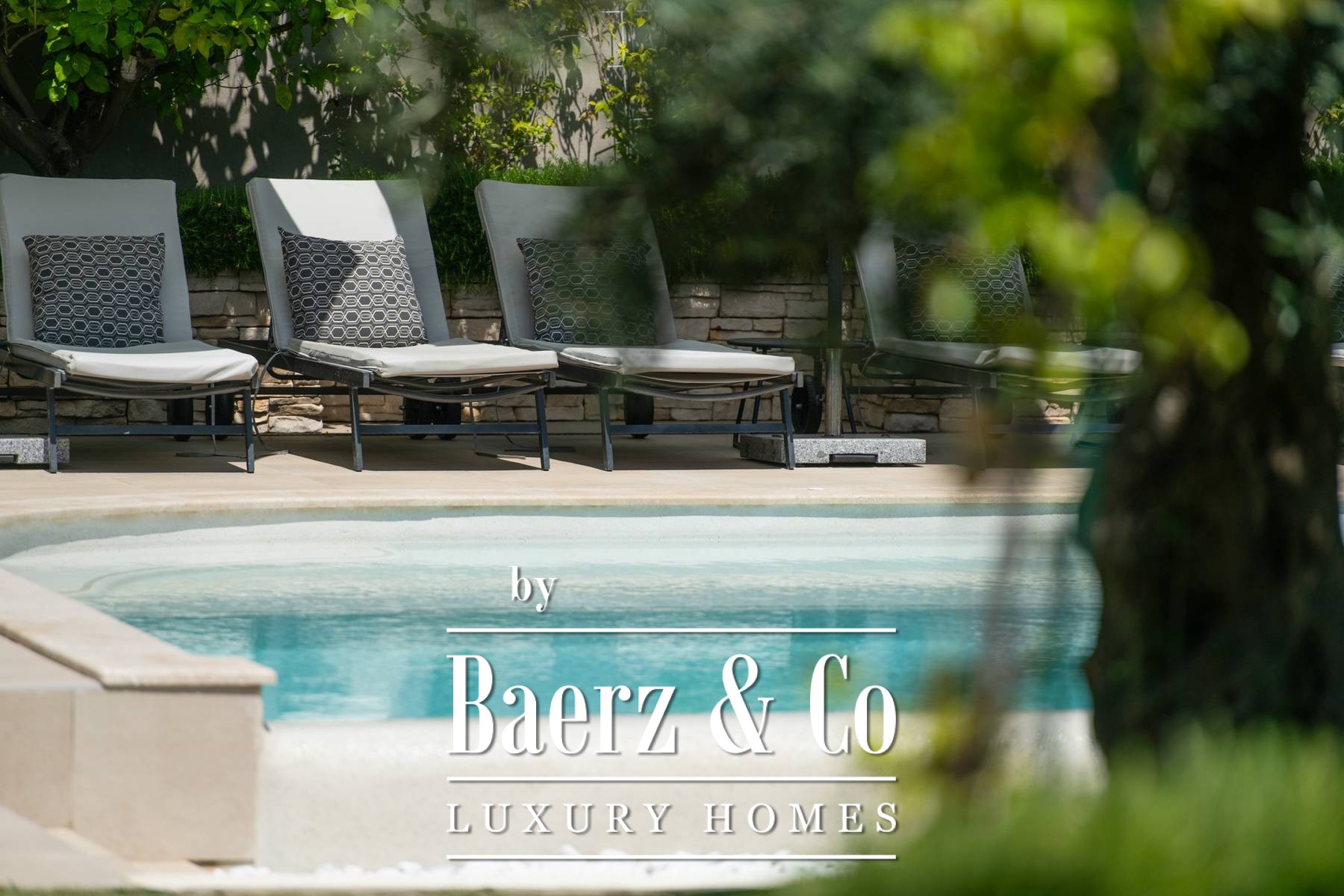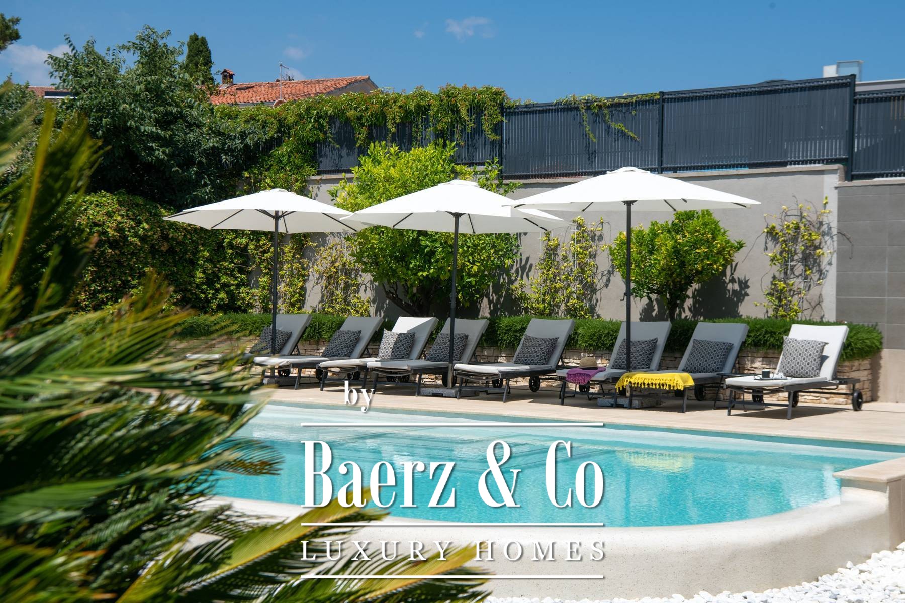 Townhouse Ližnjan presents an architecture of restraint and thoughtful proportions, set within the natural contours of southeast Istria. This 435 m² Mediterranean villa stands on a secluded 4,600 m² garden, surrounded by lush greenery that quietly assures both privacy and tranquility. The main residence opens to a luminous living space, flowing toward a garden and a 50 m² pool. The rustic kitchen and Mediterranean terrace, complete with fireplace, invite gathering around elemental comforts and expansive courtyard views.