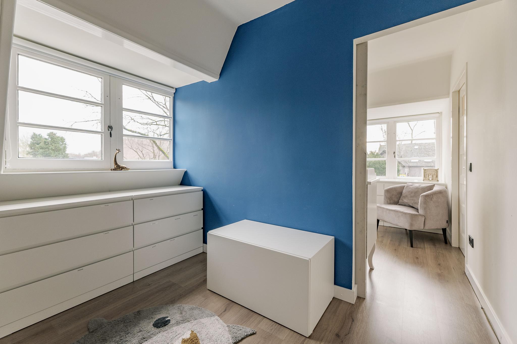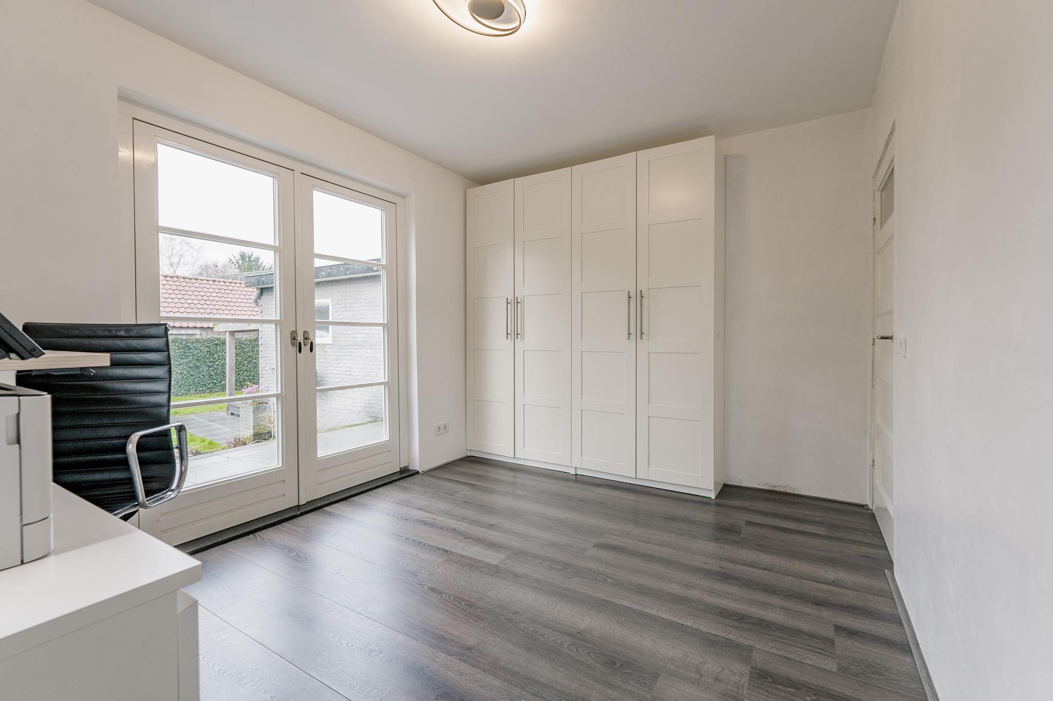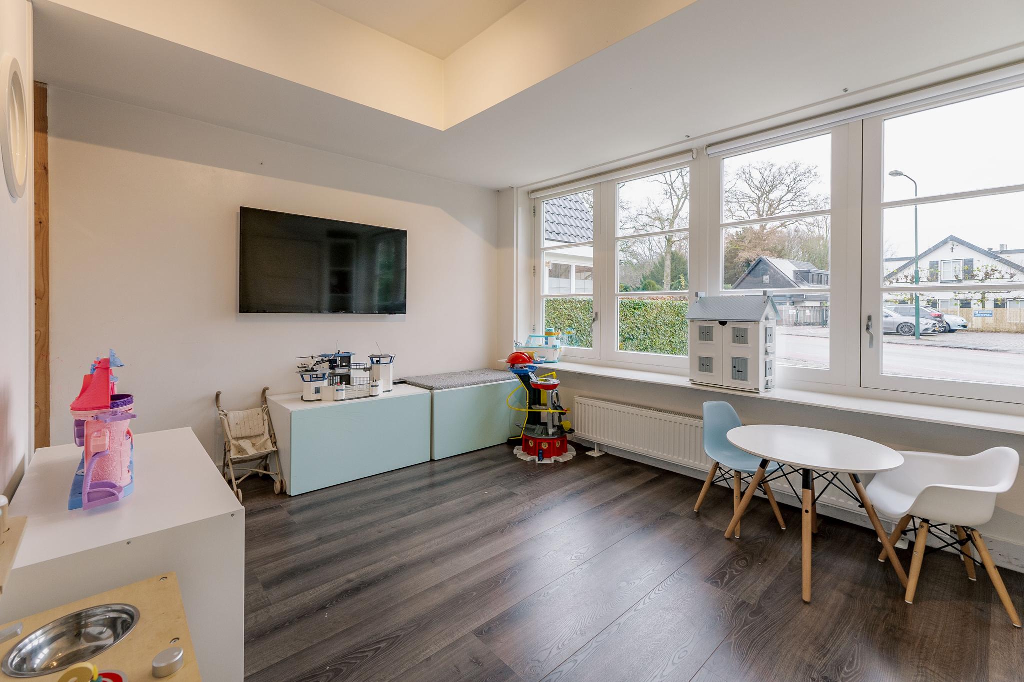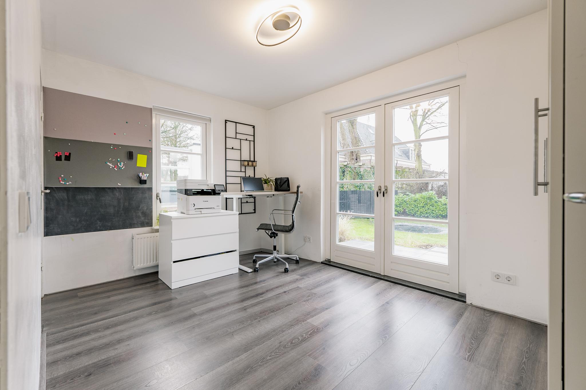 Begane grond: Bij binnenkomst word je verwelkomd in een ruime hal met garderobe en een toilet met fontein. De royale woonkamer, voorzien van een sfeervolle houtkachel, sluit aan op een lichte open keuken. De gezellige zitkamer heeft openslaande deuren naar een terras, terwijl de aparte werkkamer eveneens via openslaande deuren toegang biedt tot de tuin. Aan de voorzijde van de woning bevindt zich een aparte werk- of televisiekamer.