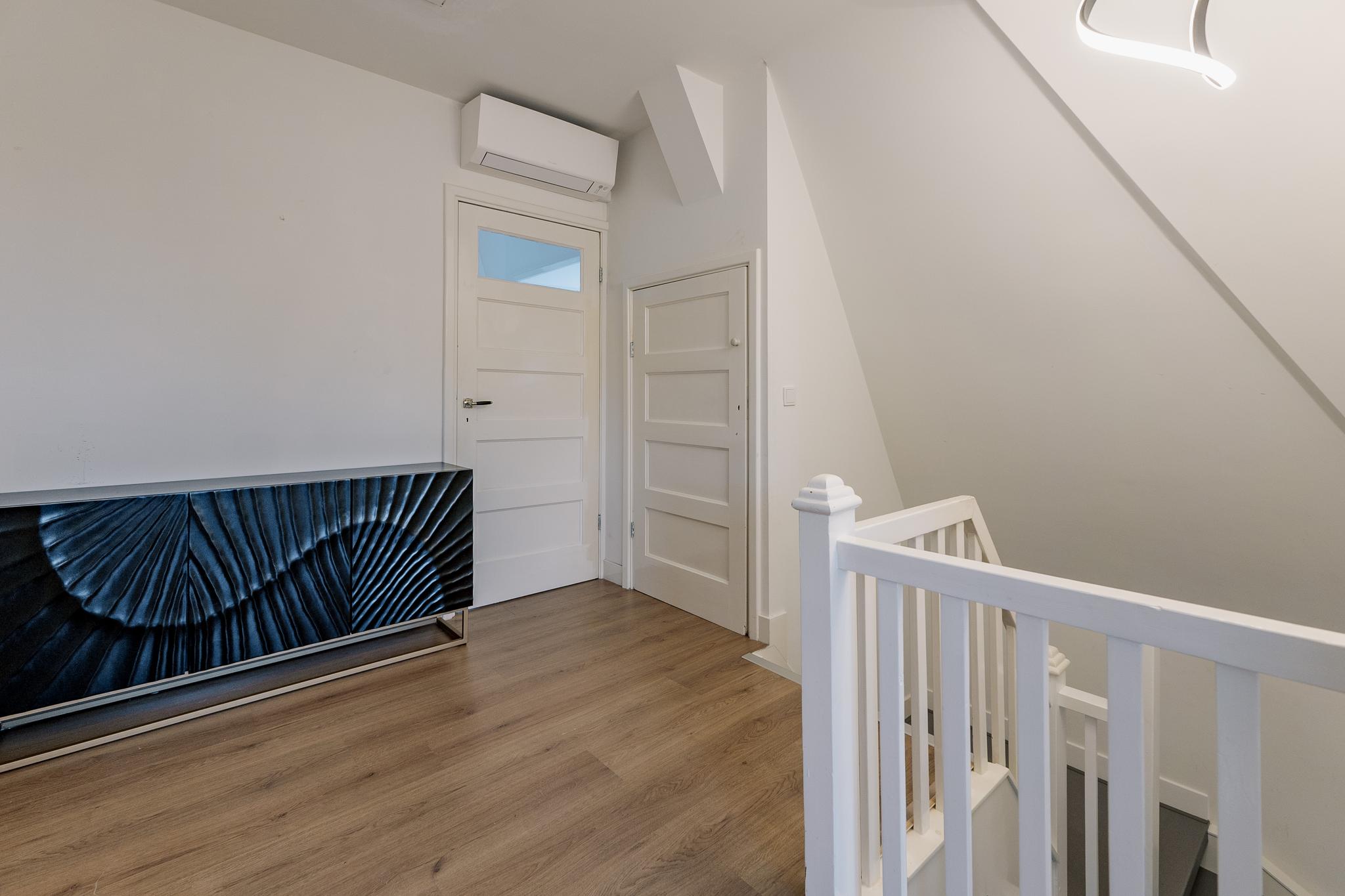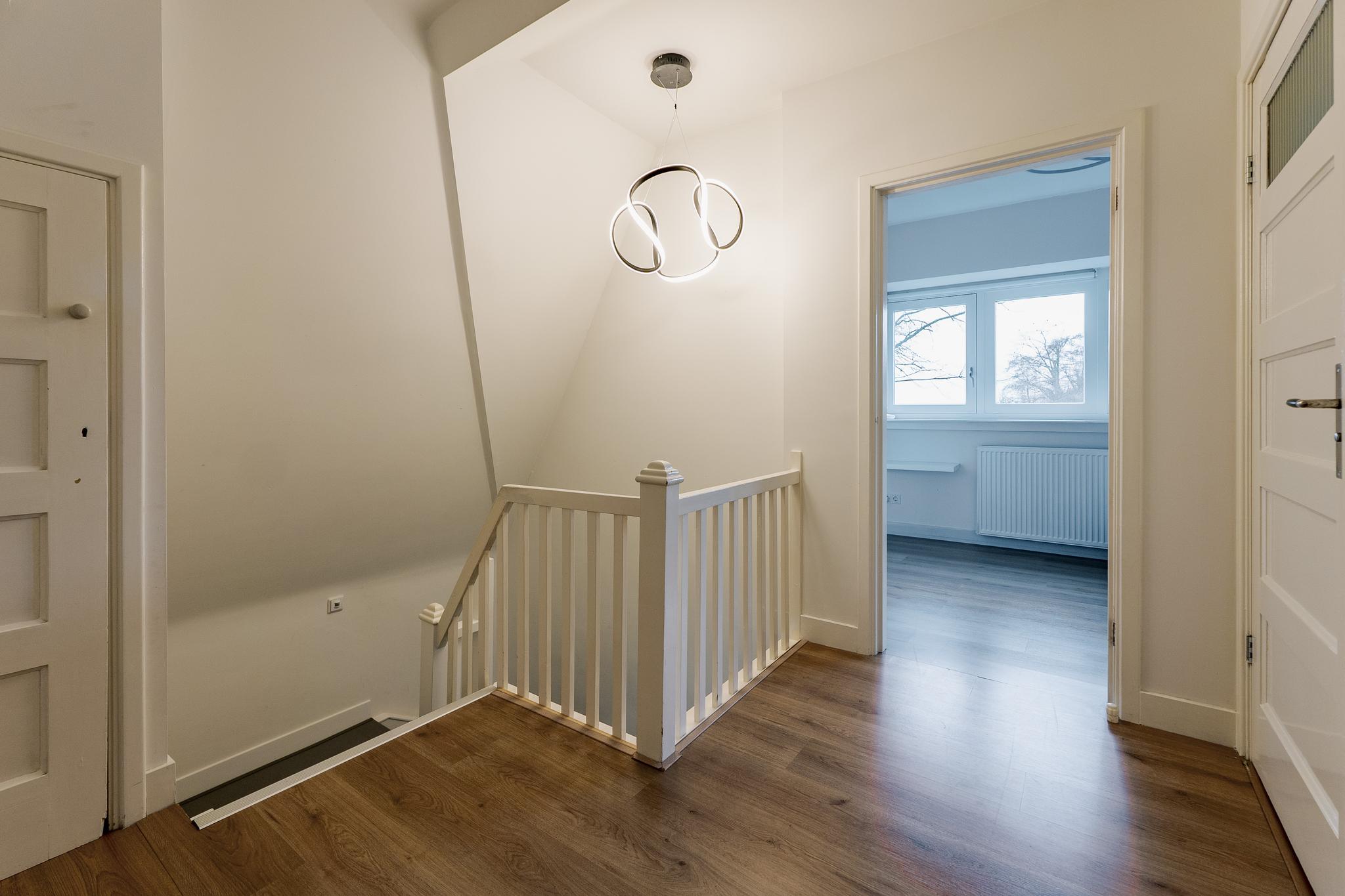 Eerste verdieping: Via een fraaie bordestrap bereik je de overloop. Aan de voorzijde bevinden zich twee slaapkamers met twee dakkapellen en een vaste kast. De slaapkamer aan de achterzijde is eveneens ruim en beschikt over een dakkapel en vaste kastruimte. De moderne badkamer is voorzien van een ligbad, een aparte douche en een wastafel. Een apart toilet completeert deze verdieping.