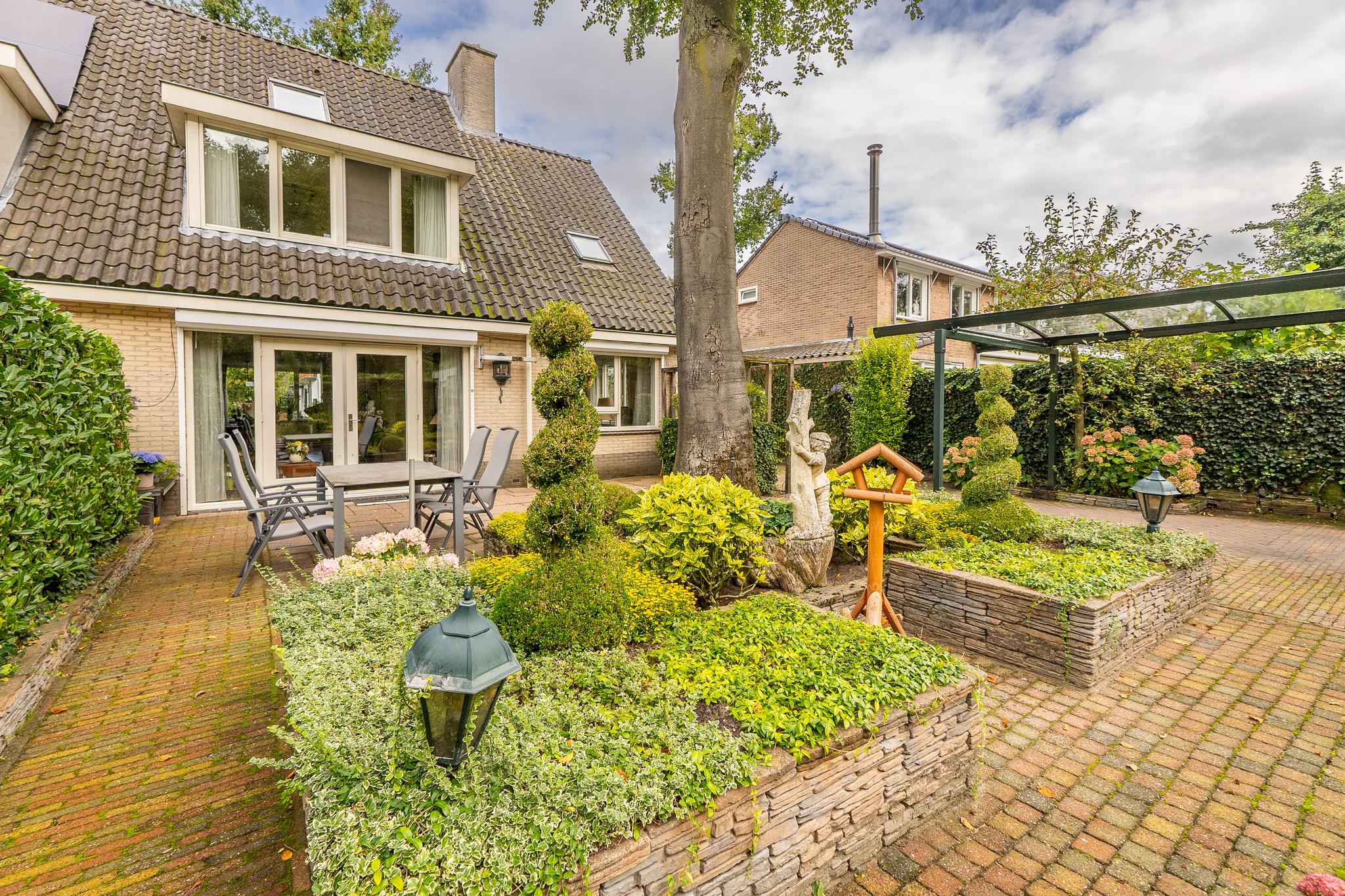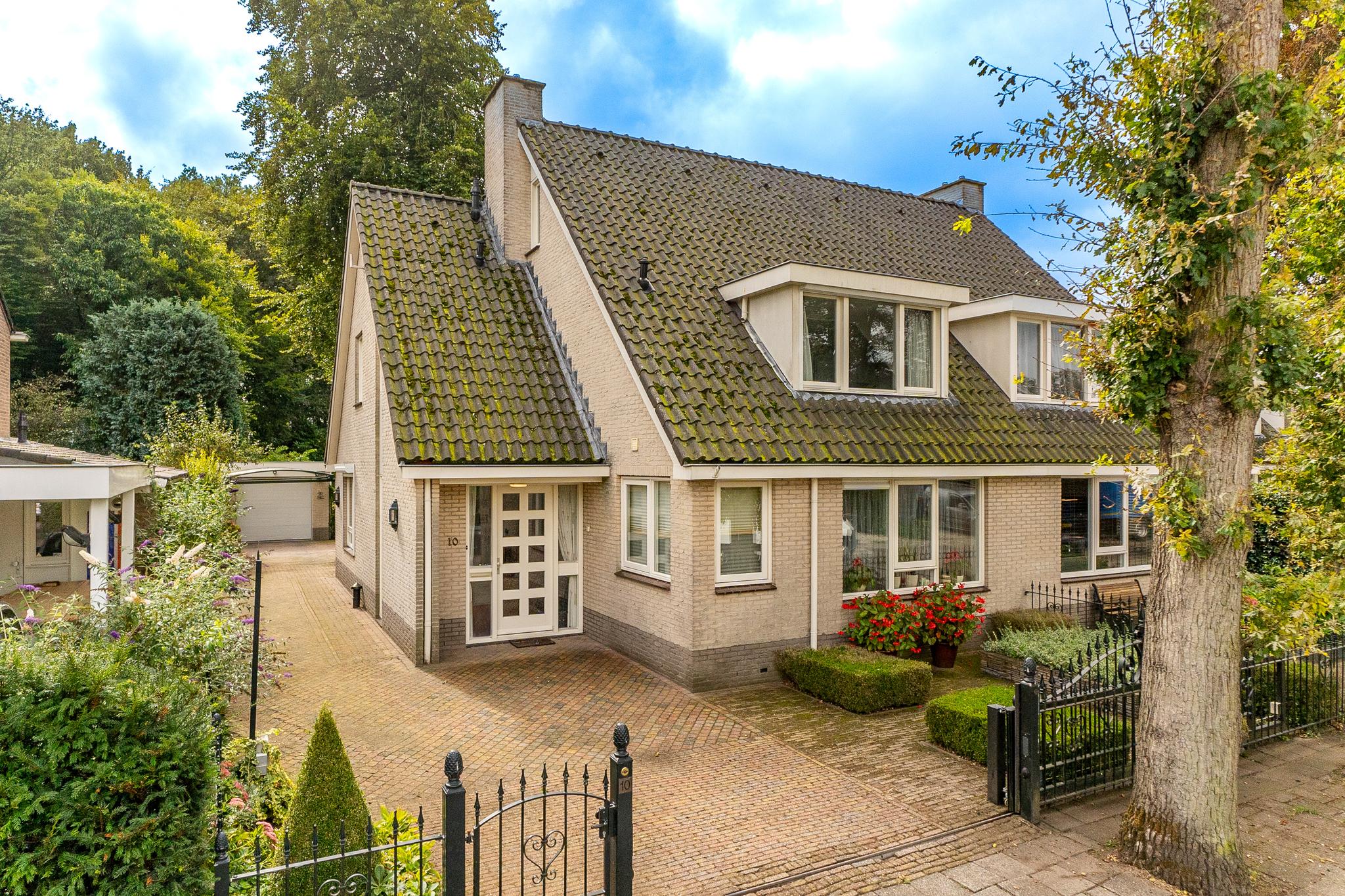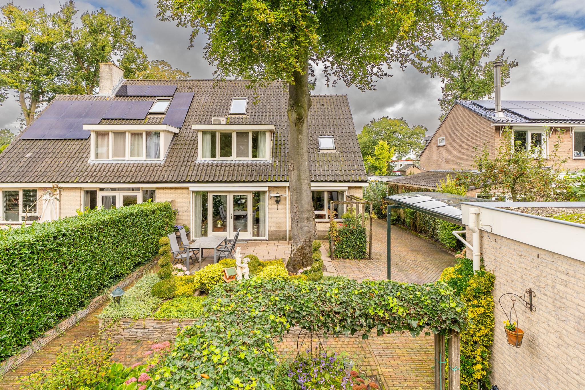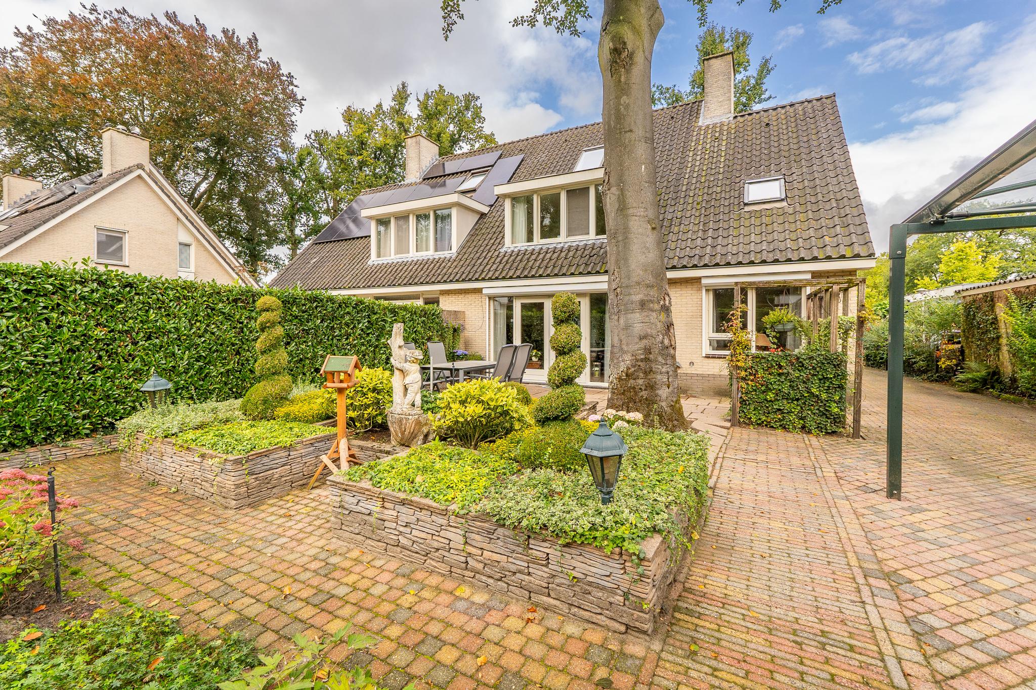 Royale helft van dubbele villa op een riant perceel van ca. 334 m² met prachtig aangelegde tuin met diverse terrassen, oprit (afsluitbaar middels poort) voor parkeren meerdere auto's en een vrijstaande garage met carport.