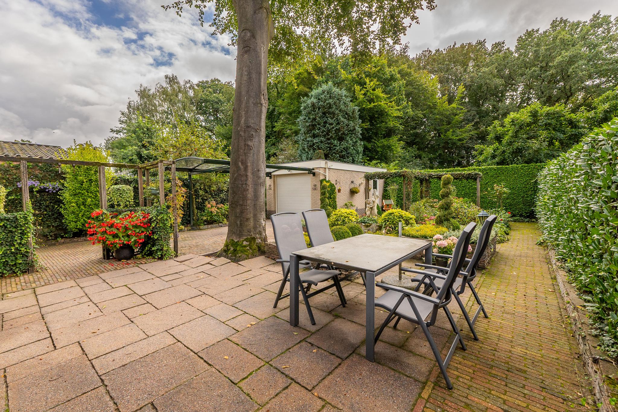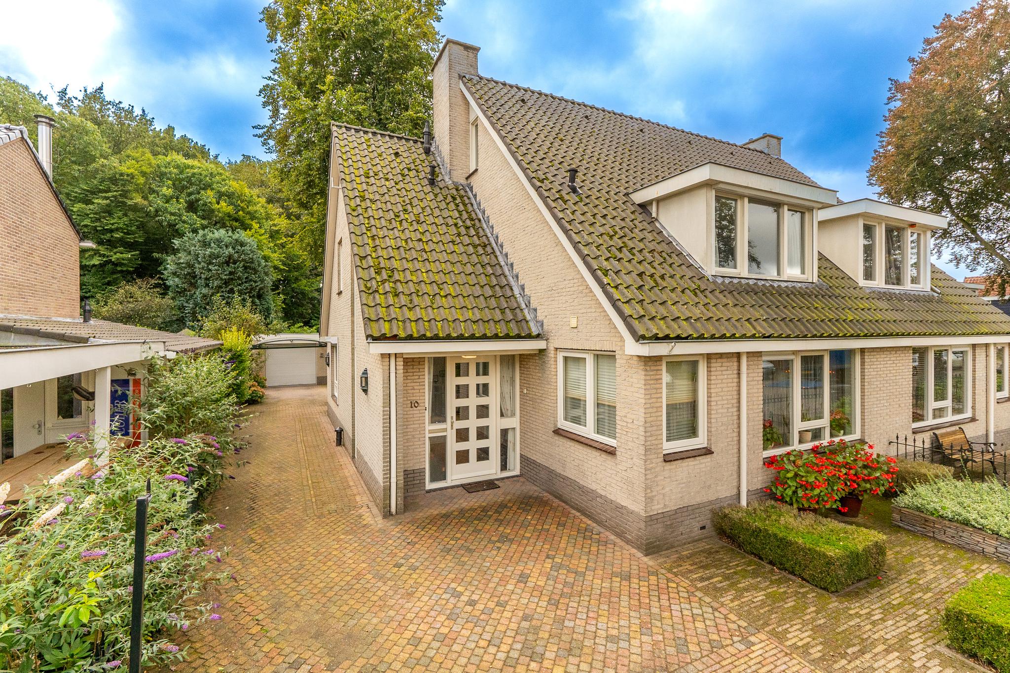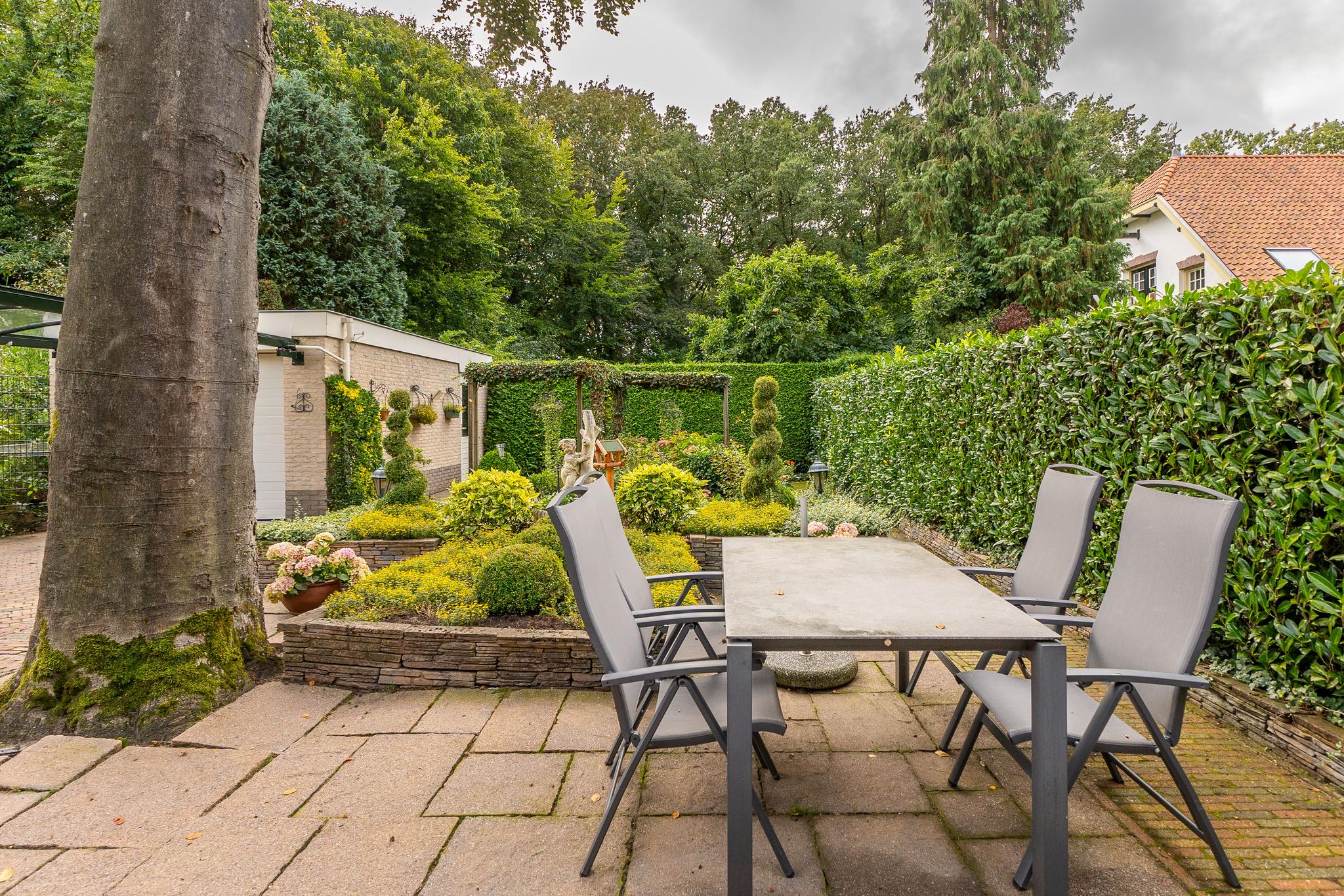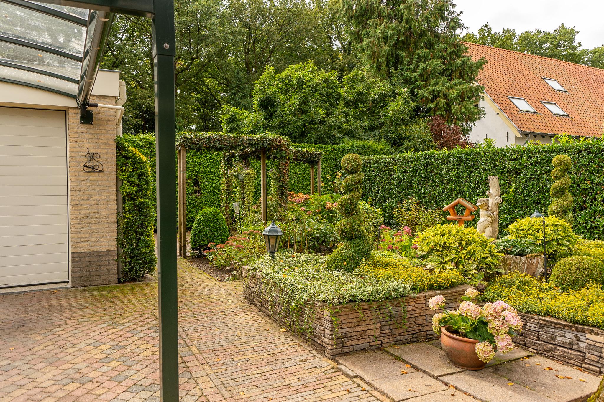 Royale helft van dubbele villa op een riant perceel van ca. 334 m² met prachtig aangelegde tuin met diverse terrassen, oprit (afsluitbaar middels poort) voor parkeren meerdere auto's en een vrijstaande garage met carport.