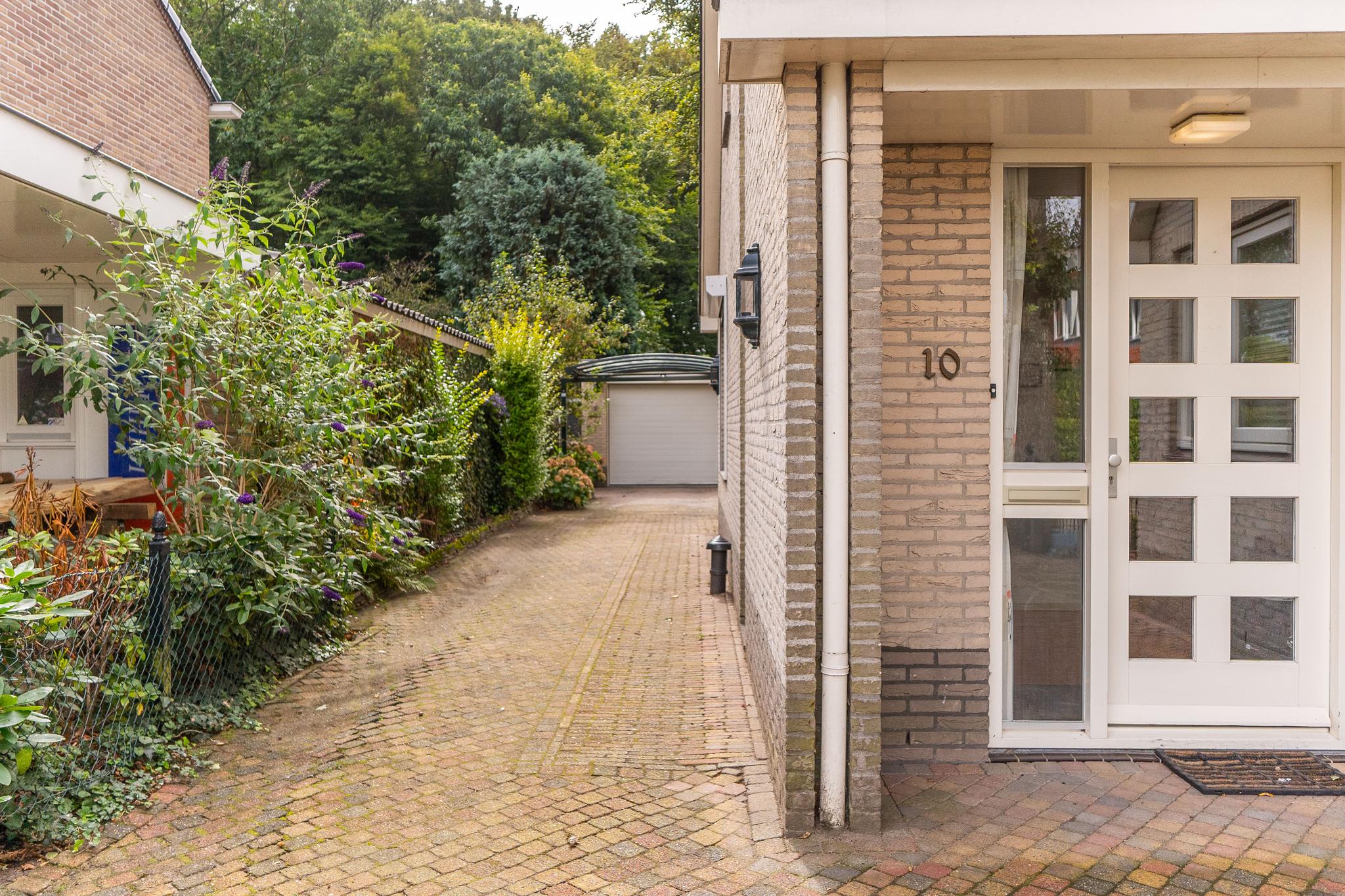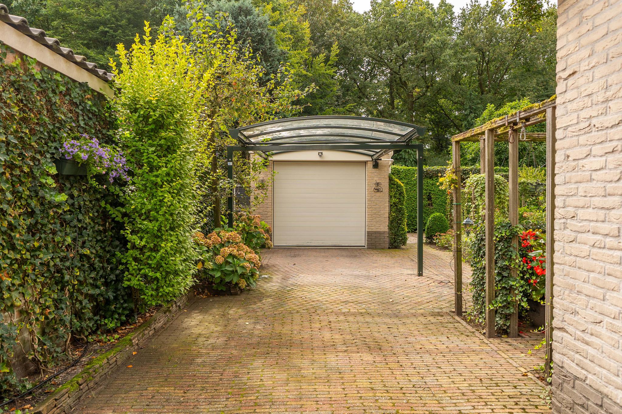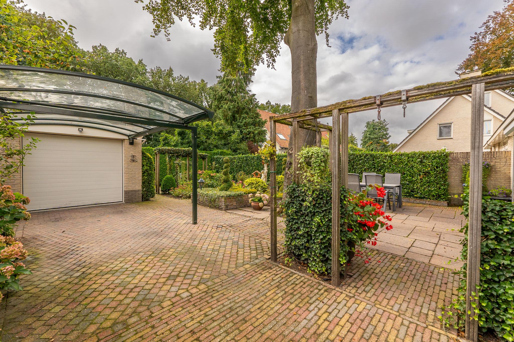 Tuin: de woning beschikt over een lange, bestrate oprit welke leidt naar de carport en garage, gelegen achter in de tuin. Er is voldoende ruimte om meerdere auto's op eigen terrein te parkeren en tevens afsluitbaar middels elektrische poort. Zowel de voor- als achtertuin zijn onderhoudsvriendelijk aangelegd met bestrating en borders vol beplanting.