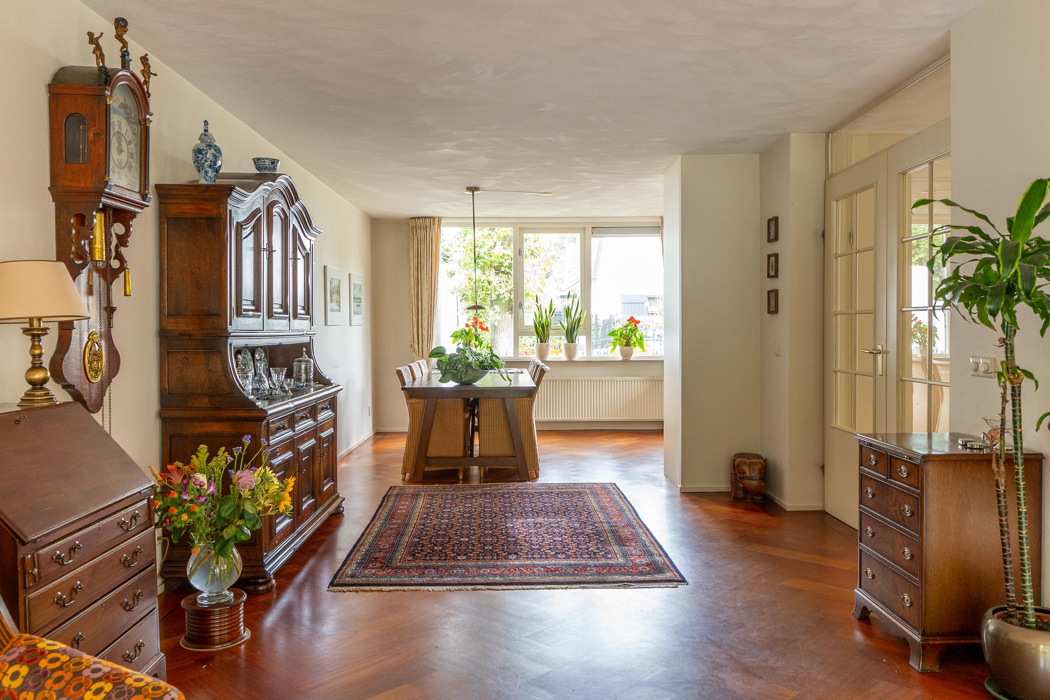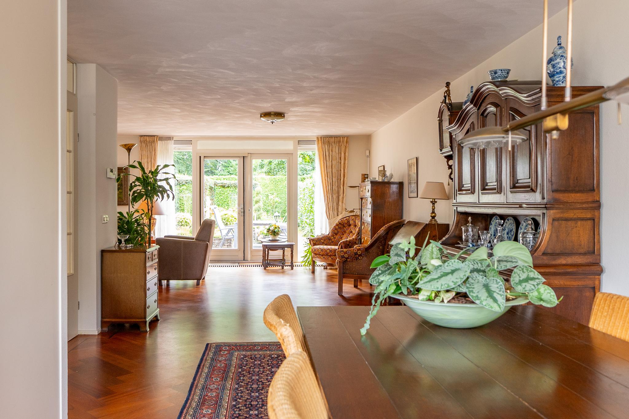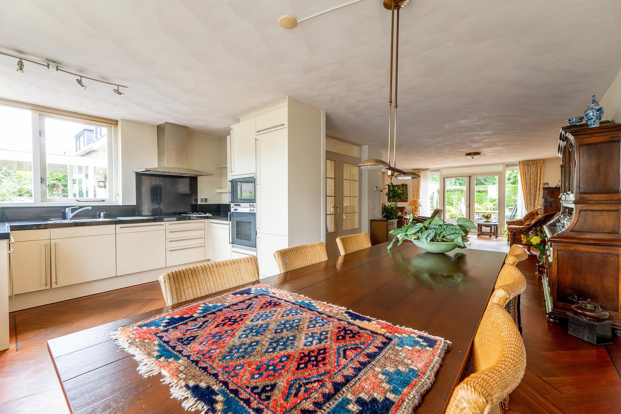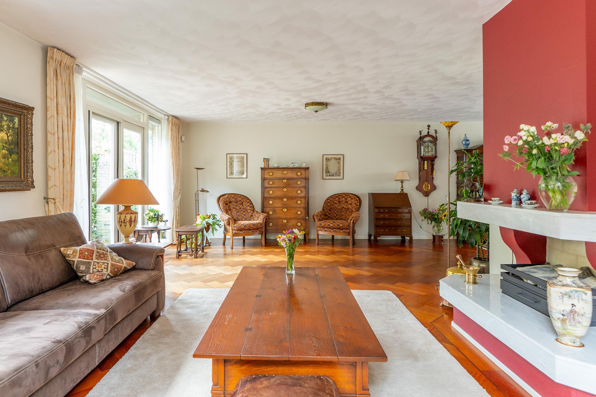 De royale U-vormige woon-/eetkamer biedt aan de voorzijde toegang tot de open keuken welke is uitgerust met diverse inbouwapparatuur zoals 4-pits inductiekookplaat met wokbrander (SMEG), stoomoven, oven, afzuigkap en koel-/vriescombinatie (GAGGENAU). De ruime woonkamer is voorzien van een prachtig visgraat parket en heeft openslaande deuren die leiden naar de achtertuin.