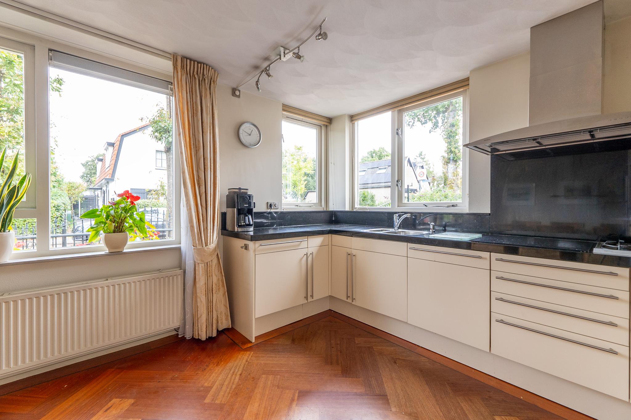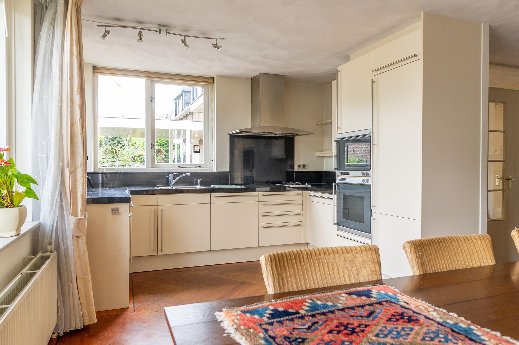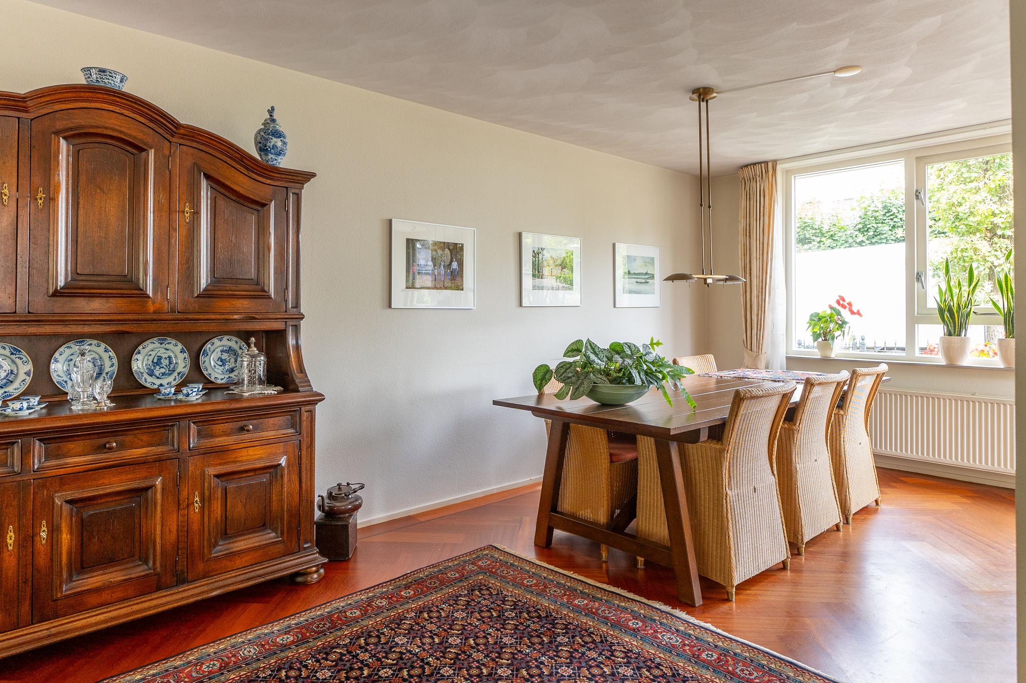 De royale U-vormige woon-/eetkamer biedt aan de voorzijde toegang tot de open keuken welke is uitgerust met diverse inbouwapparatuur zoals 4-pits inductiekookplaat met wokbrander (SMEG), stoomoven, oven, afzuigkap en koel-/vriescombinatie (GAGGENAU). De ruime woonkamer is voorzien van een prachtig visgraat parket en heeft openslaande deuren die leiden naar de achtertuin.