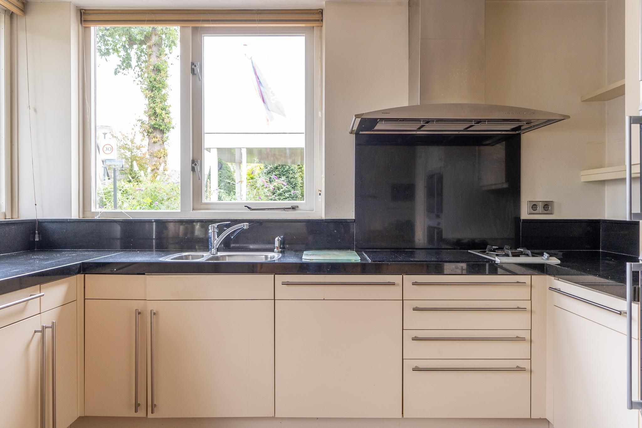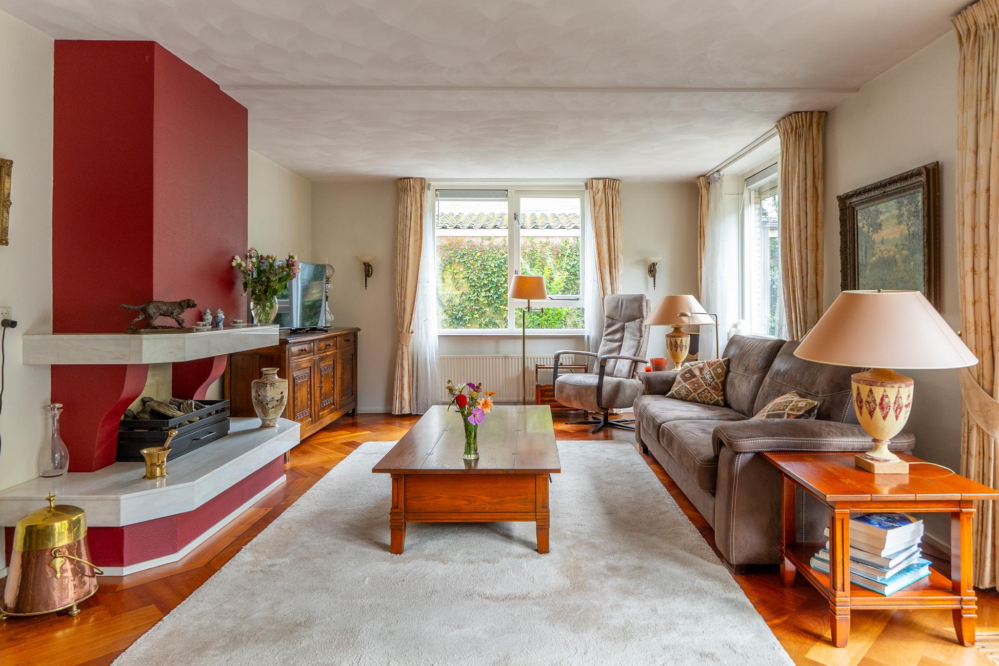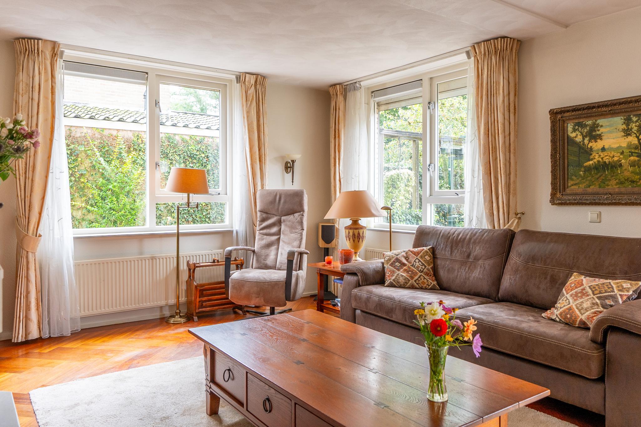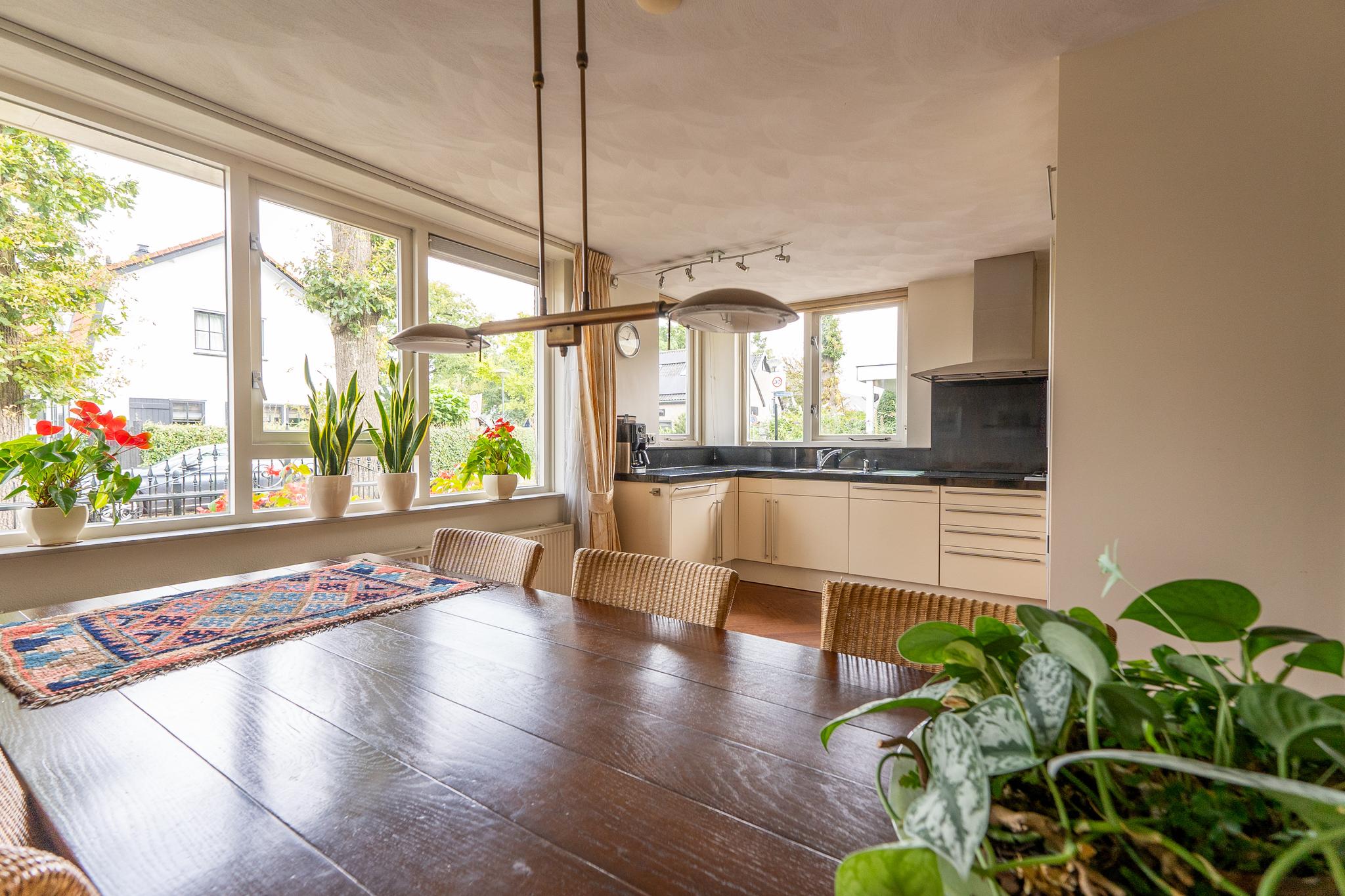 De royale U-vormige woon-/eetkamer biedt aan de voorzijde toegang tot de open keuken welke is uitgerust met diverse inbouwapparatuur zoals 4-pits inductiekookplaat met wokbrander (SMEG), stoomoven, oven, afzuigkap en koel-/vriescombinatie (GAGGENAU). De ruime woonkamer is voorzien van een prachtig visgraat parket en heeft openslaande deuren die leiden naar de achtertuin.