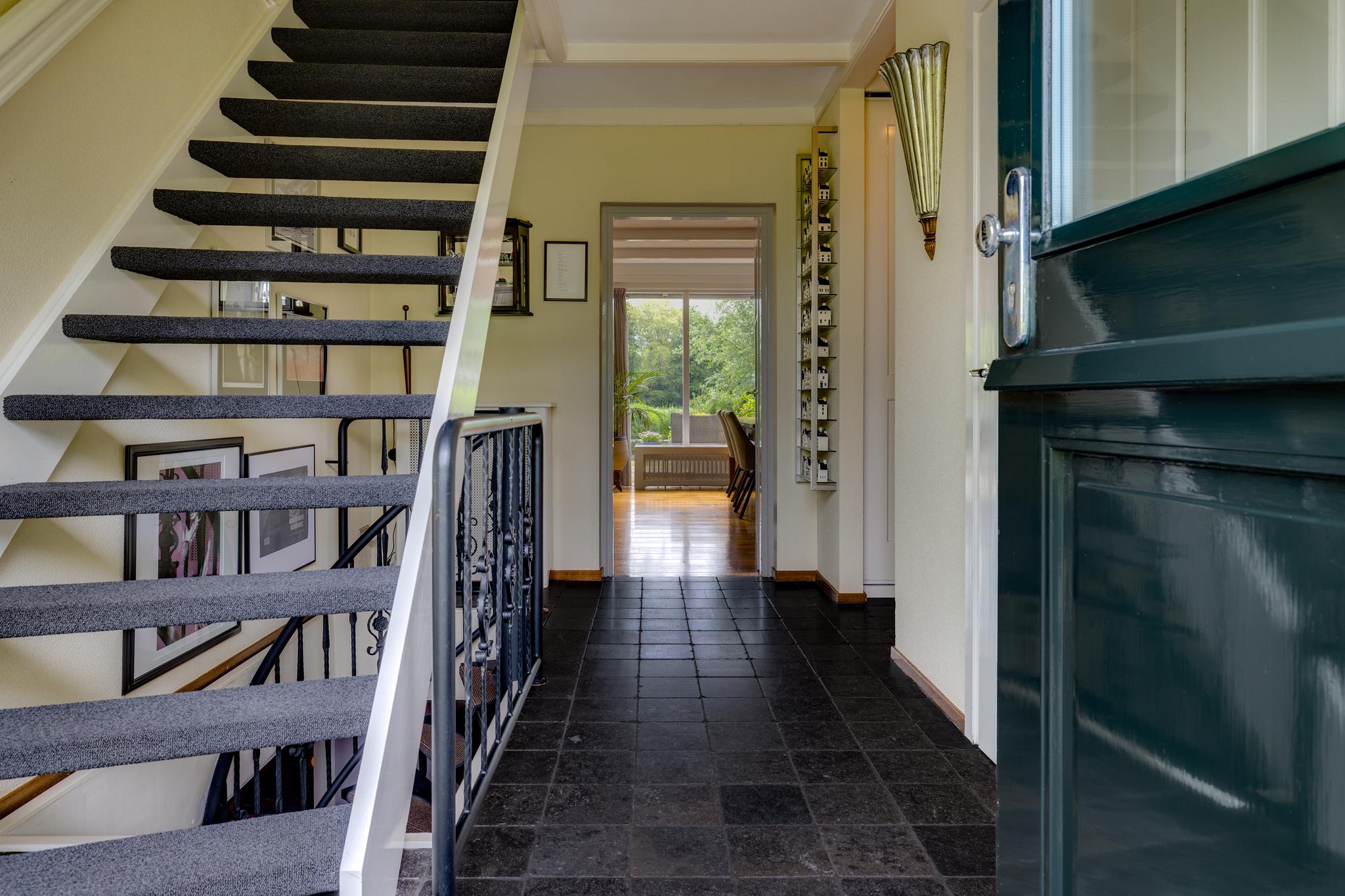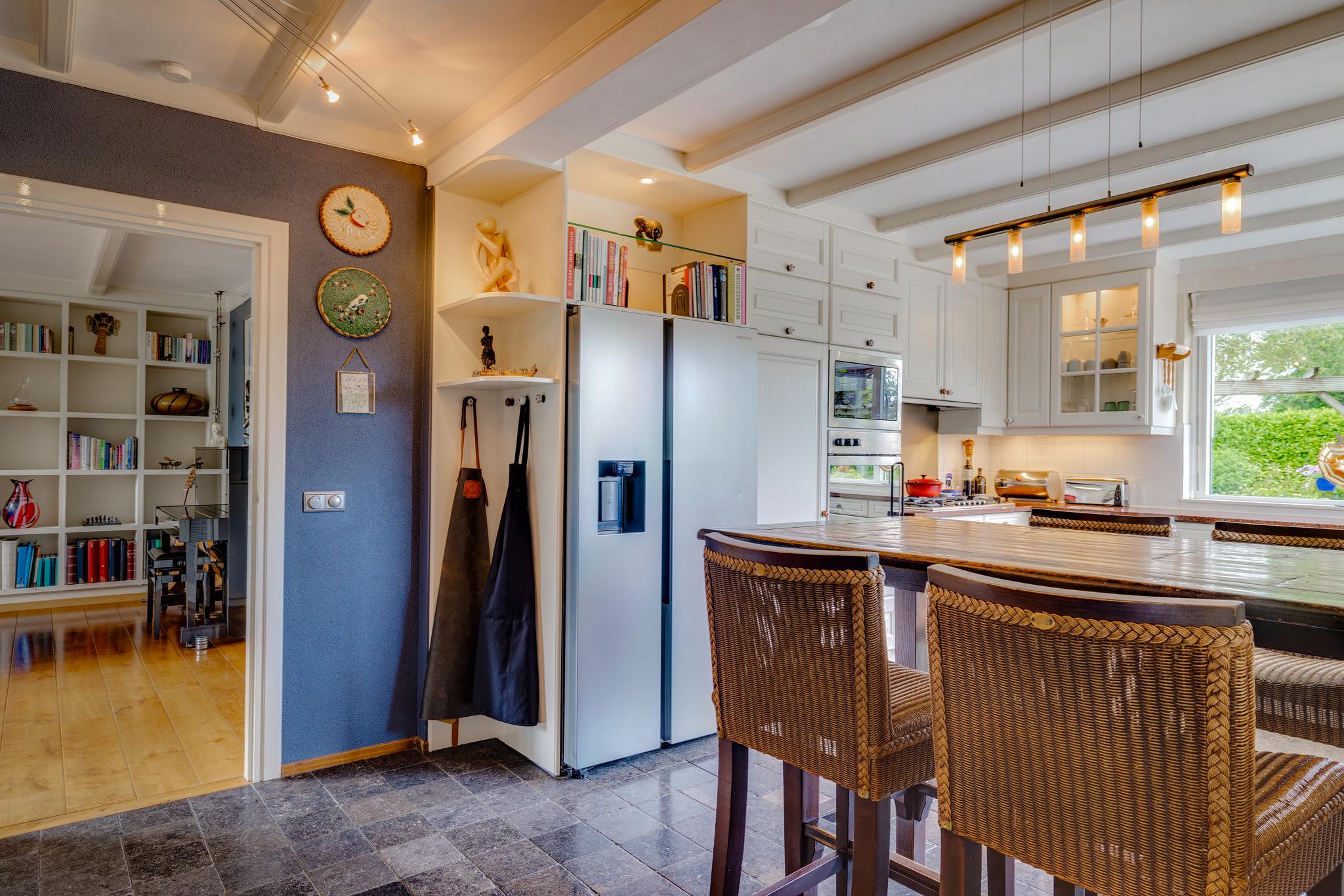 Begane grond: binnenkomst in hal met meterkast, ruime wasruimte, garderobekast en toilet met fonteintje. Z-vormige living met open haard en schuifpui naar één van de terrassen met uitzicht over het water. Middels de eetkamer bereikt u de woonkeuken welke voorzien is van diverse inbouwapparatuur zoals: 6-pits gasfornuis, oven, magnetron, heet water kraan en vaatwasser.