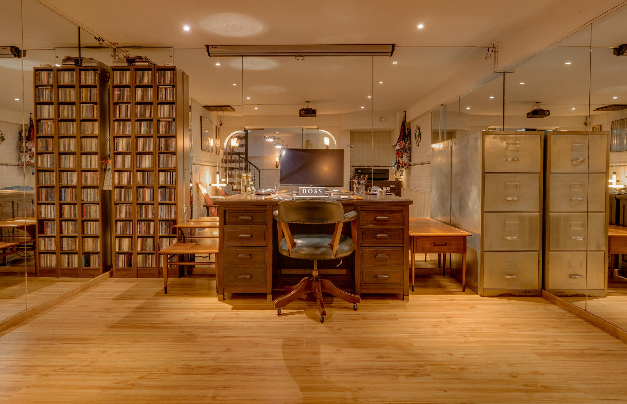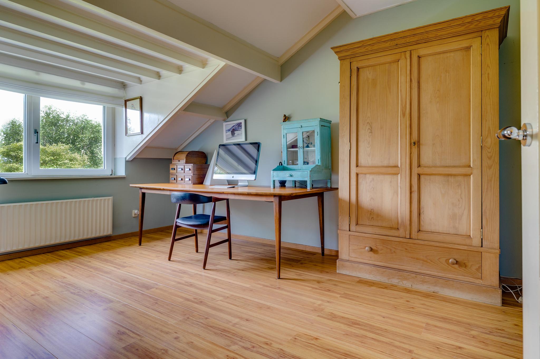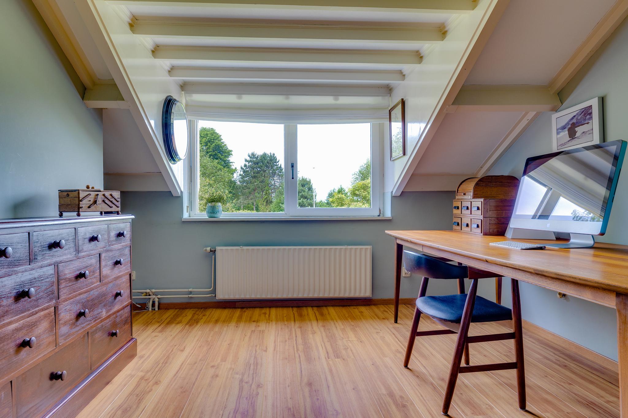 Het kantoor is middels de spa te bereiken, door de spiegelwand is deze ook goed in te richten als bijvoorbeeld een gym aan huis.