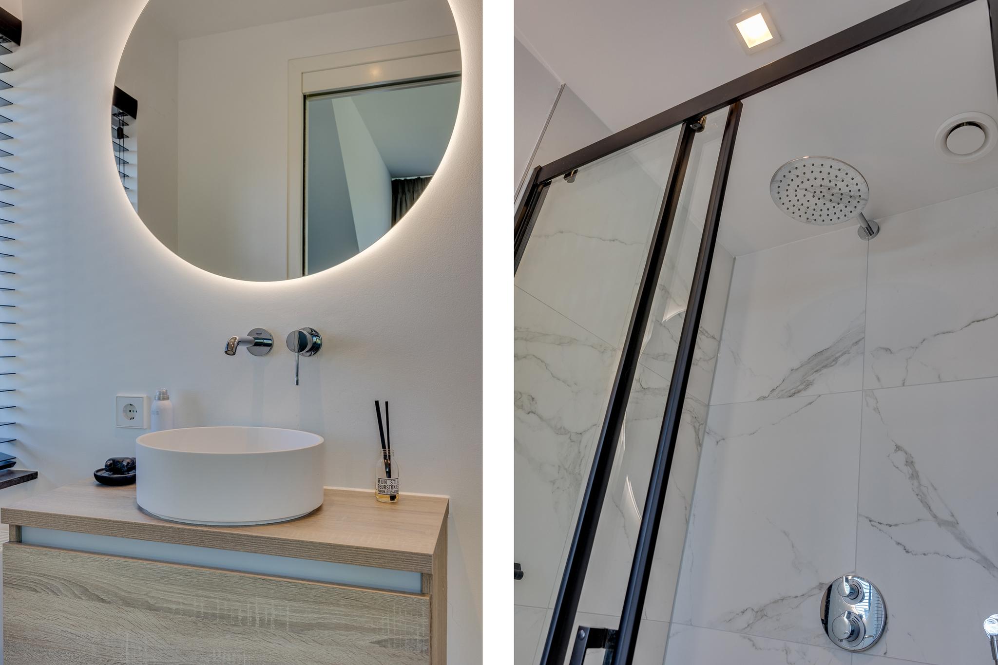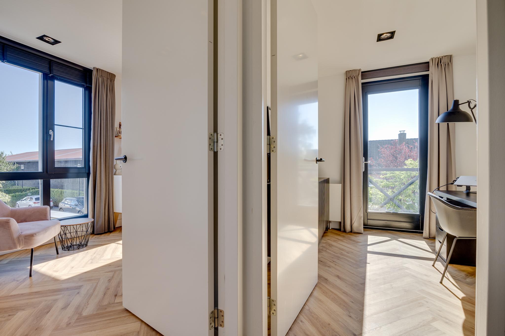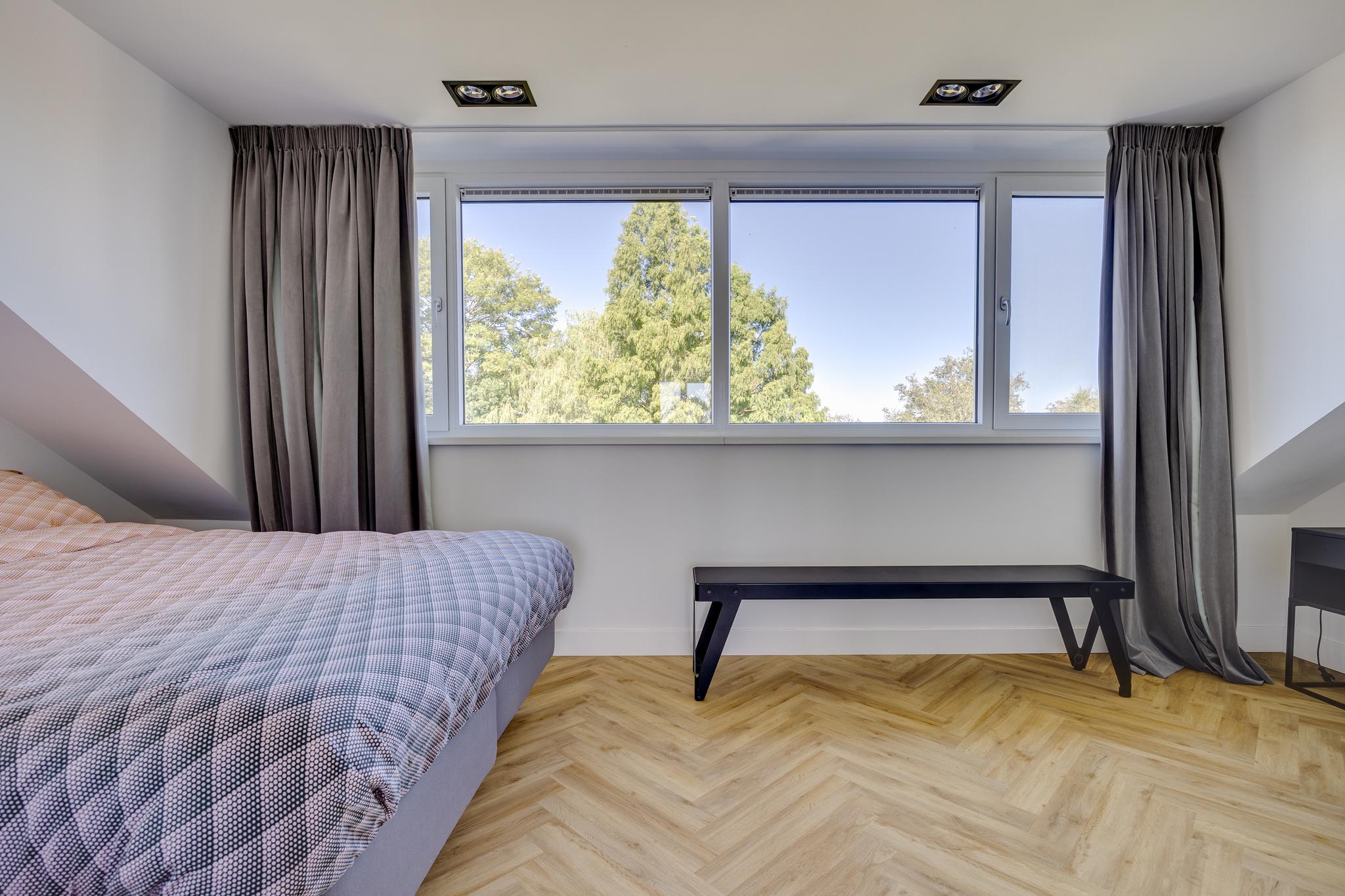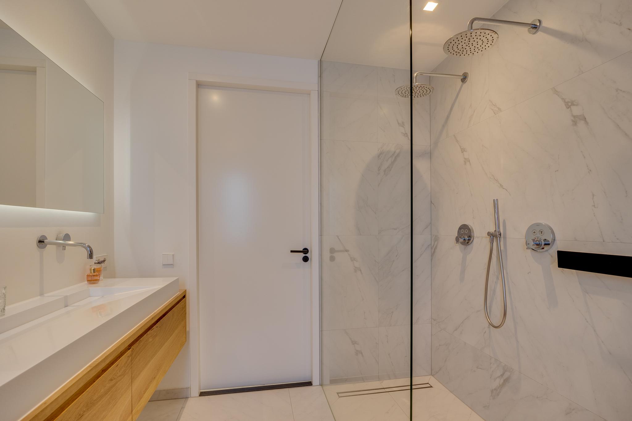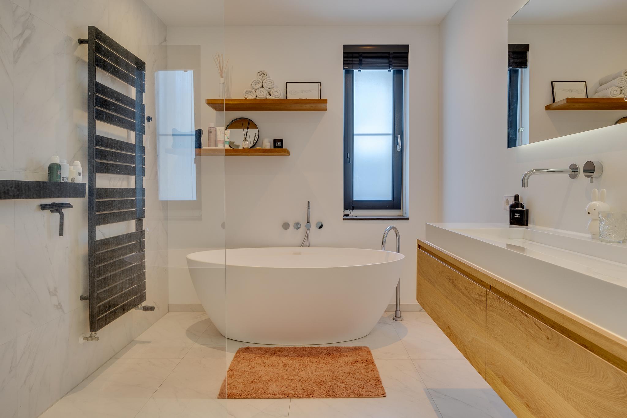There are three bedrooms on the first floor. The master bedroom at the rear and room at the front both have French balcony doors. The luxurious bathroom is equipped with a freestanding bathtub, walk-in shower, double washbasin, underfloor heating and design radiator. There is also a separate toilet.