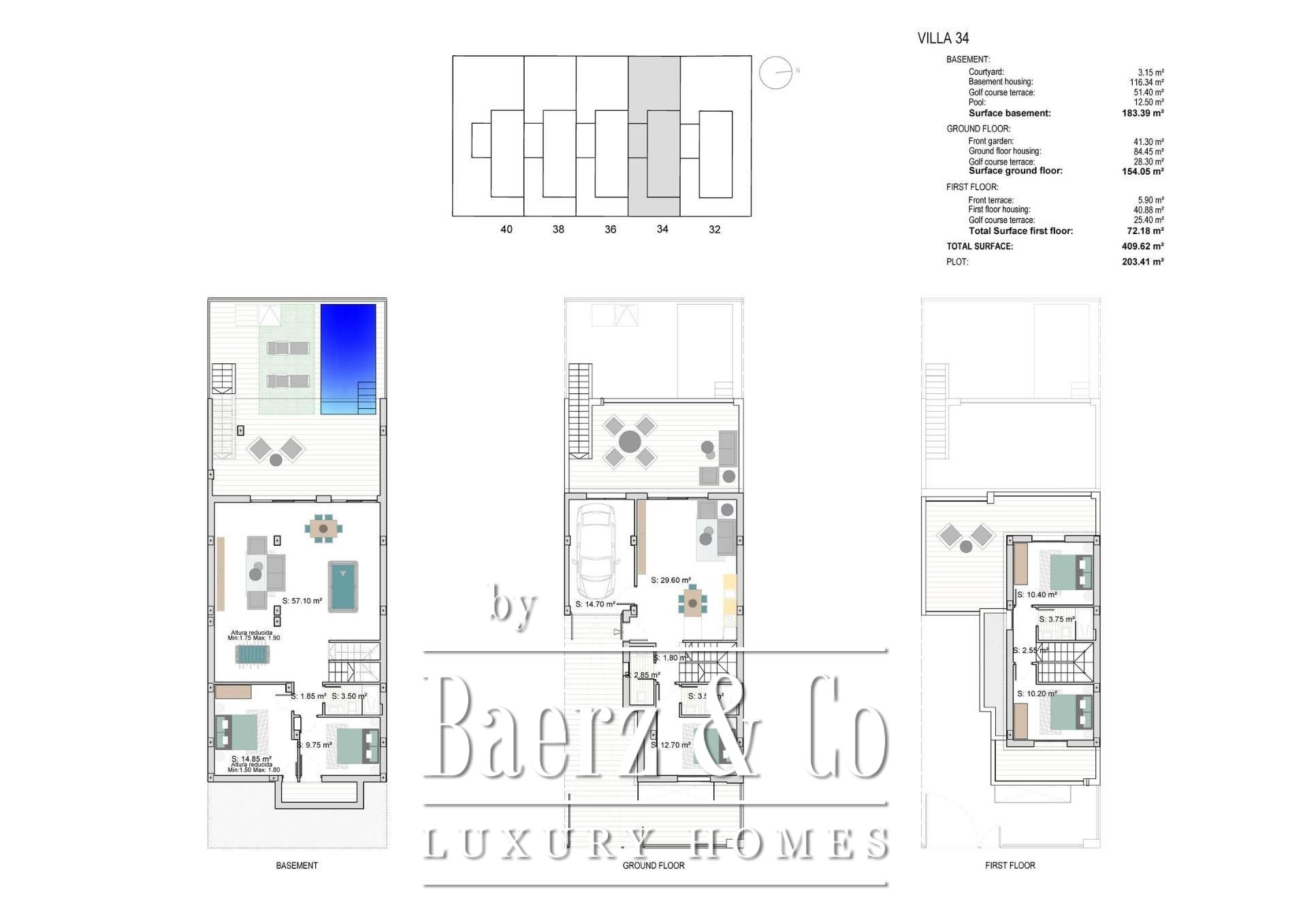The terrace looks onto the golf course, creating a seamless interaction between indoor and outdoor living. A private pool is framed by a landscaped garden, while the 203 m² plot offers privacy and room to breathe. The basement invites flexible use, whether as a private gym, a playroom, or discreet storage. Secure garage parking and air conditioning pre-installation address practical needs with understated care.