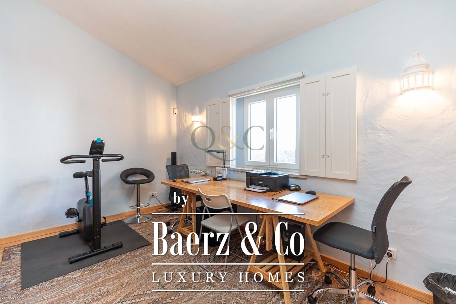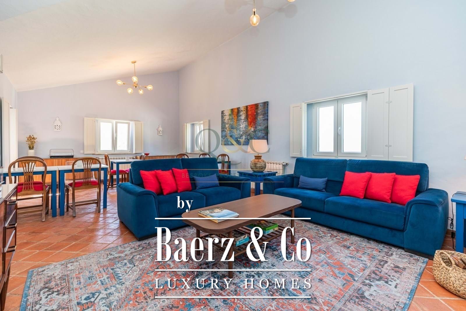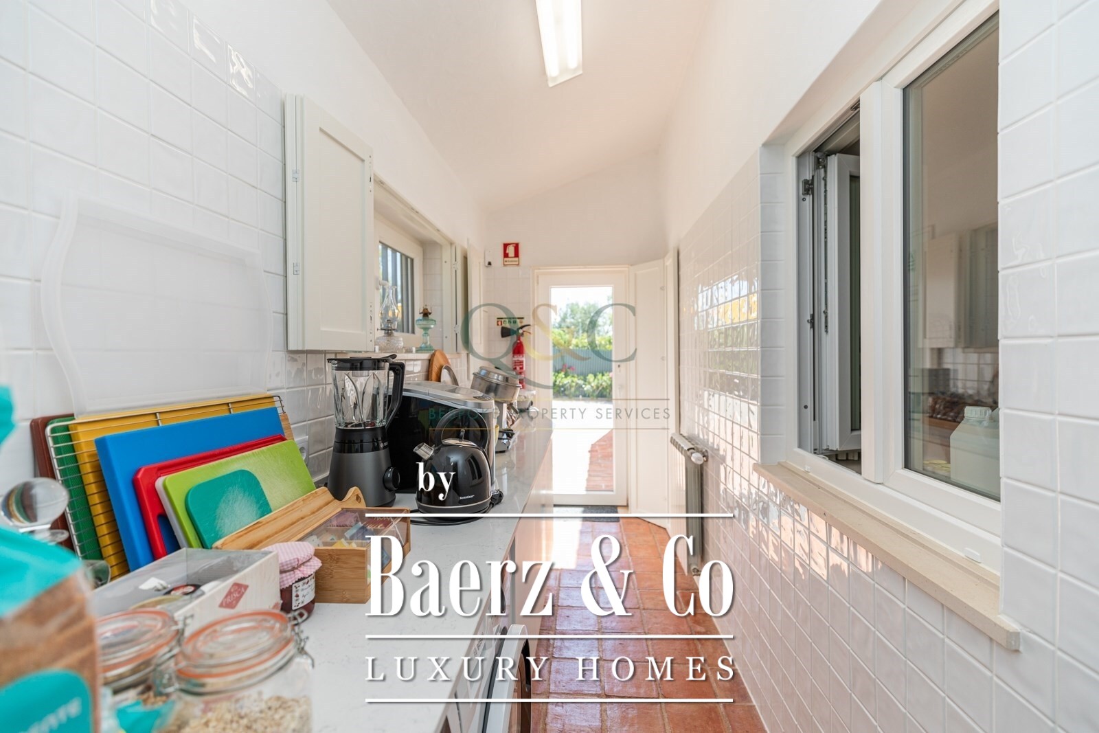 The entrance hall leads to a magnificent and spacious lounge / dining room to the right, featuring Santa Catarina tiled flooring, high ceilings, and a rustic-style fireplace that harmonizes with the rest of the room. Turning left from the entrance hall, a corridor with south-facing windows and direct access to the garden and pool leads to a fully equipped kitchen and laundry room with north-side exterior access and a spacious pantry. At the end of the corridor, there is a guest shower room, one bedroom, another bedroom with an en-suite bathroom, both east-facing with built-in wardrobes. On the south side, there is the master bedroom with very pleasant dimensions, high ceilings, and exterior access. Next, there is a spacious bathroom serving the master bedroom and the fourth bedroom, which is currently used as an office.