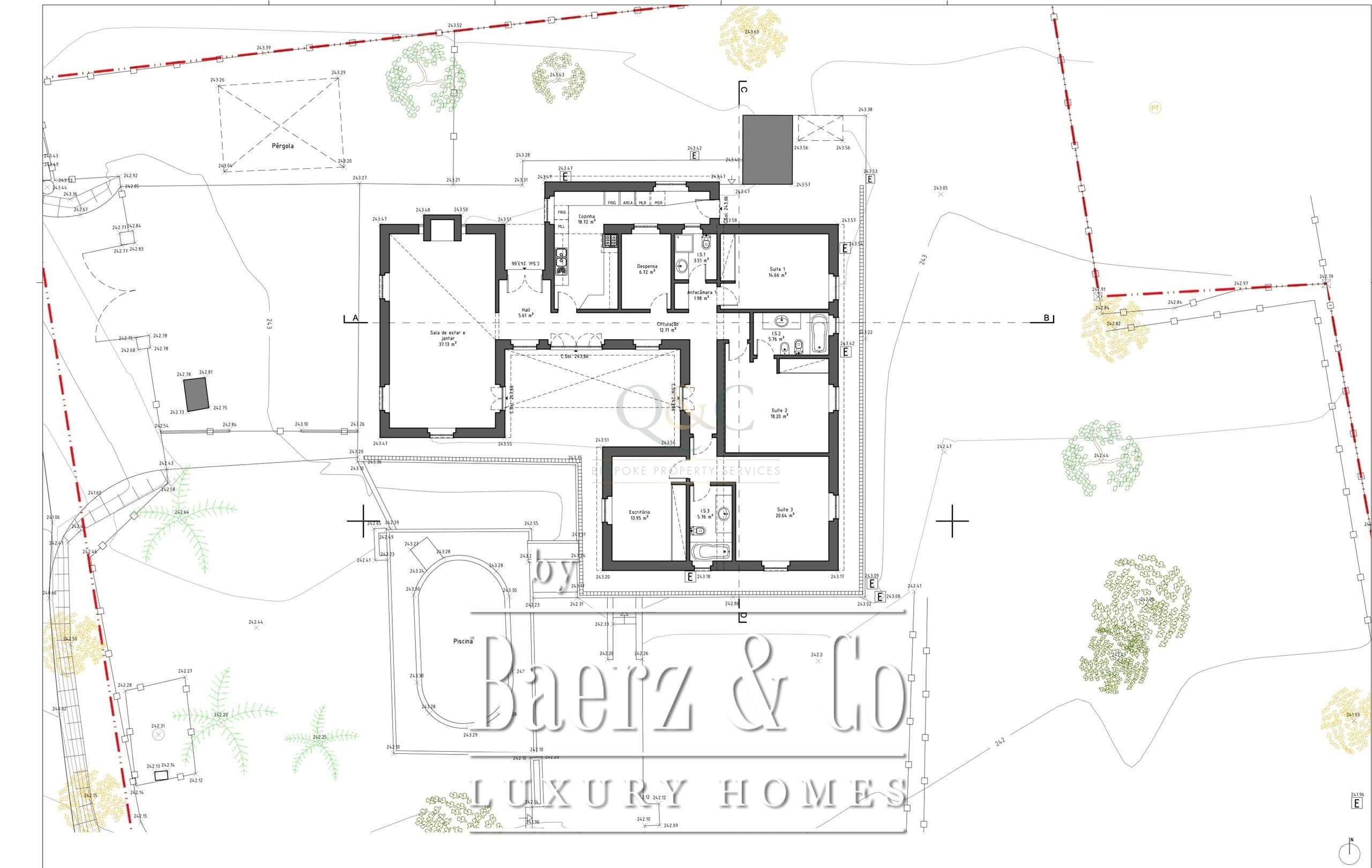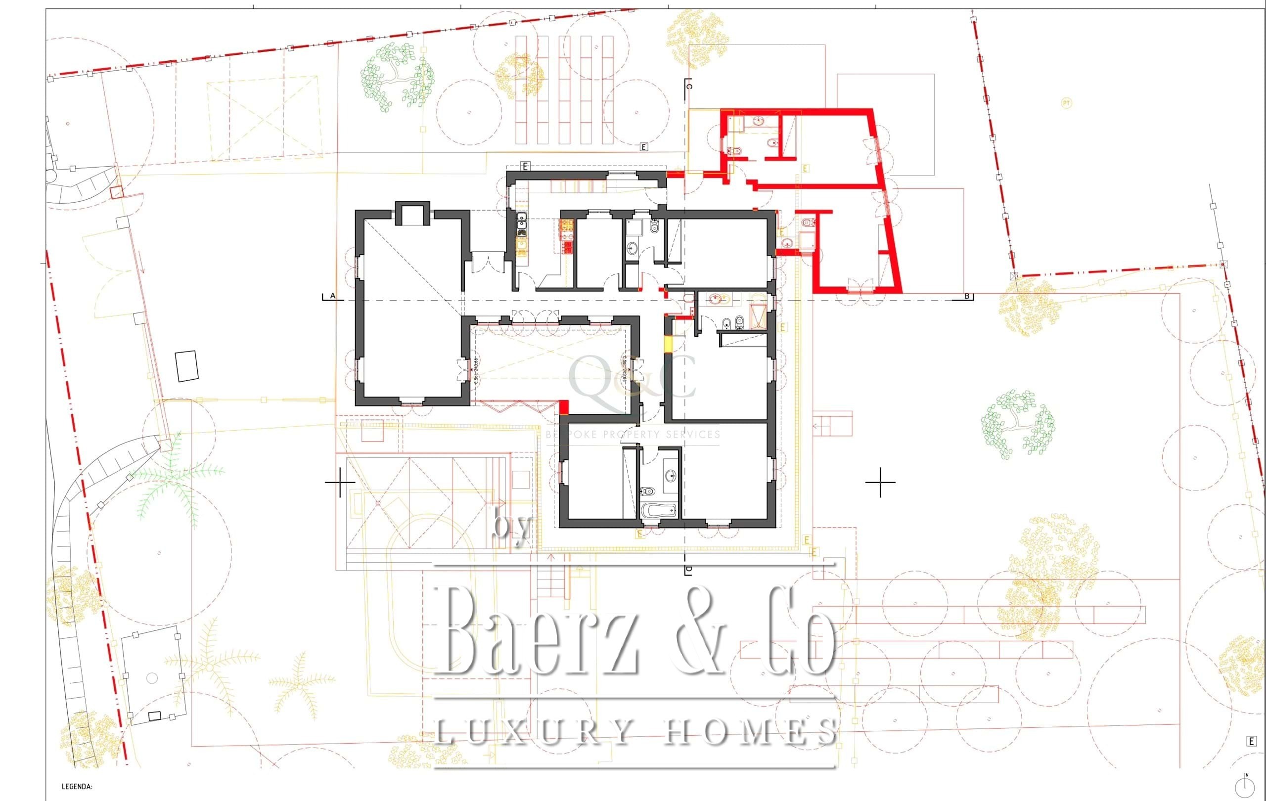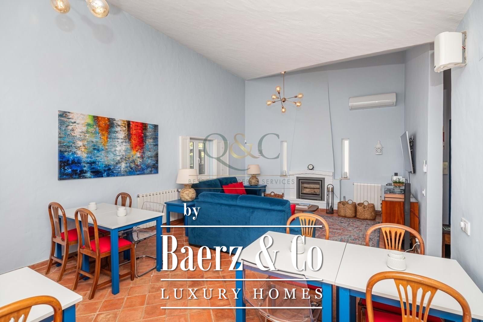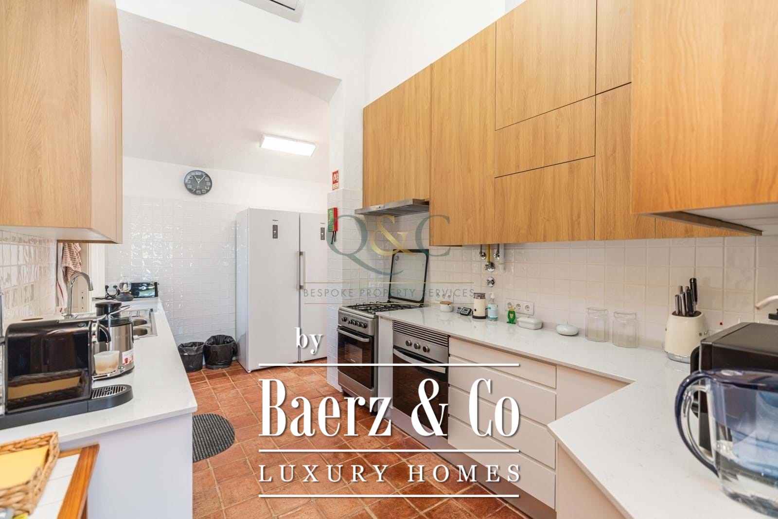 The entrance hall leads to a magnificent and spacious lounge / dining room to the right, featuring Santa Catarina tiled flooring, high ceilings, and a rustic-style fireplace that harmonizes with the rest of the room. Turning left from the entrance hall, a corridor with south-facing windows and direct access to the garden and pool leads to a fully equipped kitchen and laundry room with north-side exterior access and a spacious pantry. At the end of the corridor, there is a guest shower room, one bedroom, another bedroom with an en-suite bathroom, both east-facing with built-in wardrobes. On the south side, there is the master bedroom with very pleasant dimensions, high ceilings, and exterior access. Next, there is a spacious bathroom serving the master bedroom and the fourth bedroom, which is currently used as an office.