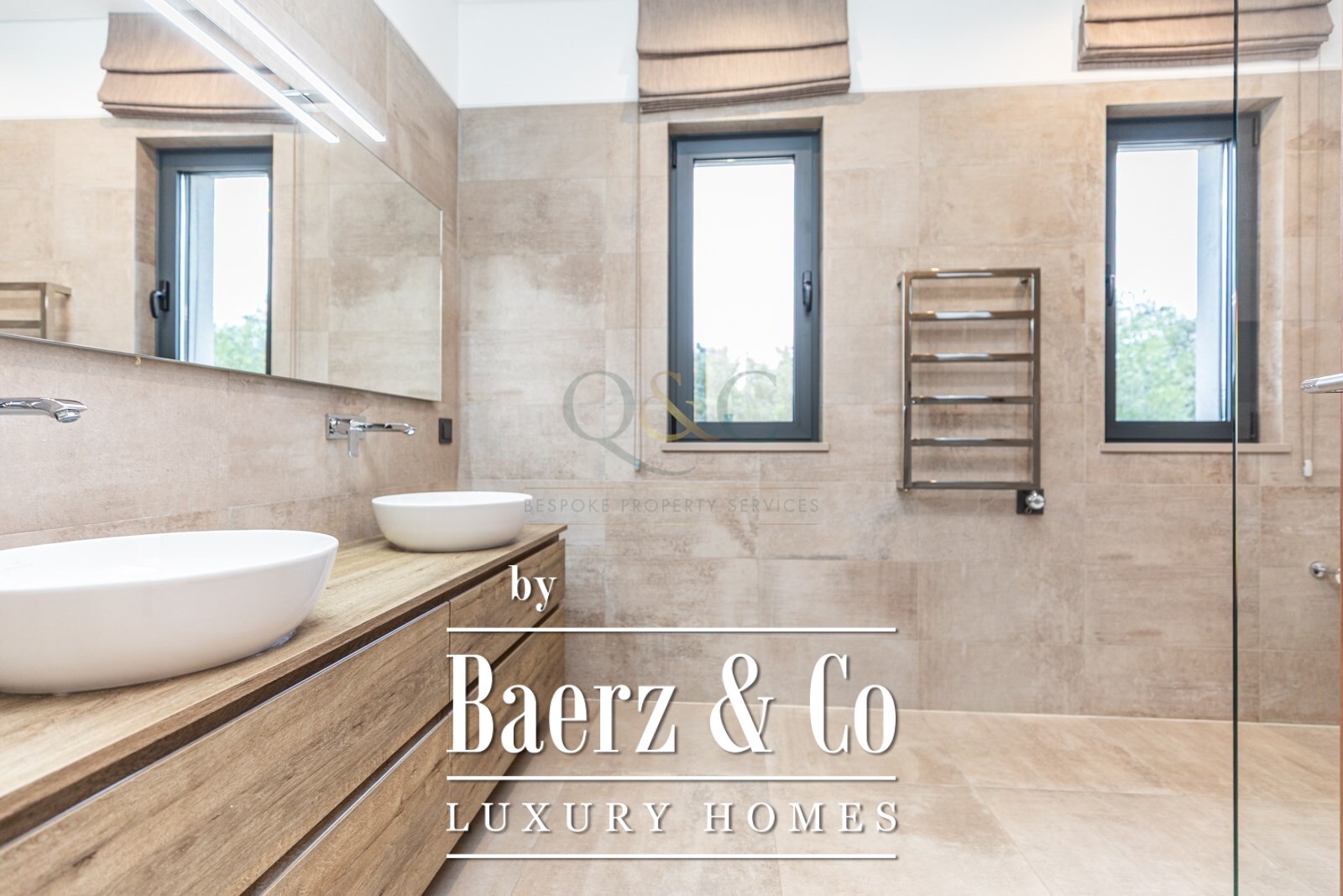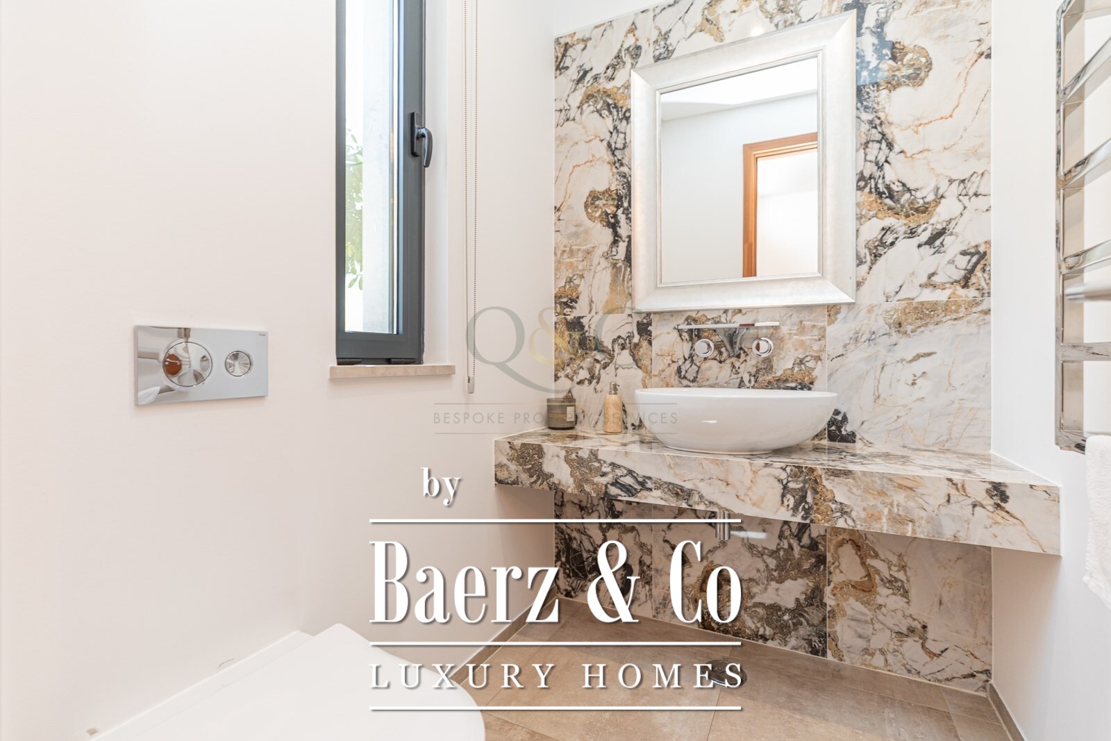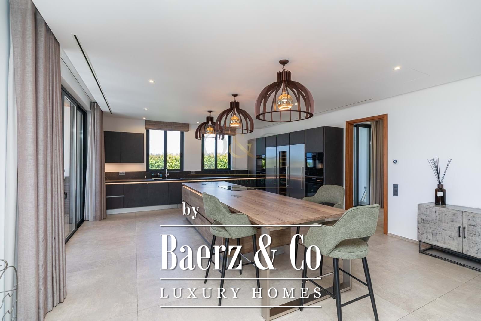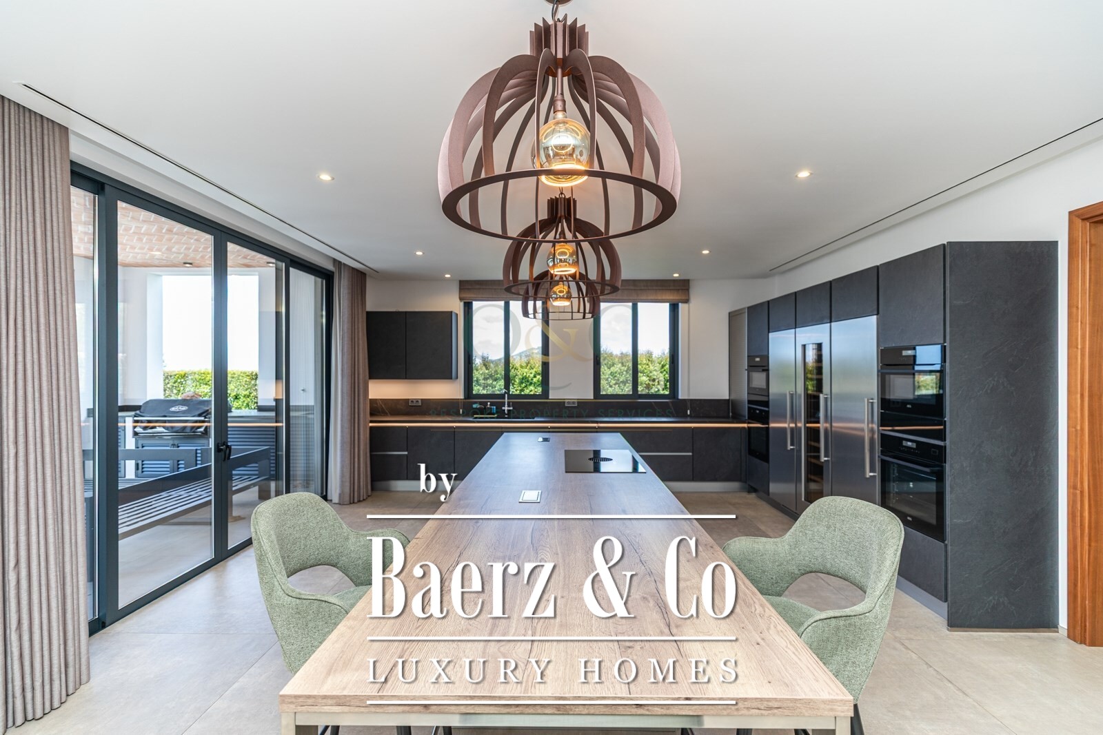 Step through impressive double wooden doors into a grand entrance hall that sets the tone for the entire home. On the ground floor, you'll find a spacious guest suite with private terrace access, a stylish cloakroom, and direct entry to the double garage. The heart of the villa is the expansive open-plan living area, featuring a state-of-the-art kitchen equipped to the highest standards, complete with a multifunctional island and breakfast bar. The dining and living areas are bathed in natural light through full-height glass doors that open onto a covered terrace with BBQ area, manicured gardens, and a stunning saltwater swimming pool pre-installed for heating and designed for both relaxation and entertainment.